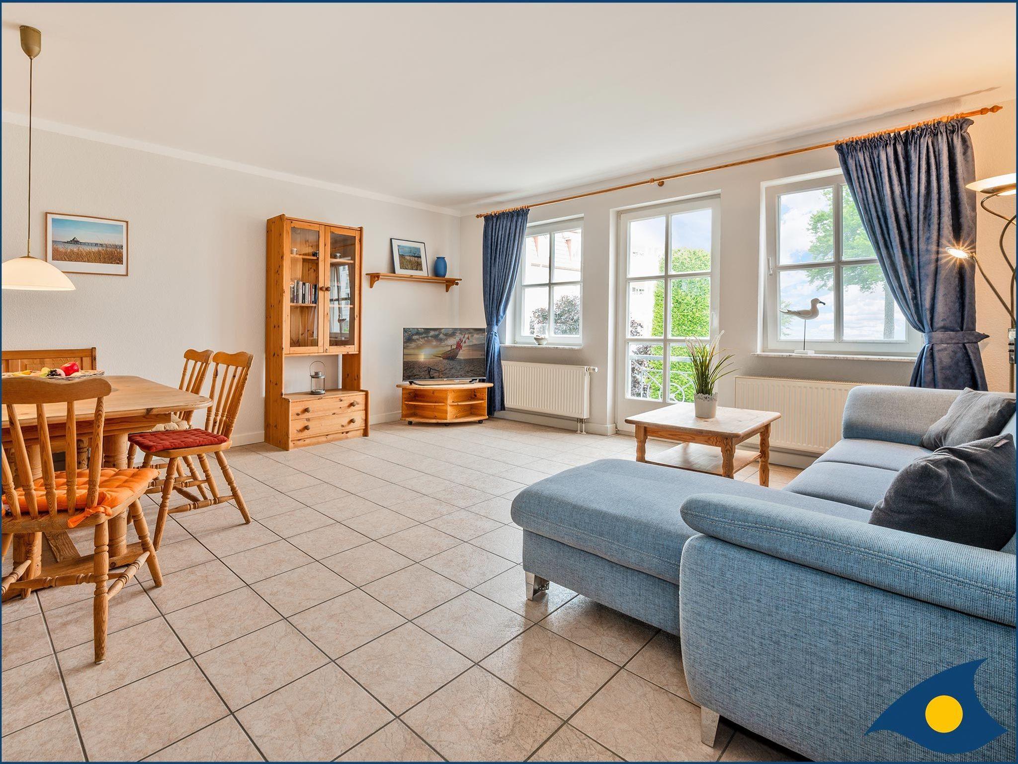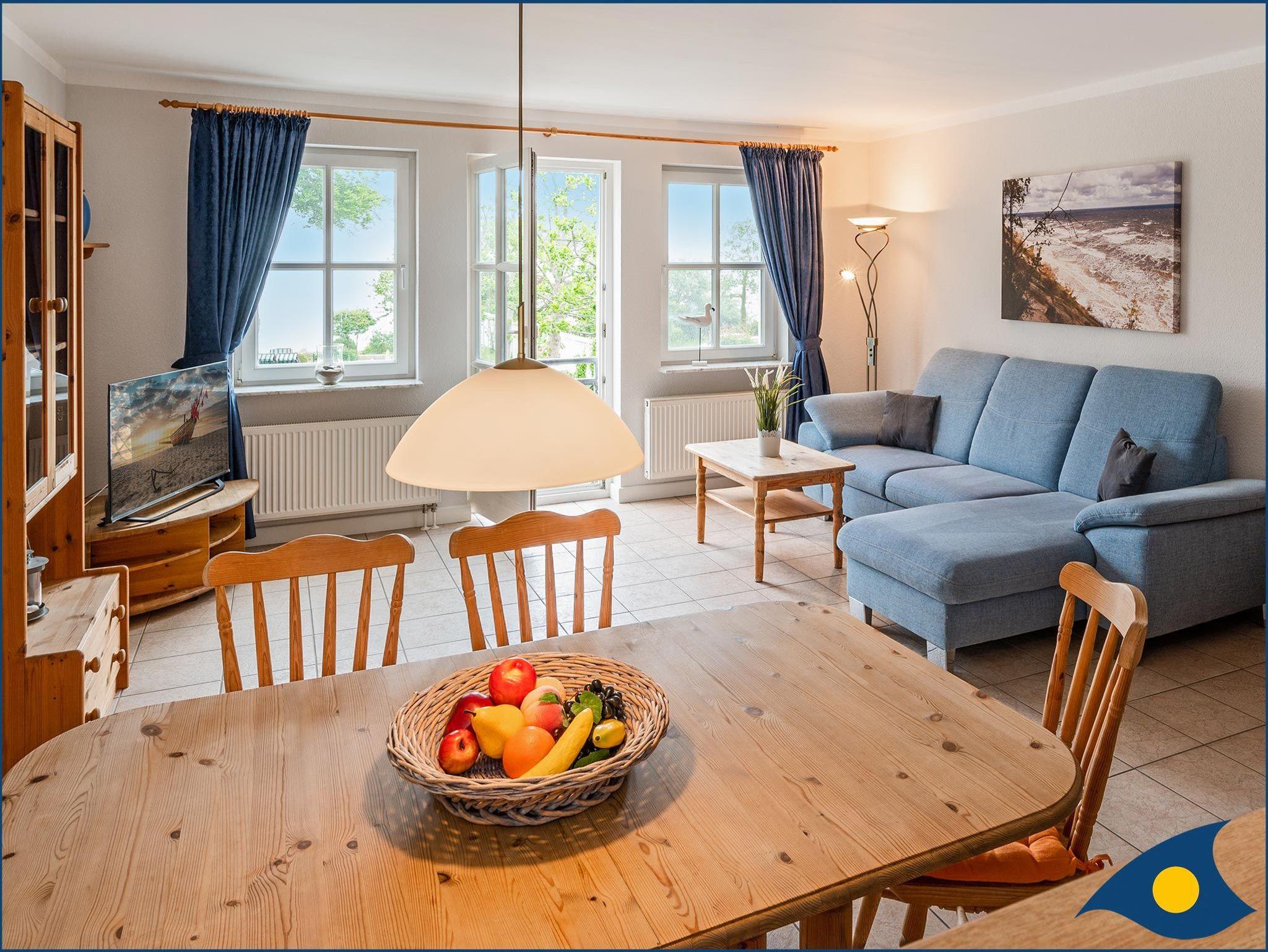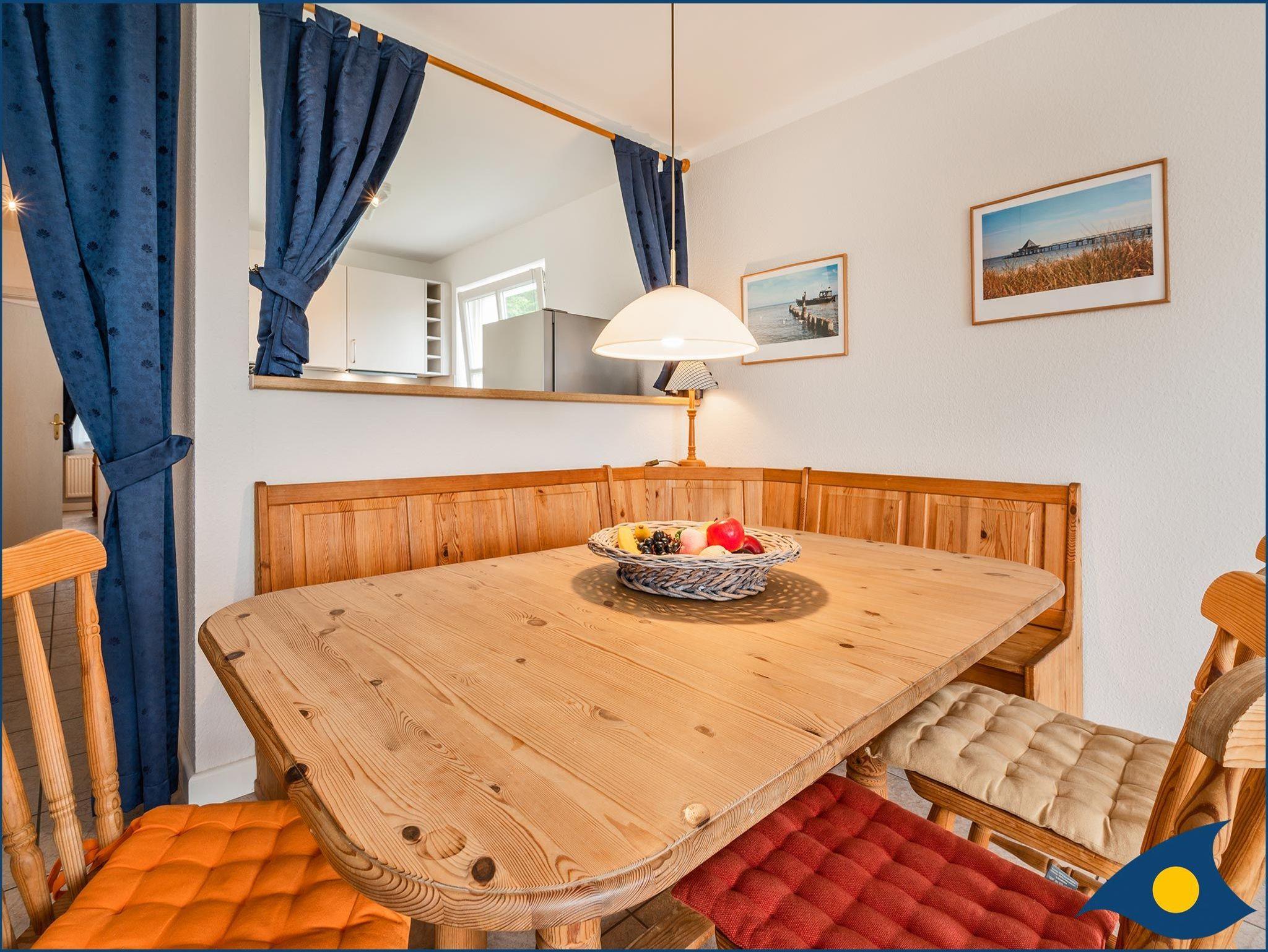 Auf 56 m² Wohnfläche erwartet Sie ein großzügiger und heller Wohnraum. Das bequeme Ecksofa lädt zu gemütlichen Fernsehabende oder einem Mittagsschläfchen inkl. Meeresrauschen ein. Die Essgruppe, bestehend aus Bänken, Tisch und Stühlen bietet genügend Platz für ein gemeinsames Abendbrot mit Freunden. In der separaten Küche mit einer Durchreiche zum Wohnzimmer bereiten Sie das morgendliche Frühstück zu oder kochen Ihr Lieblingsessen.