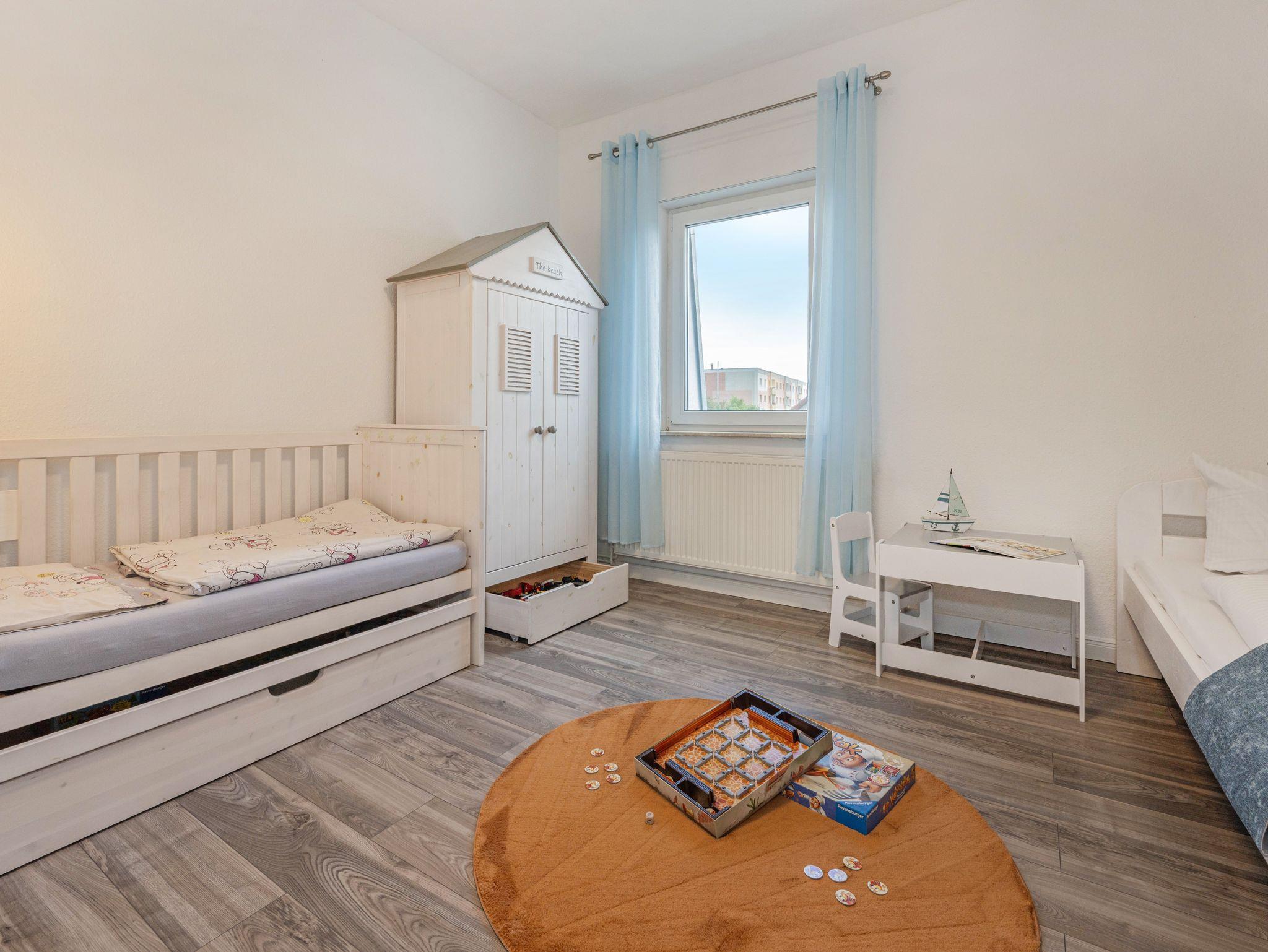 Ein zentraler Flur verbindet die drei Zimmer und das Badezimmer. Die Wohnung bietet Platz für bis zu vier Personen mit Kleinkind und verfügt über ein Schlafzimmer für die Eltern mit einem 180 x 200 cm großen Polsterbett und eigenem TV sowie ein separates Kinderzimmer mit zwei 90 x 200 cm großen Einzelbetten, sowie einer Spielecke mit Kinderküche, einem Spieltischmit LEGO sowie Büchern für Groß und Klein. Für kleinere Kinder stehen ein Kinderbett, ein Kinderstuhl und kindgerechte Ausstattung zur Verfügung.