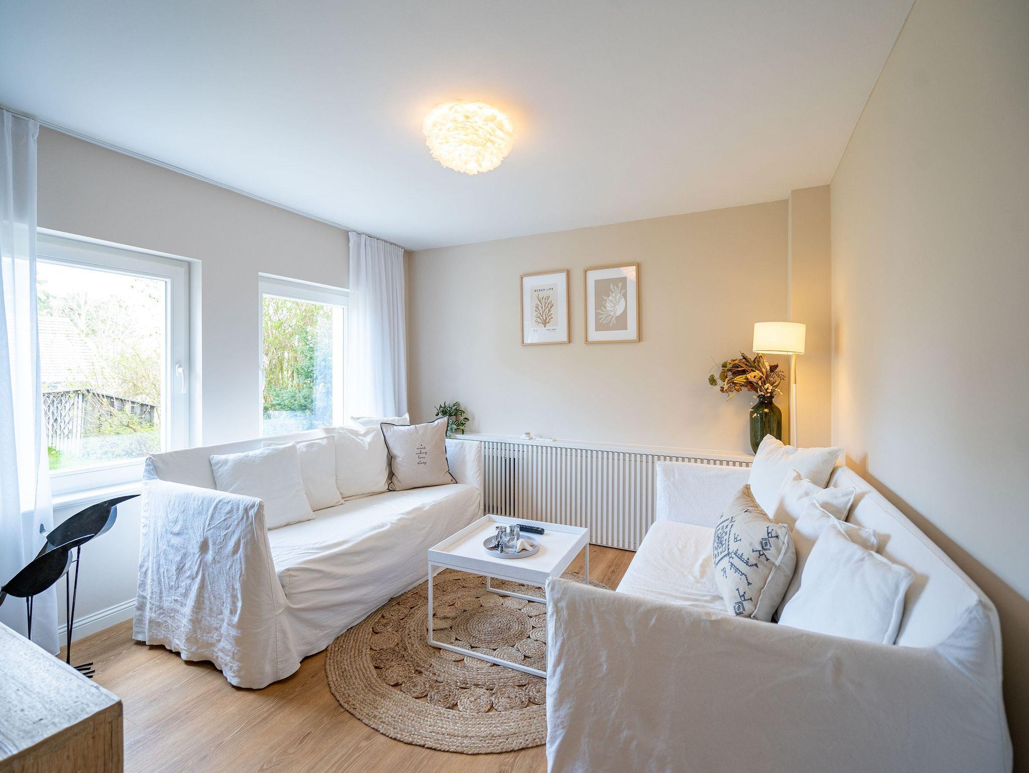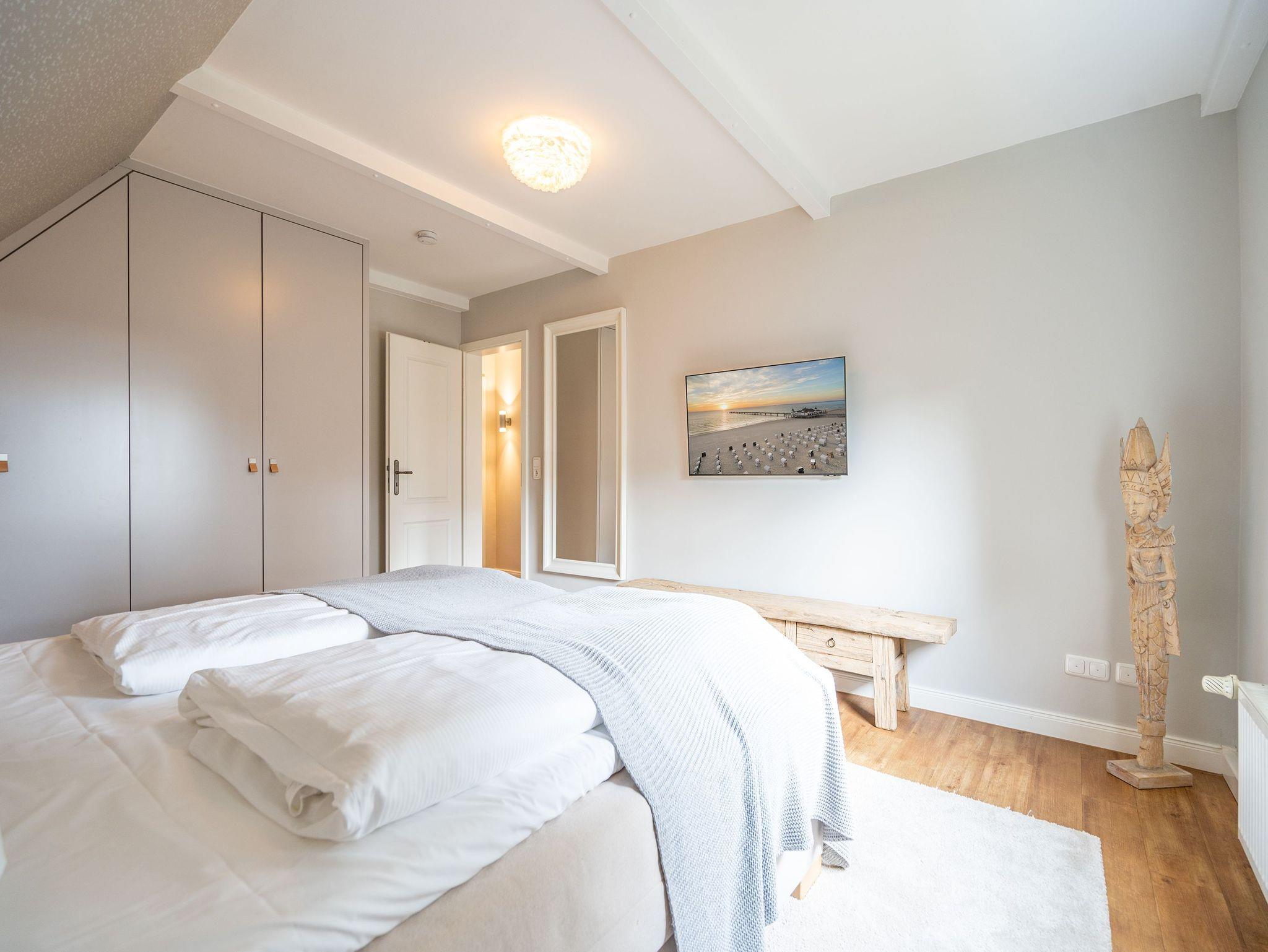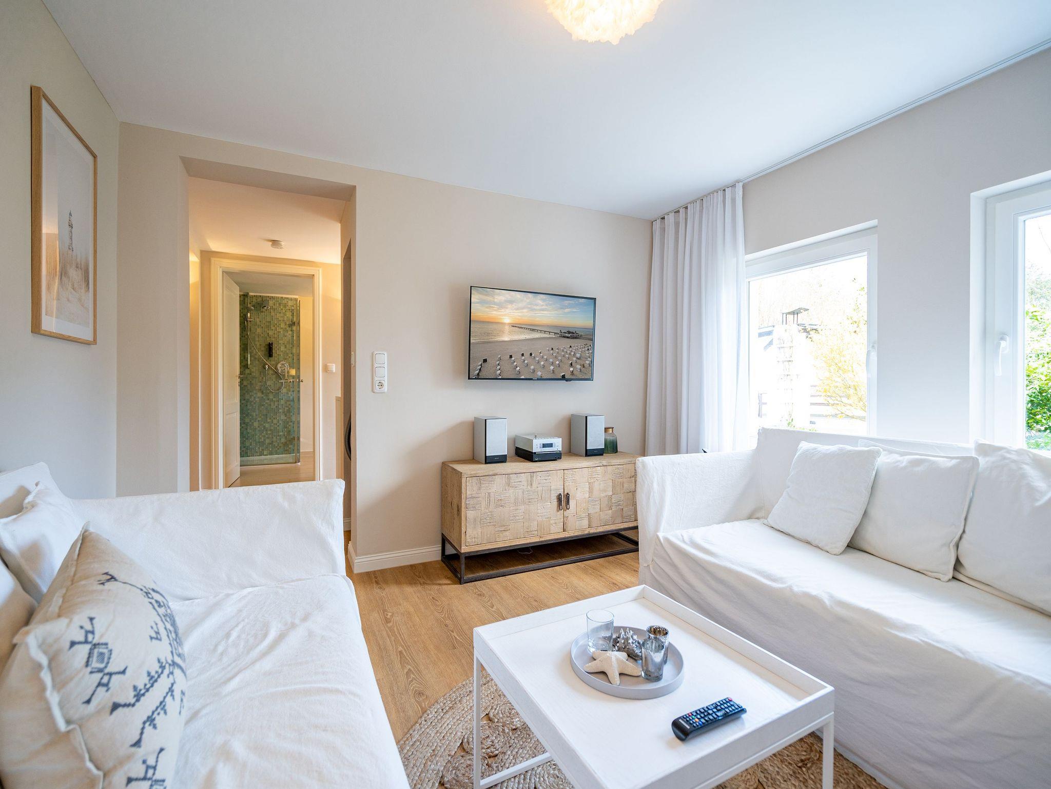 Von einer Innenarchitektin gestaltet und zentral, aber dennoch ruhig gelegen, offeriert Ihnen das Ferienhaus einen zeitlos-eleganten Wohnkomfort auf drei Ebenen. Modern und gekonnt eingerichtet, mit sehr viel Liebe zum Detail dekoriert, bietet es Platz für den Urlaub zu zweit, mit Freunden oder in Familie (max. 8 Personen und 2 Kleinkinder bis 3 Jahre). Im Erdgeschoss des Hauses finden Sie den großzügigen Wohnbereich mit bequemer Sitzgruppe, Flat-TV und Holzofenkamin. Auf der angrenzenden Südterrasse mit Strandkorb und Gartenmöbeln lässt es sich gemütlich bis in die Abendstunden hinein relaxen. Weiterhin befinden sich auf dieser Etage eine neue, sehr gut ausgestattete Küche, ein Esszimmer, eine gemütliche Leseecke und ein Gäste-WC. Im Obergeschoss bieten die 3 Schlafzimmer mit hochwertigen Boxspringbetten (1,80m x 2,00m und Flat-TV und 1 x 1,60m x 2,00m ) eine großzügige Schlafraumsituation, die durch ein Bad mit Dusche, WC und kleiner Badewanne ergänzt wird.