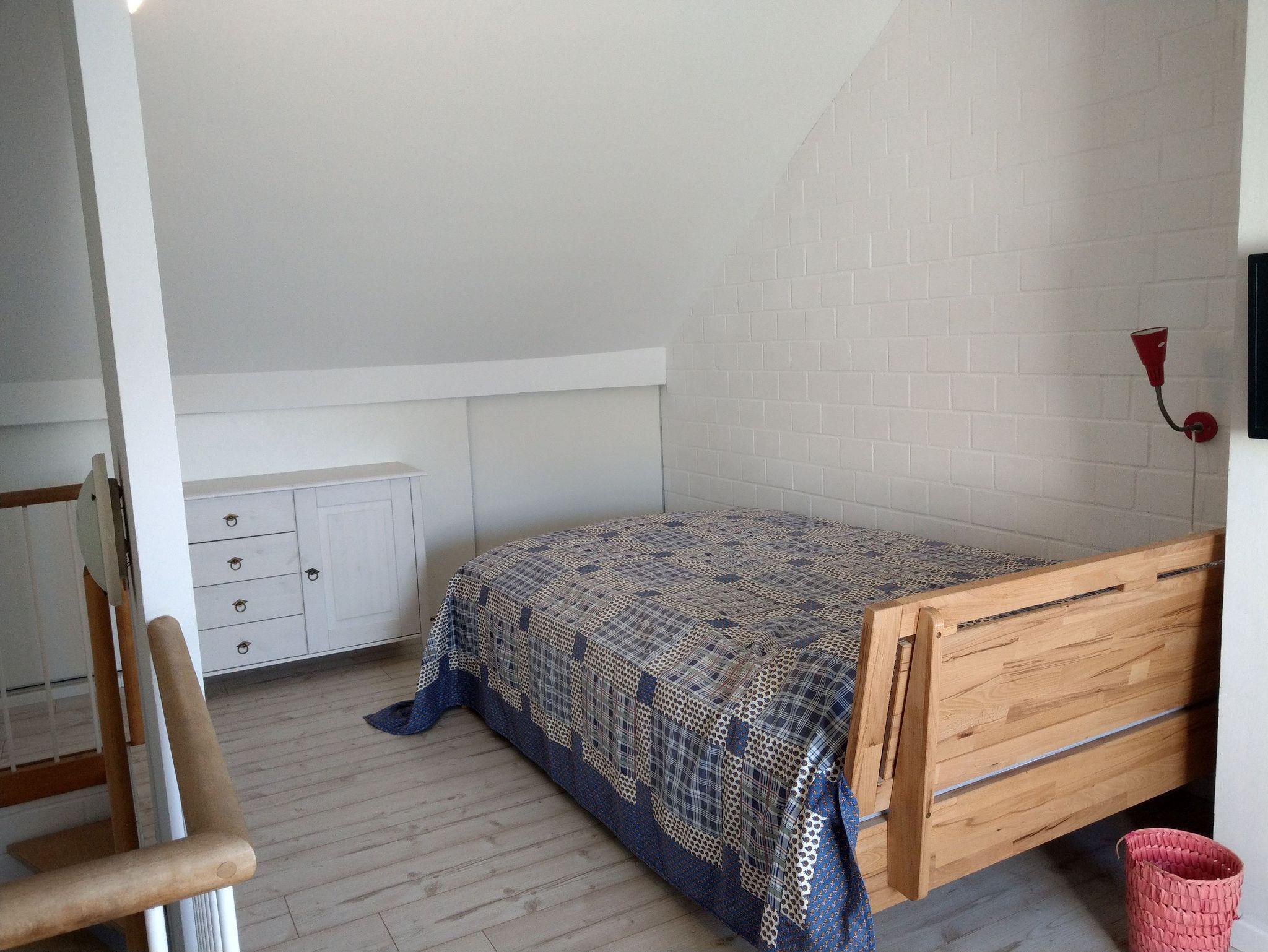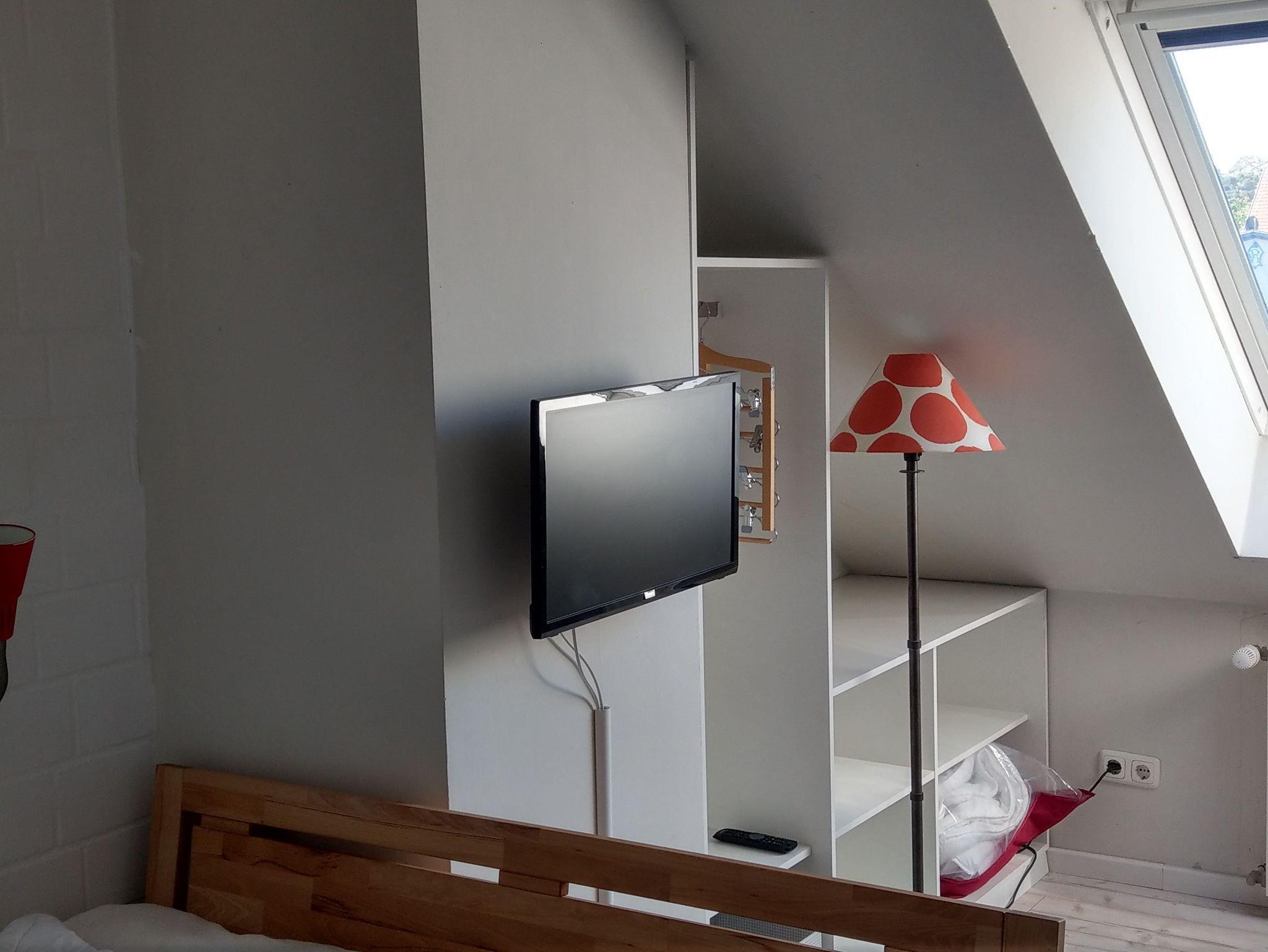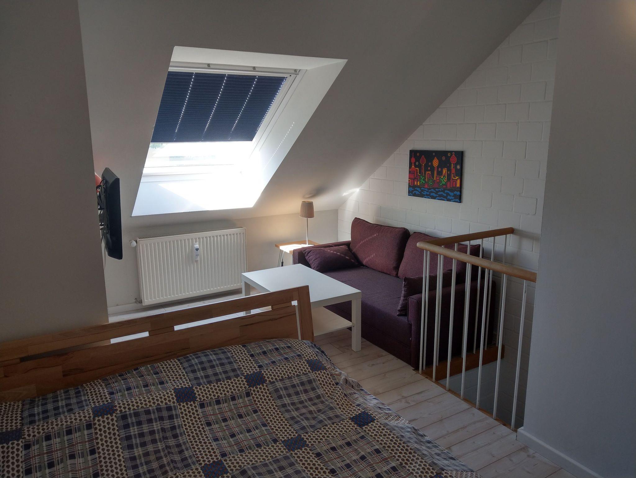 Im Dachgeschoss gibt es ein Doppelbett (1,40 m), einen Schrank, eine Couch und einen weiteren Fernseher.