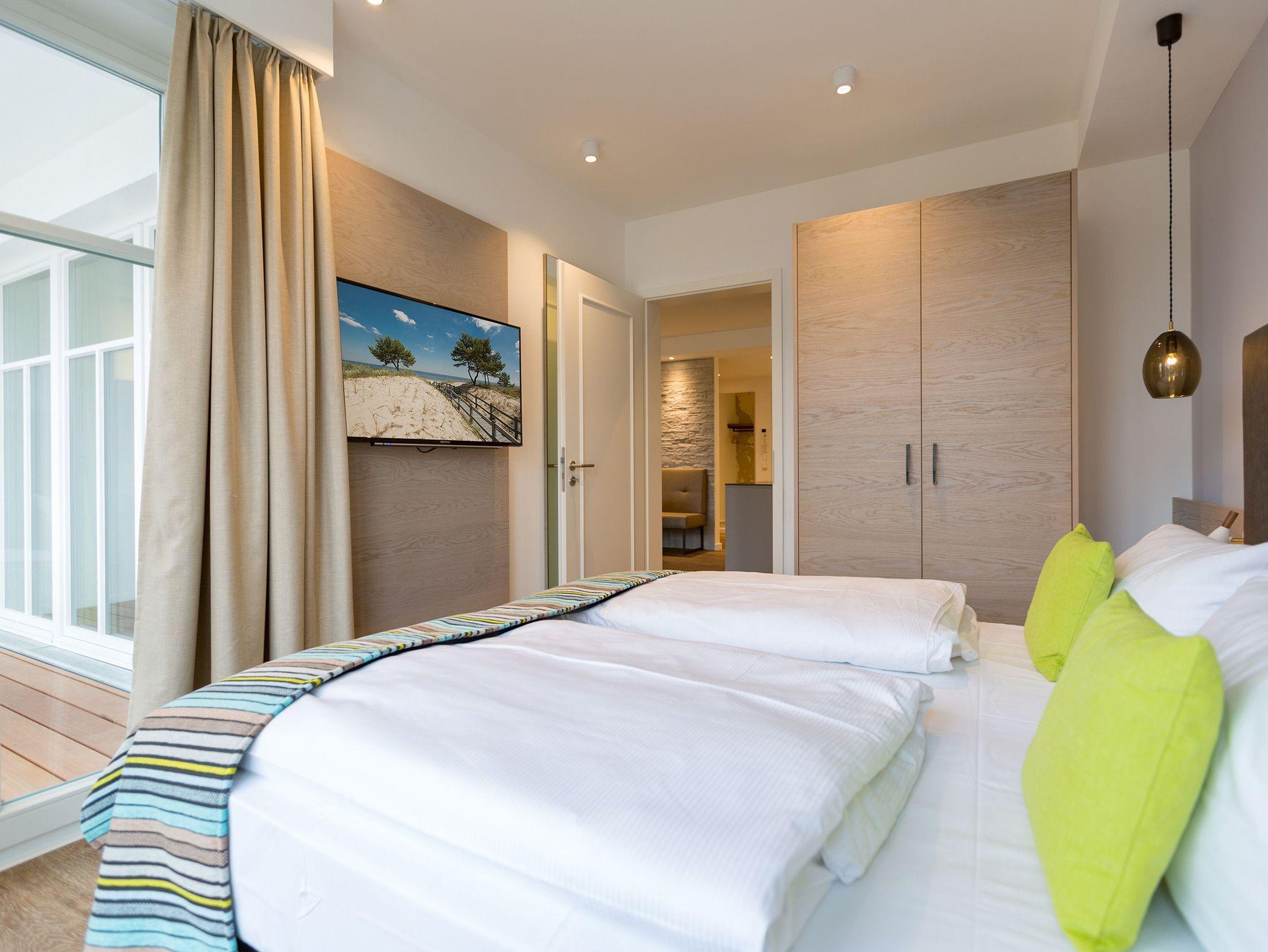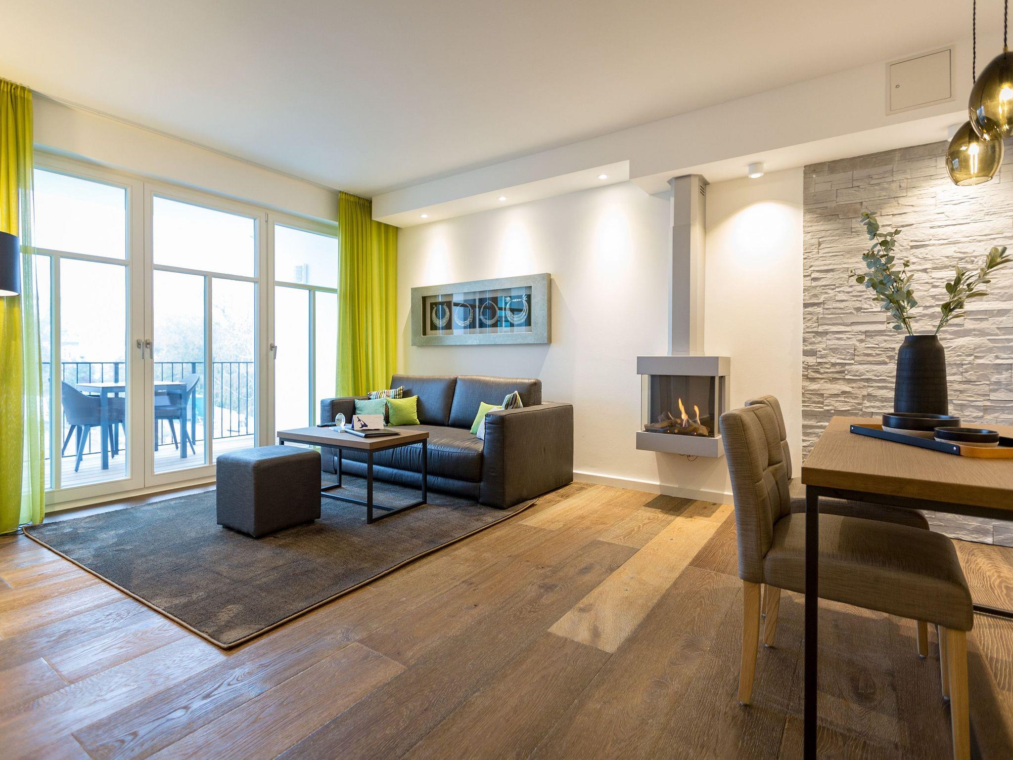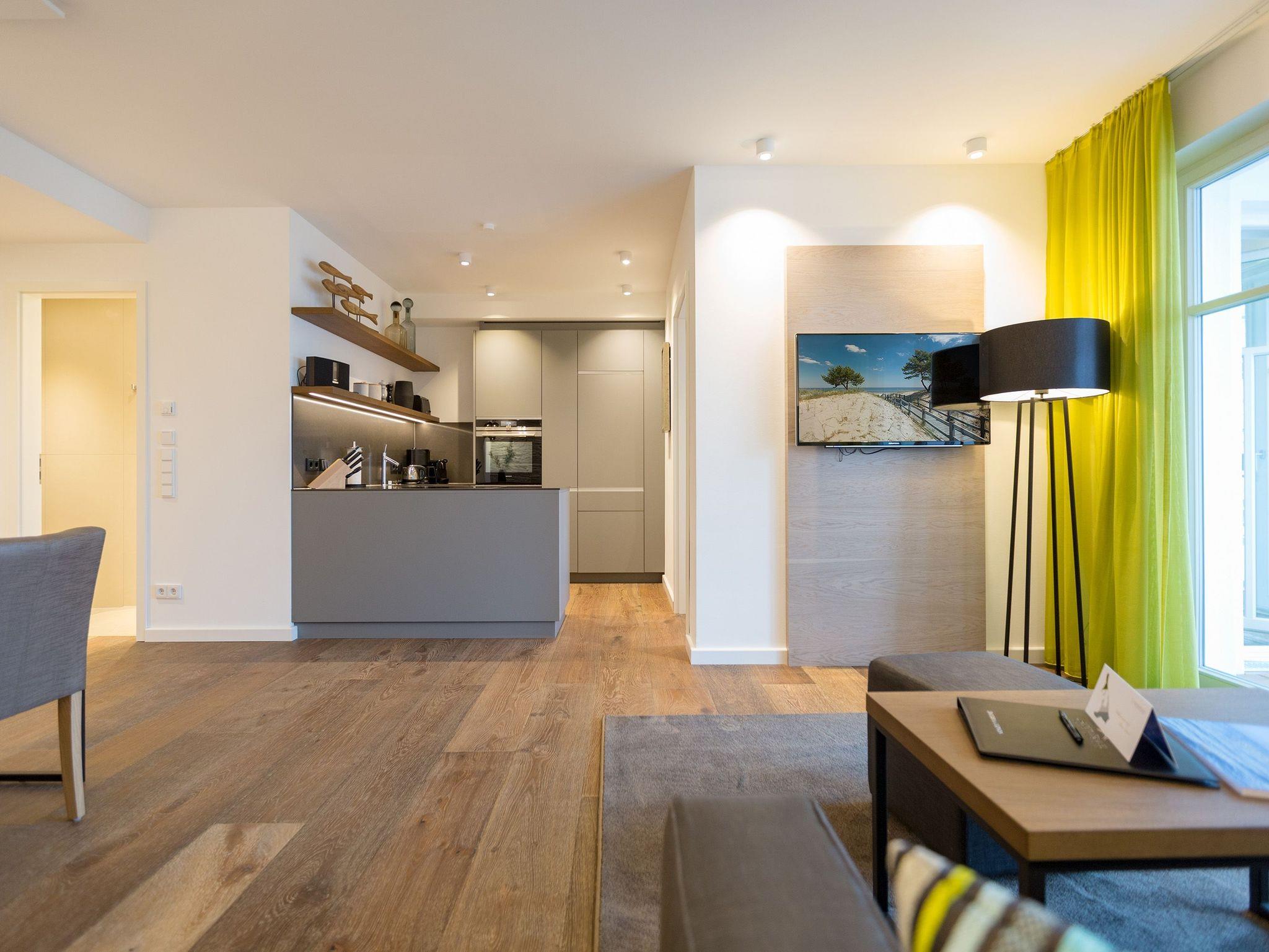 Dem Ostsee-Rauschen ganz nah sind Sie in diesem 53 Quadratmeter großen Urlaubsparadies im 2. Stock des Beachhouses. Ideal für zwei Personen bietet das Zwei-Raum-Appartement Wohnkomfort der Extra-Klasse. Ankommen, loslassen und wohlfühlen ? in diesem stylischen Feriendomizil wird Ihnen das bei solch einem eleganten und harmonischen Ambiente sicher leicht fallen. Das gesamte Raumkonzept wurde von einem der renommiertesten Innenarchitekturbüros Deutschlands entworfen. Naturmaterialien und warme Farben sorgen dafür, dass Sie sich vom ersten Augenblick an wohlfühlen. Das geräumige Wohn-Esszimmer ist mit allem eingerichtet, was Sie zum Entspannen sich erträumen. Ein Gas-Kamin spendet wohlige Wärme an ungemütlichen Tagen. Ansonsten reißen Sie doch einfach die bodentiefen Fenster zum Balkon (7 Quadratmeter groß) auf und lassen die frische Ostseeluft hinein. Genießen Sie auf den gemütlichen Balkon-Möbeln oder auf dem bequemen Sofa im Wohnzimmer Ihre Auszeit. Hier wie auch im Schlafzimmer befindet sich ein großer Flat-TV. Eine Bose-Anlage mit Bluetooth spielt Ihre Lieblingsmusik in satten Tönen. Das WLAN ist kostenfrei. Entspannen kann so schön sein! Kommt der Appetit, können Sie sich in der offenen und voll ausgestatteten Küche nach Herzenslust bekochen. Es ist alles da. Herd, Backofen, Mikrowelle, Geschirrspülmaschine, Kaffee-Automat, Kühlschrank mit Gefrierfach stammen von namhaften Markenherstellern. In den Schränken finden Sie edles Porzellan-Geschirr. Ihre Mahlzeiten können Sie am schönen Esstisch mit zwei Stühlen und einer bequemen Bank zu sich nehmen. Auch das Schlafzimmer hat Zugang zum Nord-West-Balkon. So dass die Wellen Sie mit sanftem Rauschen in den Schlaf bringen. Der wird garantiert ebenso erholsam wie der gesamte Urlaub. Denn in dem komfortablen Boxspringdoppelbett (1,80 m x 2,00 m) schlafen Sie so himmlisch wie auf Wolke 7. Ein geräumiger Schrank bietet ausreichend Ablagefläche. Im Badezimmer erwartet Sie ein kleines Highlight: Eine Finnische Sauna lädt Sie zu kuschelig warmen Auszeit-Momenten ein, wenn das Wetter einmal nicht nach draußen an den Strand lockt. Daneben ist das Bad mit Regendusche, Waschtisch und WC ausgestattet. Ein kleiner, separater Abstellraum beherbergt einen Waschtrockner. Rundum sorglos soll Ihr Urlaub in diesem Appartement sein. Darum sind die Betten bei Ankunft bereits bezogen und Handtücher liegen bereit. In der modernen Tiefgarage ist für Sie der Stellplatz Nr. 18 im Doppelparker unten (max. Höhe 1,85 m, max. Länge 5,10 m, max. Breite 2,50 m, max. Last 2.600 kg) reserviert.