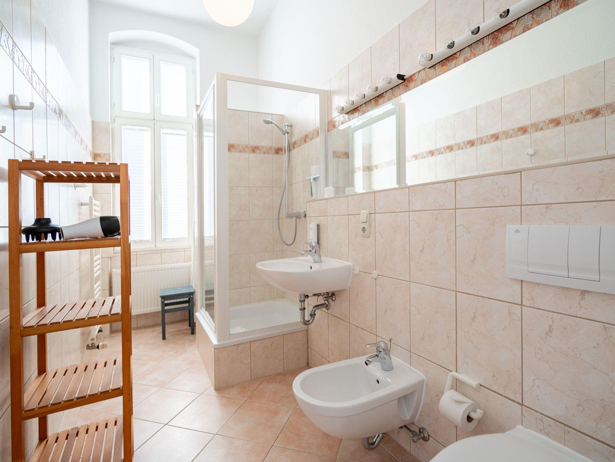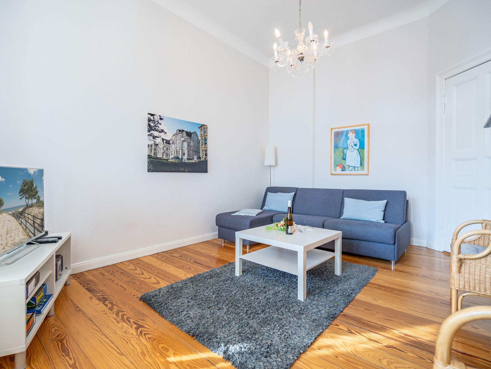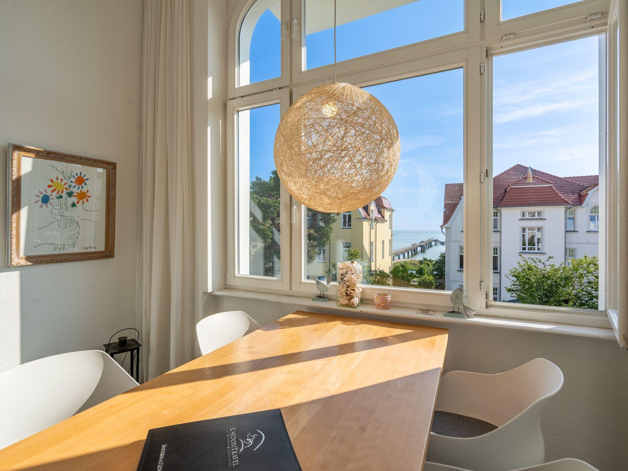 Das Meer zum Greifen nahe, erwartet Sie eine einladendes 2-Raum-Ferienwohnung (62 qm) im 1. Obergeschoss der Villa. 4 Personen finden hier in den hellen, freundlichen Räumen Platz zum Wohlfühlen. Der Wohnbereich ist mit einer bequemen Sitzgruppe (dient als Aufbettungsmöglichkeit für die 3. und 4. Person), Flat-TV und Blue-Ray-DVD-Spieler ausgestattet. Die lichtdurchflutete, verglaste Veranda mit Essplatz wird sicher schnell zu Ihrem Lieblingsplatz, von hier hat man (durch die Villen in der 1. Reihe) einen schönen Blick auf die Ostsee. Im großzügigen Schlafzimmer verspricht das moderne Boxspringbett angenehmen Schlafkomfort. Die separate und komplett ausgestattete Küche mit kleinem Essplatz und das Bad mit Dusche, WC und Bidet ergänzen die Wohnung. Ein Pkw-Stellplatz (Nr.7) befindet sich am Haus. Das WLAN-Netz ist kostenfrei verfügbar. Für Ihren Komfort sind die Betten bei der Anreise bezogen und Handtücher liegen bereit. Auf Wunsch stellen wir für unsere kleinen Gäste ein Kinderreisebett und einen Kinderhochstuhl ( gegen einen Aufpreis) zur Verfügung.