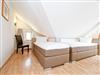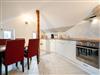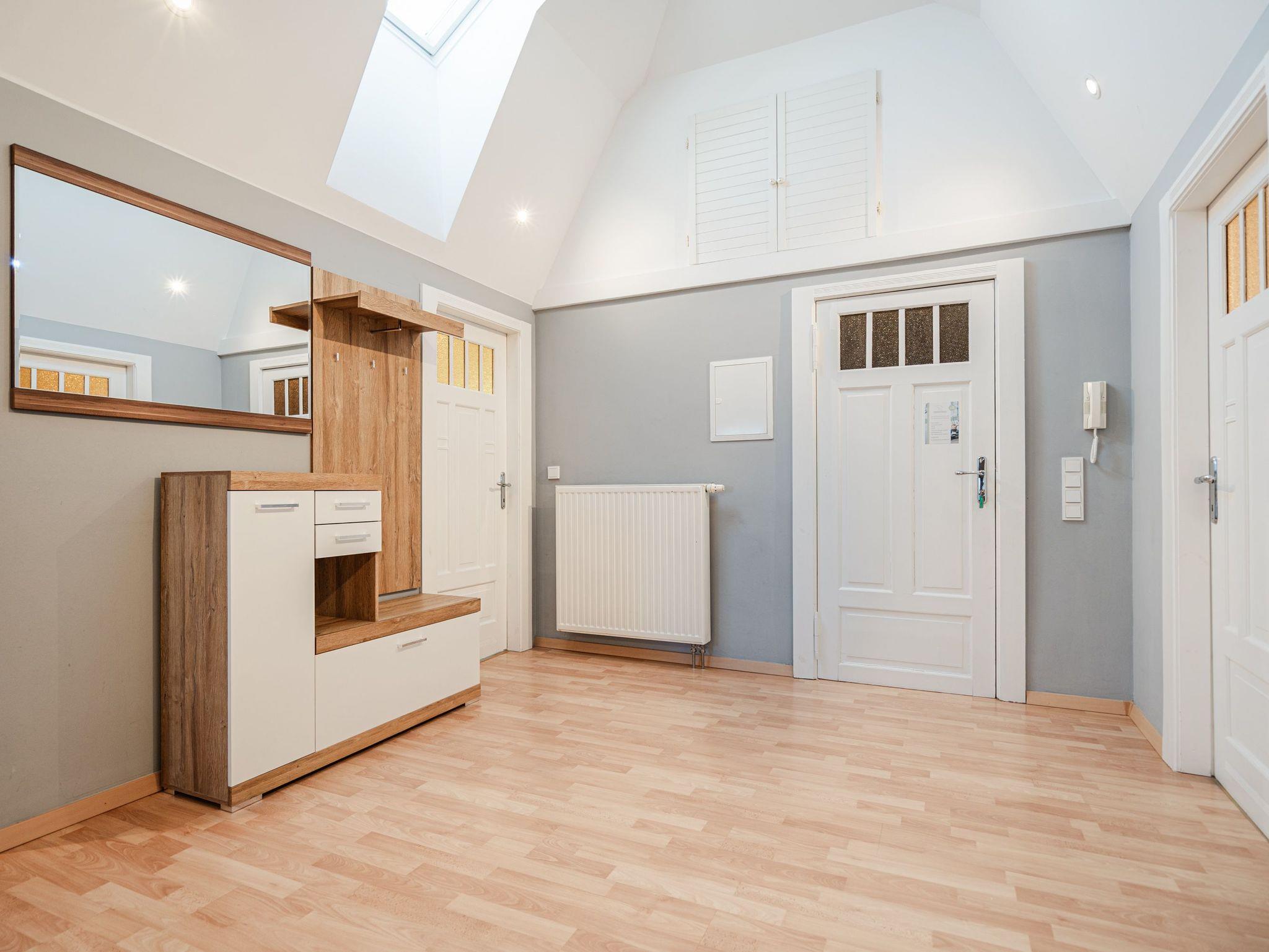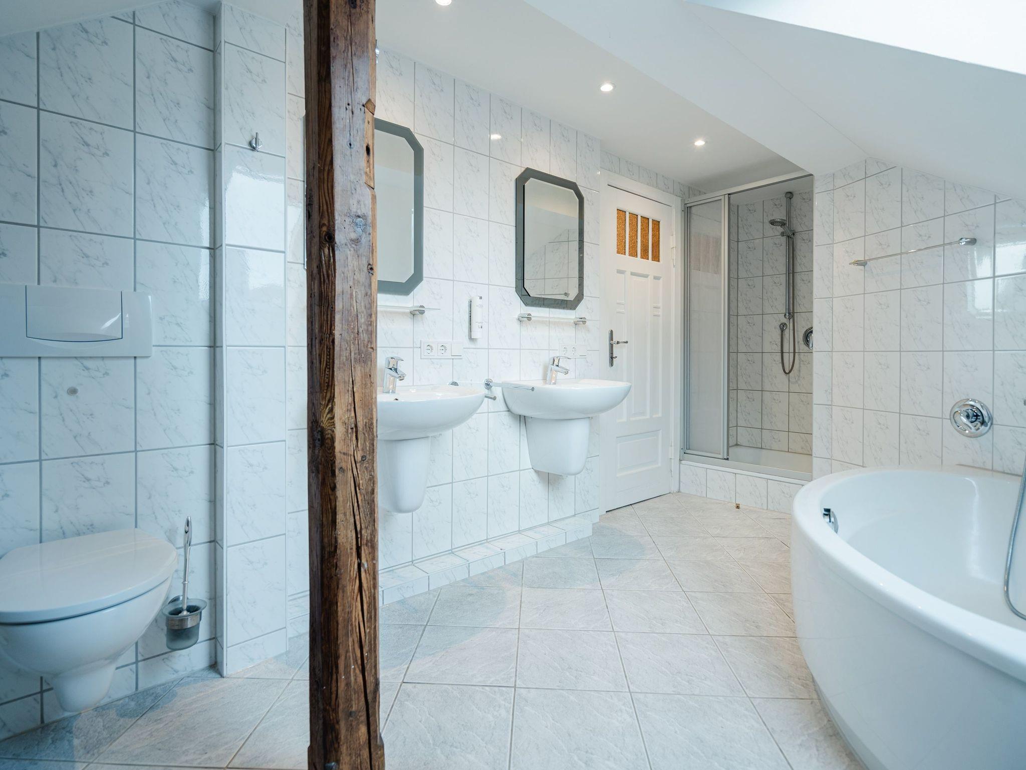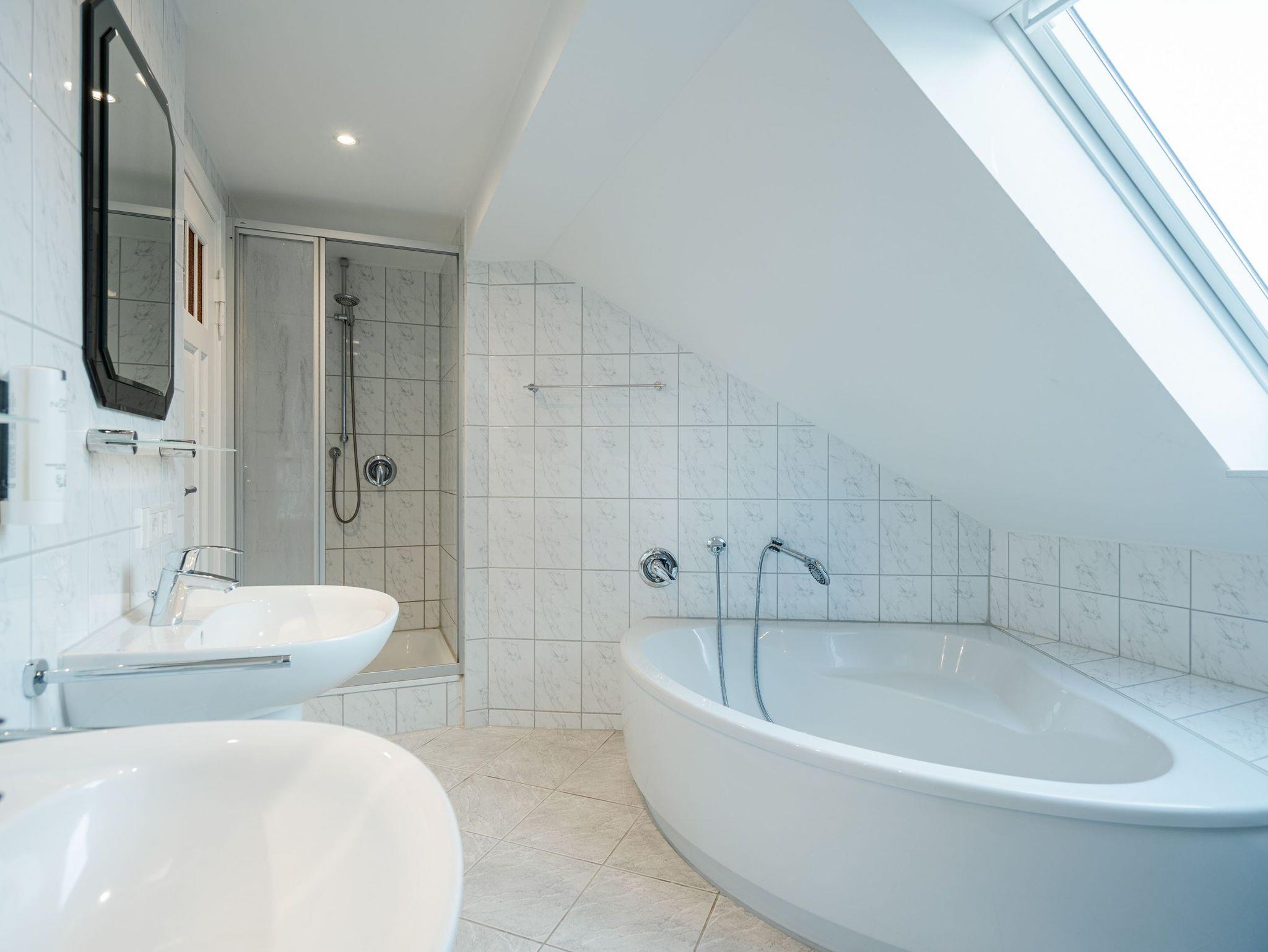 Viel Platz (100 qm) und jede Menge Gemütlichkeit erwarten Sie im Dachstudio der Villa Dora. Die Ferienwohnung 14 bietet Platz für bis zu 4 Personen. Moderne Möbel und Ausstattungen, gepaart mit Dachbalken und Schrägen, ergeben hier eine besonders wohnliche Atmosphäre. Der schöne Wohnbereich ist mit bequemer Sitzgruppe und Flat-TV ausgestattet. Hier findet man auch eine kleine Rückzugsecke unter der Dachschräge. Auf zwei Sesseln genießt man von hier aus, aus den kleinen Dachfenstern, den tollen Blick auf die Ostsee. Sicher wird dies schnell zu Ihrem Lieblingsplatz. Die zum Wohnbereich angrenzende, offen gehaltene Küche ist komplett ausgestattet und bietet auch dem Esstisch Platz. Zwei Schlafzimmer mit komfortablen Boxspringbetten (1x Doppelbett (1,60m x 2,00m) / 1x getrennte Betten (0,80m x 1,90m)) ergänzen die Wohnung ebenso wie das große Bad mit Doppelwaschbecken, WC, Dusche und Eck-Badewanne. Für Ihren Komfort sind die Betten bei der Anreise bezogen und Handtücher liegen bereit. Für kleine Gäste kann ein Kinderreisebett und ein Kinderhochstuhl bestellt werden. Für Ihren PKW steht Ihnen ein Parkplatz mit Poller vor dem Haus zur Verfügung.