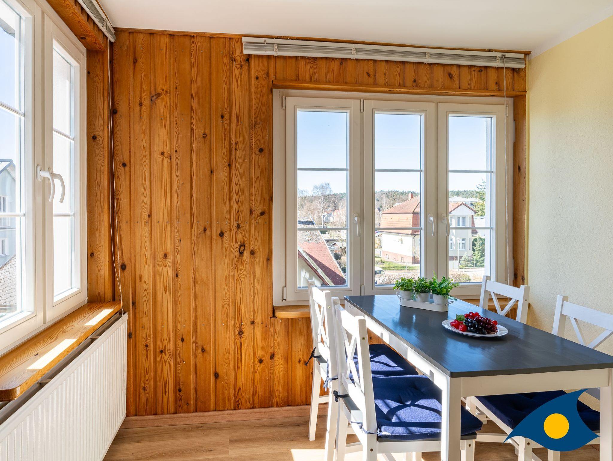 Die separate Küche bietet genug Platz, um Ihren Kochkünsten freien Lauf zu lassen. Von der Küche aus gelangen Sie in das Esszimmer mit Sitzbank, von der aus Sie Ihren Blick schweifen lassen können.