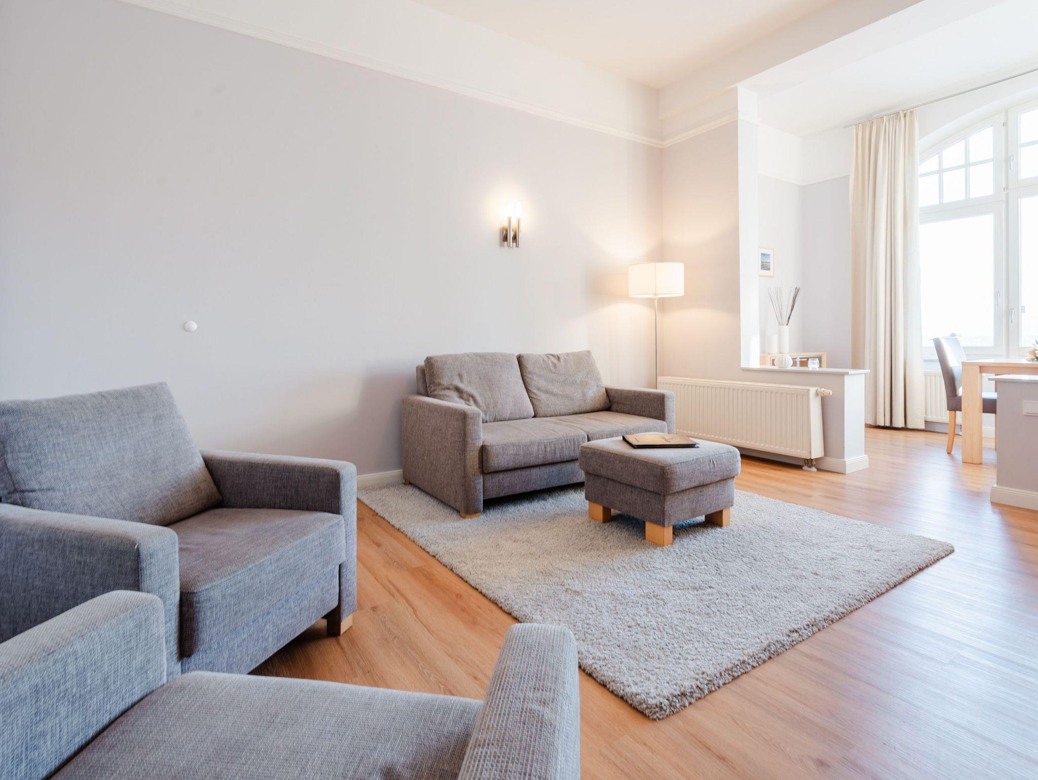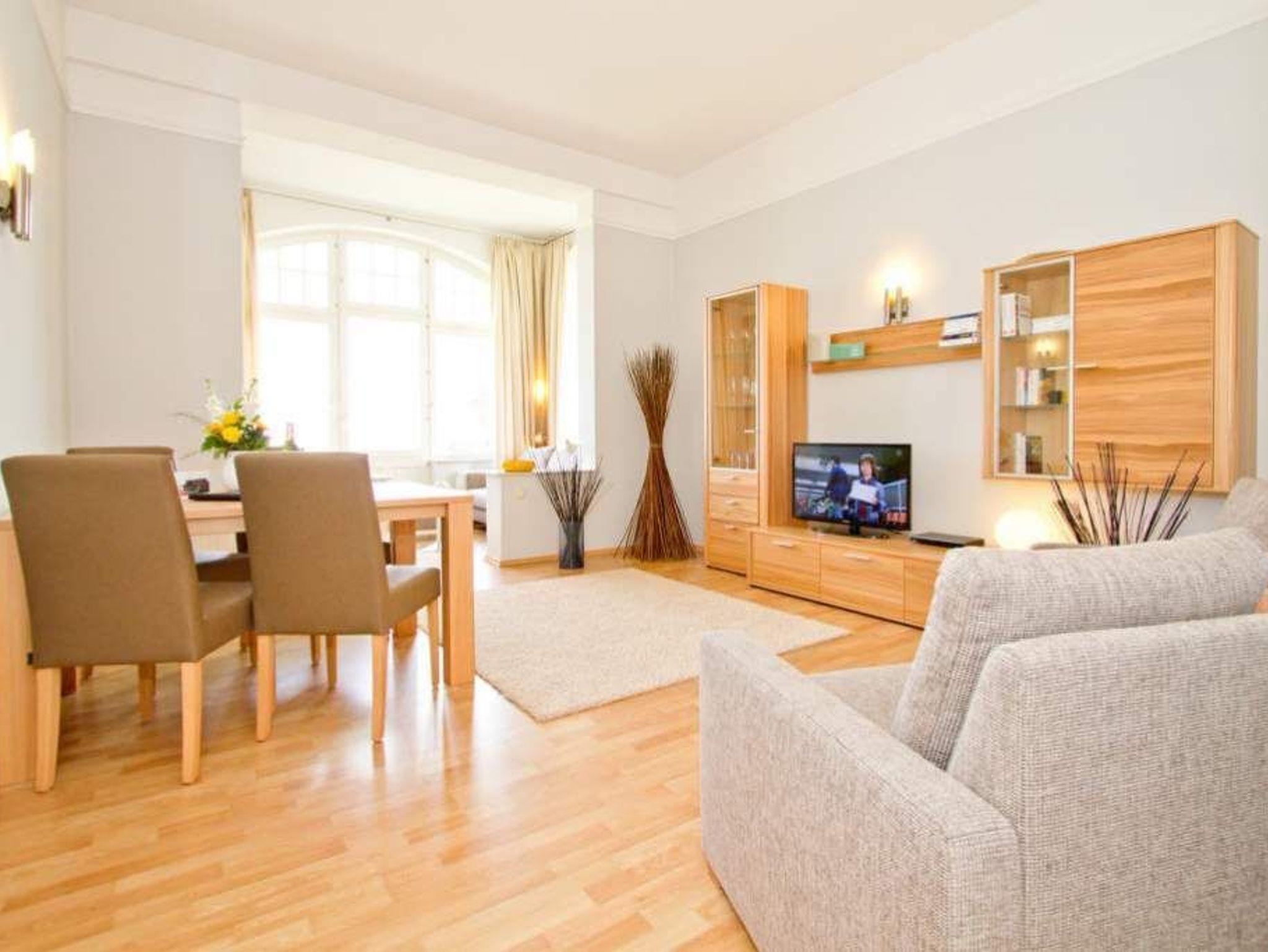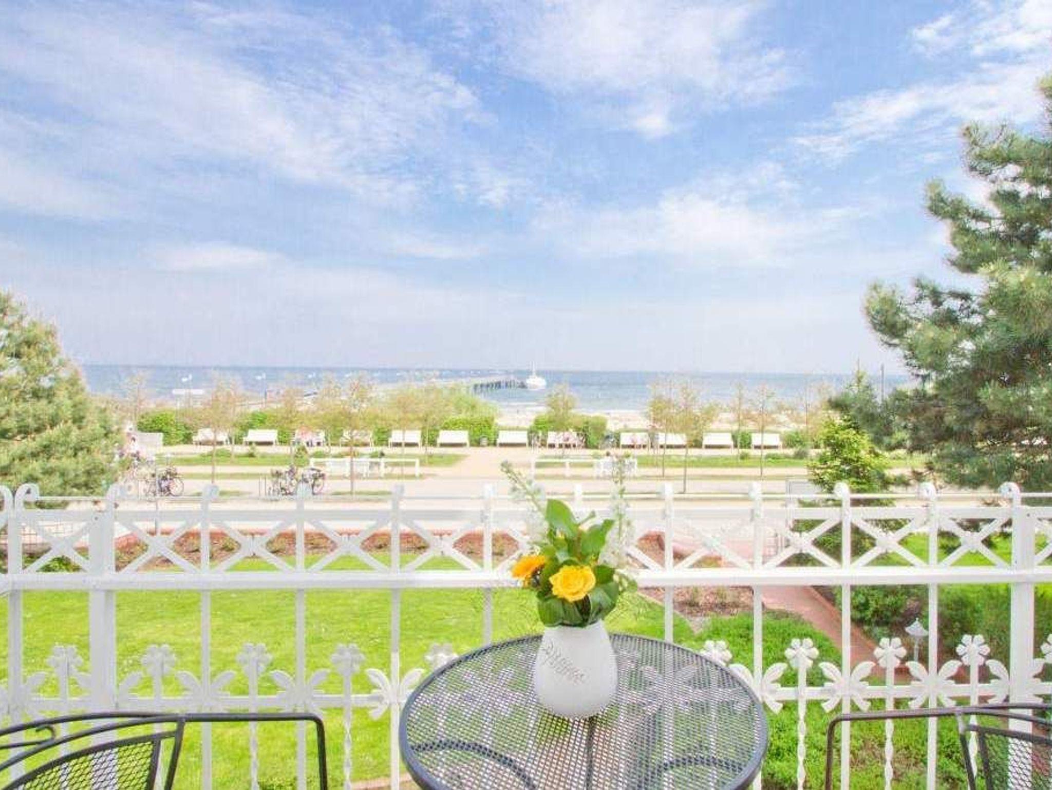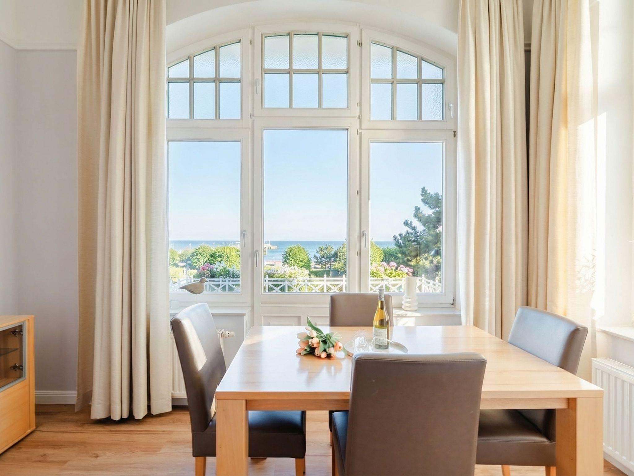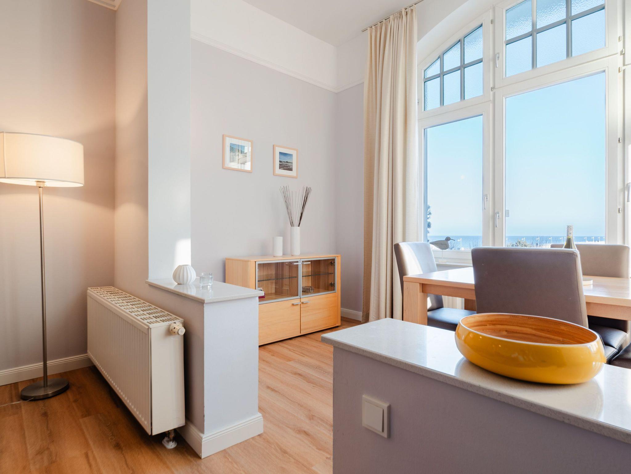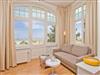 Ostsee wohin das Auge reicht. Die Ferienwohnung 6 empfängt Sie im 1. Obergeschoss der Villa und offeriert Ihnen einen klassischen, gemütlichen Wohnstil. Der Wohnbereich ist mit einem Essplatz ausgestattet und geht in eine offene Veranda mit Fernsehbereich und Balkon über. Dieses Domizil bietet 2- 4 Personen Platz für den Urlaub. Sie finden hier zwei Schlafzimmer, eines mit Doppelbett (1,60m x 2,00m) und ein zweites kleines Schlafzimmer mit zwei einzelnen Schlafkojen (2x 1,80m x 0,80m - ideal für Kinder). Für Ihren Komfort sind die Betten bei der Anreise bezogen und Handtücher liegen bereit (Erstausstattung). Das Bad bietet zwei Waschbecken, Dusche und Föhn. Ein Pkw-Stellplatz steht in einer Garage in der hinteren Bergstraße zur Verfügung.