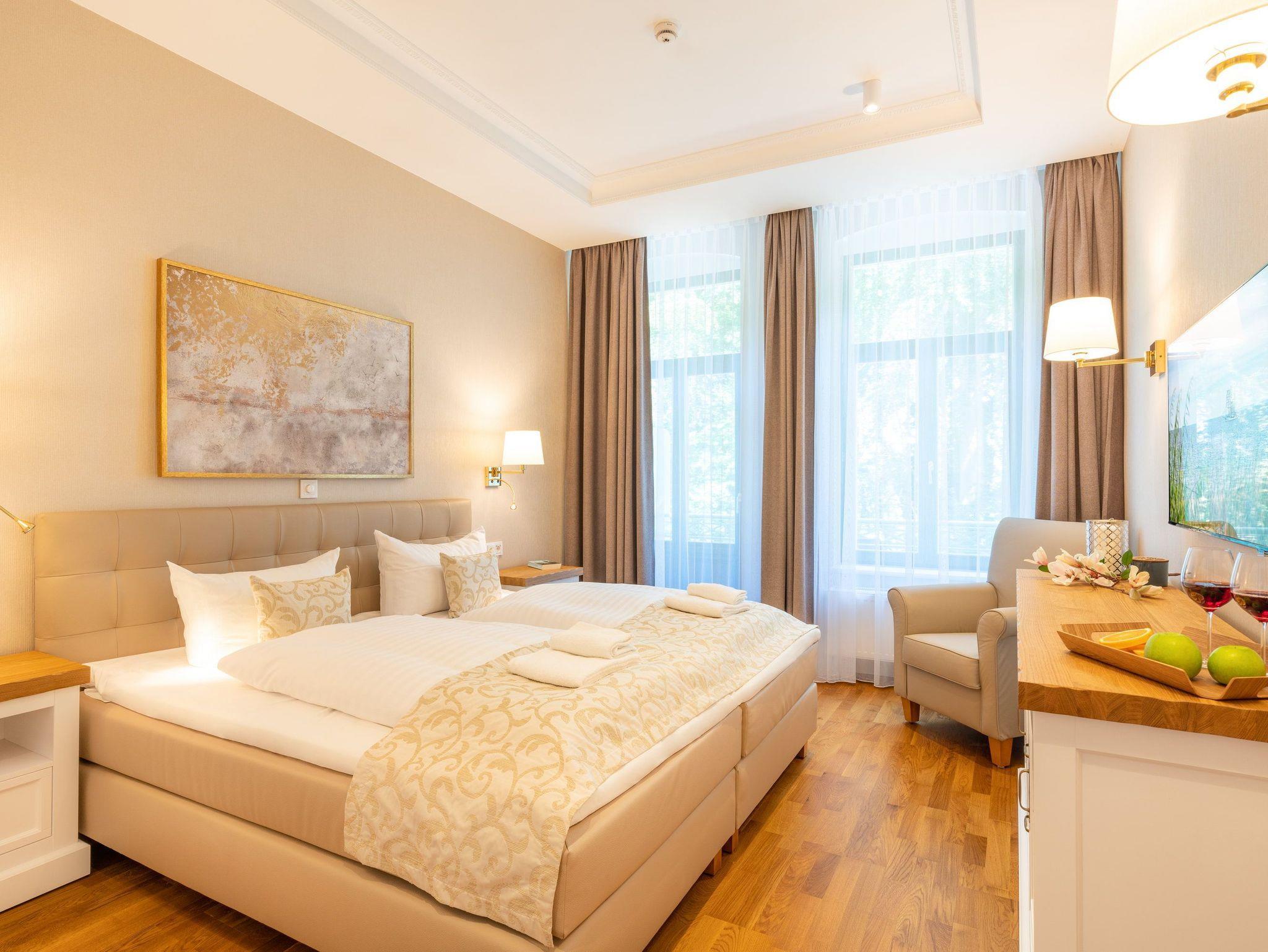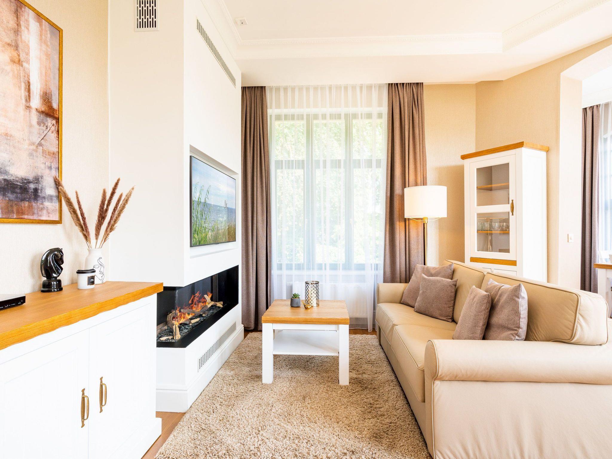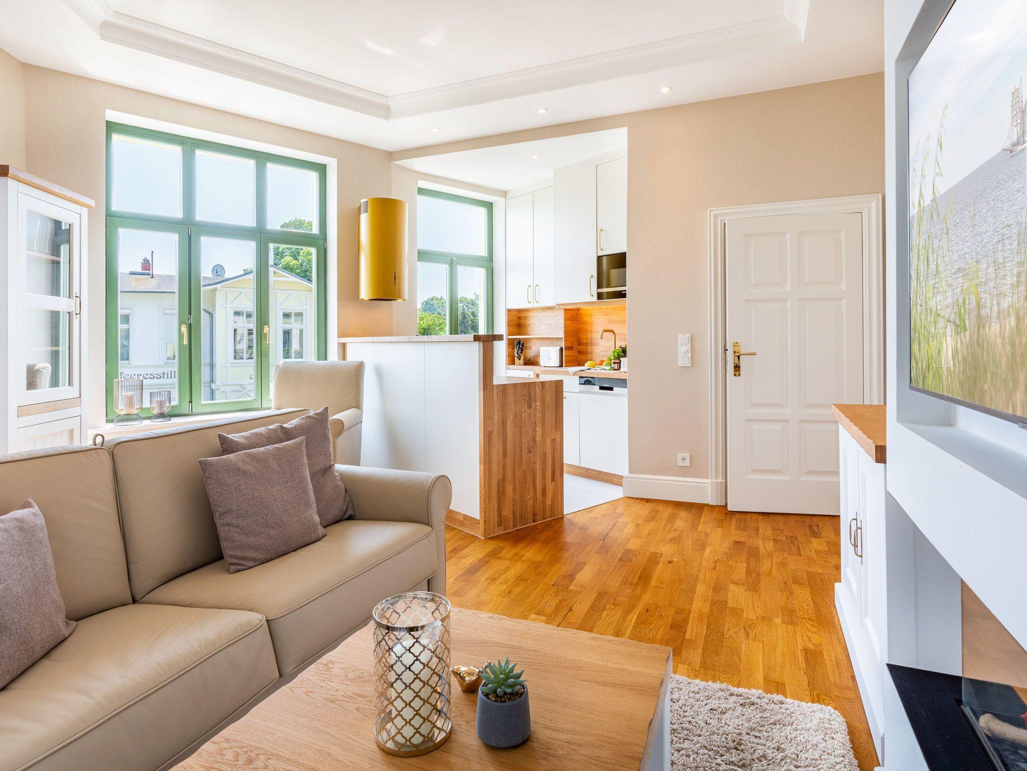 Ein großzügiger Wohnbereich mit einem exklusiven Gaskamin erwartet Sie bereits, sodass Sie eine angenehme Wohlfühlatmosphäre das gesamte Jahr über genießen. Eine bequeme Couchgarnitur und ein Flat TV runden den Komfort perfekt ab und laden zum Entspannen und Füße hochlegen ein. Das helle Zwei-Zimmer-Appartement hat eine Größe von 60 Quadratmetern und liegt im 1. Obergeschoss der Villa Waldschloss. Die vollausgestattete Küche, welche speziell von einem einheimischen Tischler angefertigt wurde, ergänzt die Annehmlichkeiten dieses neuen Appartements mit allen Raffinessen: Backofen, Mikrowelle, Kühlschrank mit Gefrierfach, Toaster, Wasserkocher, Kaffeemaschine sowie einem Essplatz für 4 Personen mit Blick in den gegenüberliegenden Park. Lauschen Sie dem Klang der Ostsee auf einem der beiden Balkone. Ein Balkon ist vom Wohnbereich ein zweiter vom Schlafzimmer begehbar. Echtholzparkett im Wohn- und Schlafraum, unkaputtbare Tapeten aus Amerika. Bei der Umgestaltung wurde nichts dem Zufall überlassen. Die vier Schlafplätze verteilen sich auf das Schlafzimmer mit einem bequemen und zugleich hochwertigem Boxspringbett (200 x 200cm / zwei getrennte Matratze) und der Schlafcouch im Wohnbereich, welche sich im Handumdrehen für zwei Gäste als Schlafmöglichkeit umfunktionieren lässt. Ein Kleiderschrank zum Verstauen Ihrer Habseligkeiten während Ihrer Urlaubszeit steht für Sie bereit. Lassen Sie hier den Tag ausklingen oder genießen Ihre Lieblingsserie vor dem TV.