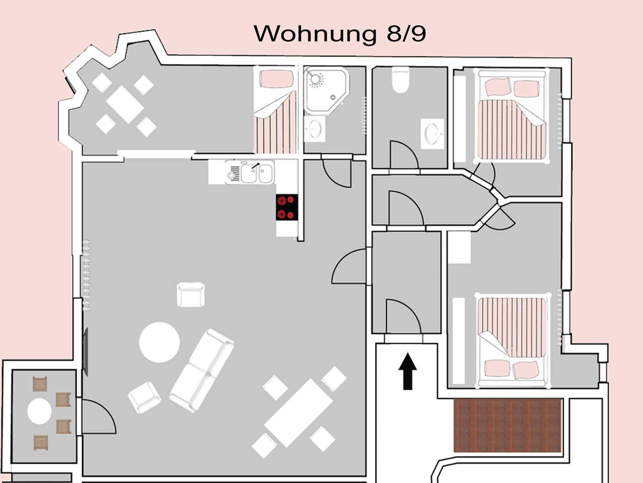 Die Wohnung 8/9 bestehend aus 3 Zimmern befindet sich in der 1. Etage.