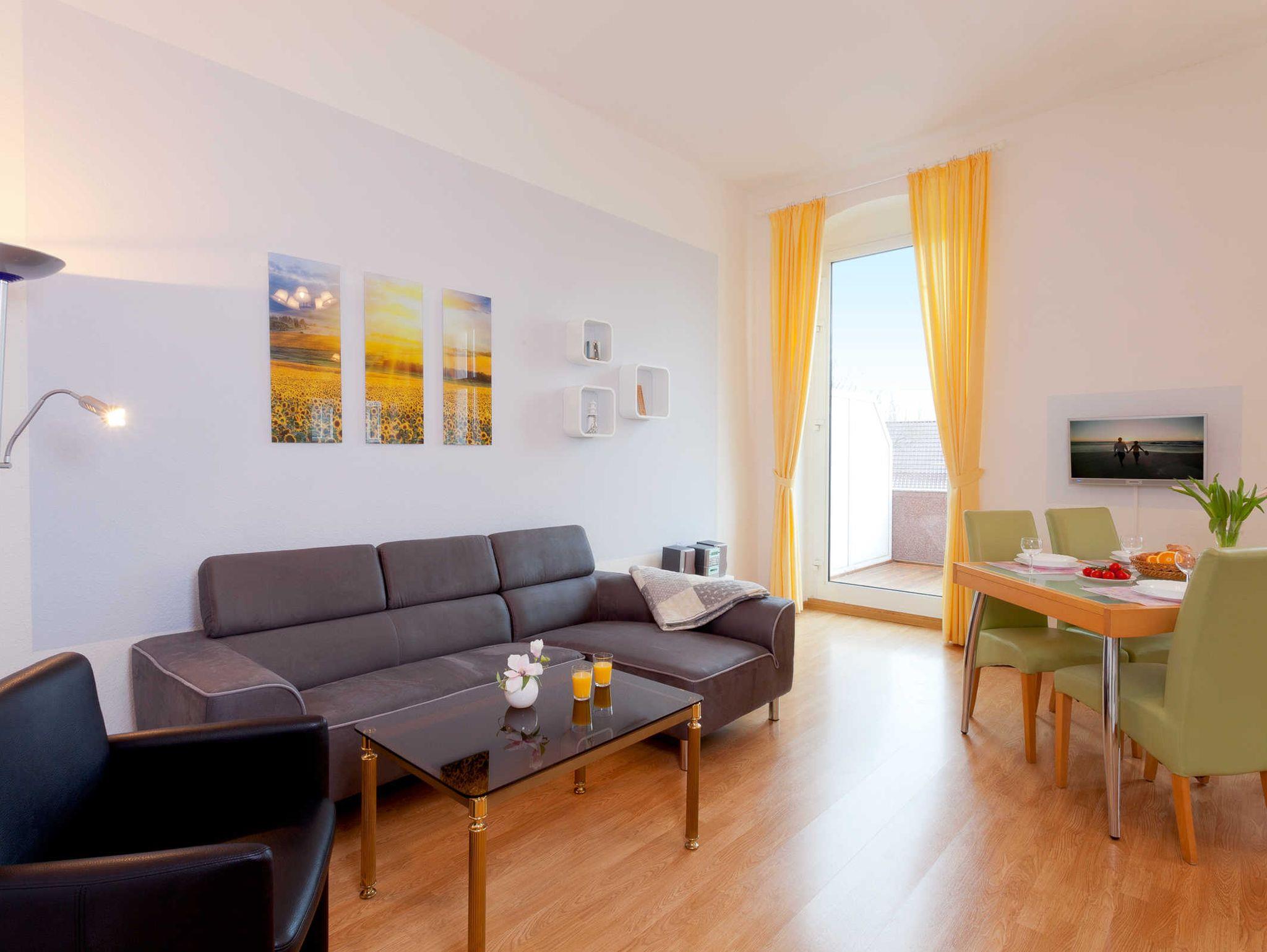 Das Wohnzimmer integriert eine Küchenzeile mit Sitzgelegenheiten, eine gemütliche Couchecke und einen 5 m² großen Südbalkon. Der sonnendurchflutete Erker lädt zum Wohlfühlen und Entspannen ein. Die zwei Schlafzimmer sind nordöstlich gelegen und verfügen über 1.60 m große Komfortbetten.