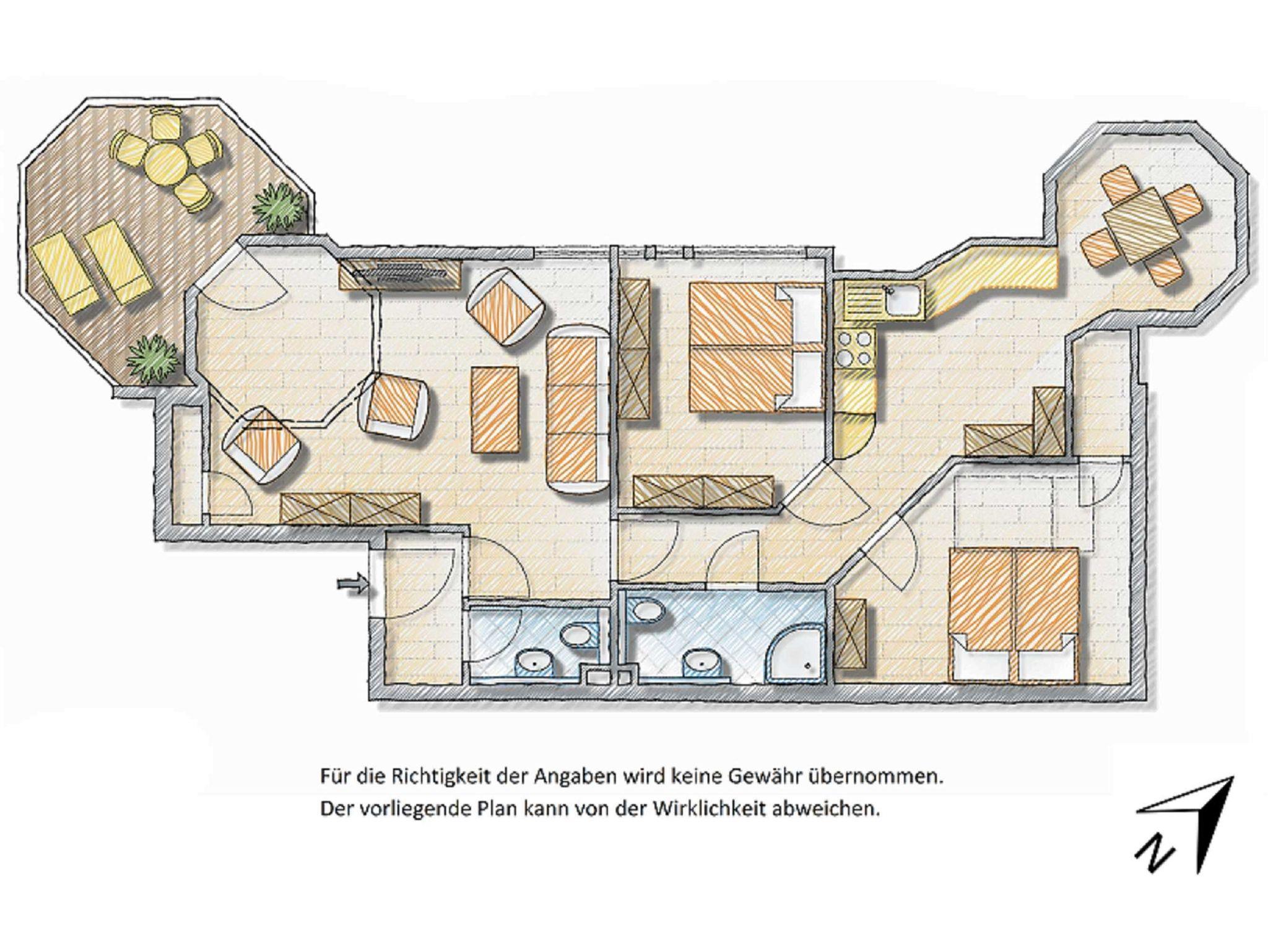 Diese Dachgeschosswohnung - hochwertig ausgestattet - ist aufgeteilt in ein Wohnzimmer, zwei Schlafzimmer, einen bestens ausgestatteten Küchenbereich, ein Badezimmer mit Dusche und ein Gäste-WC.