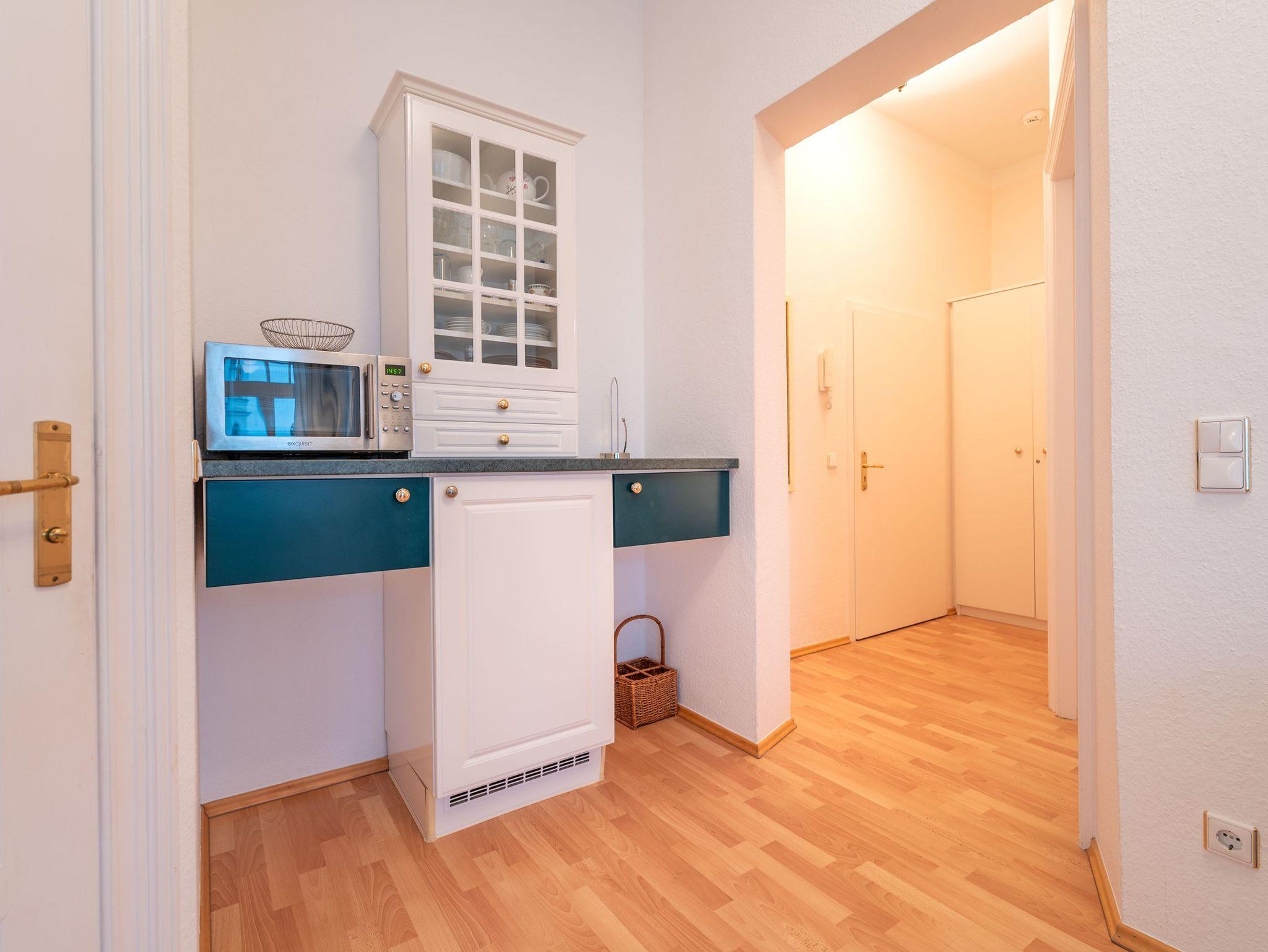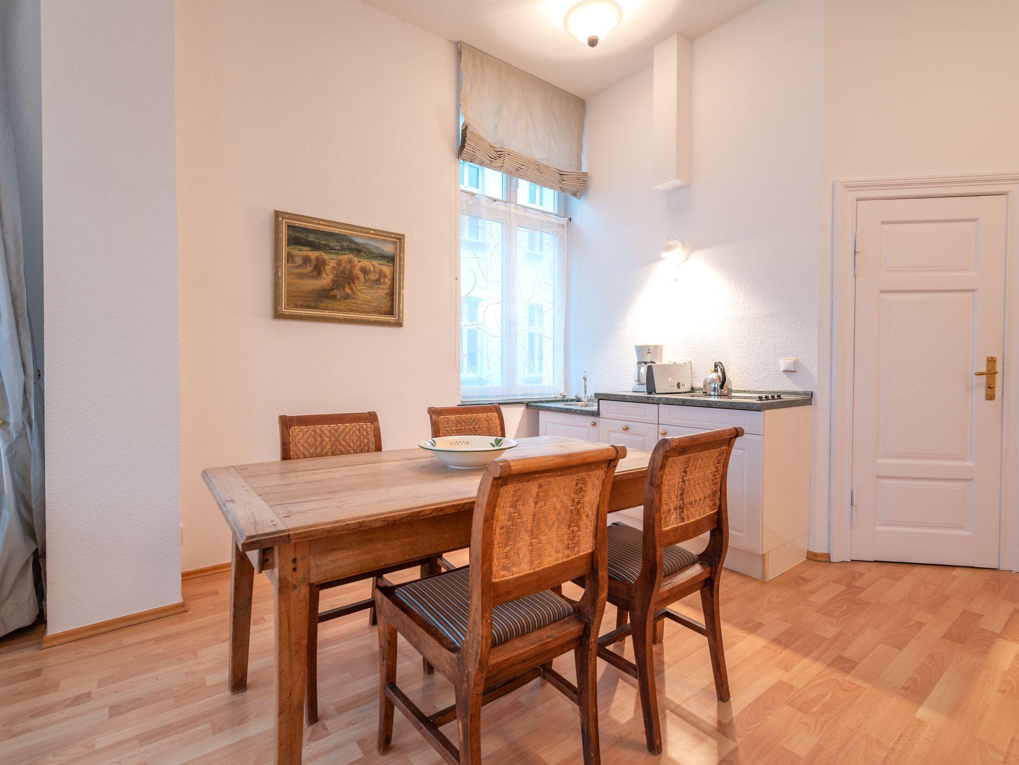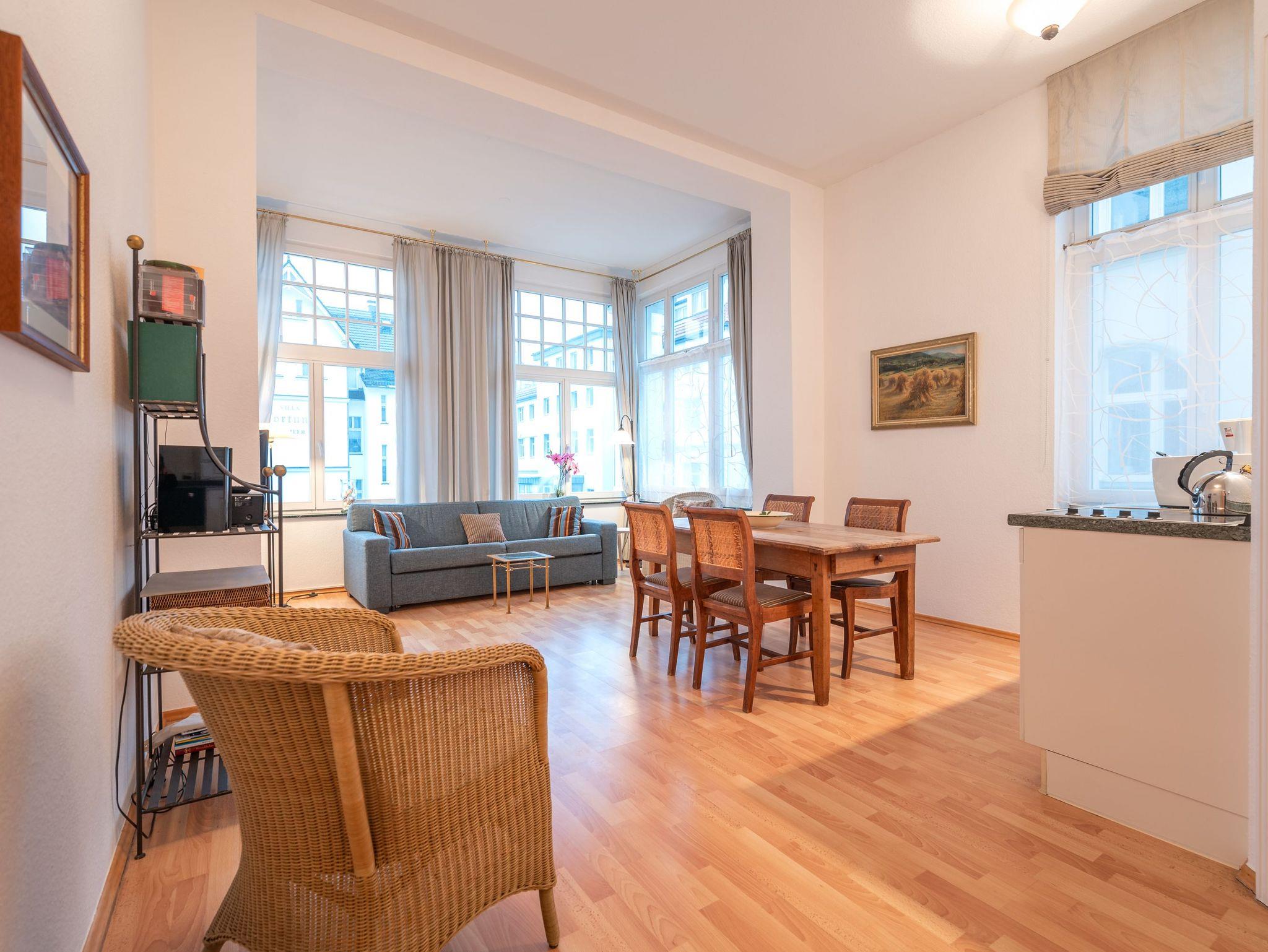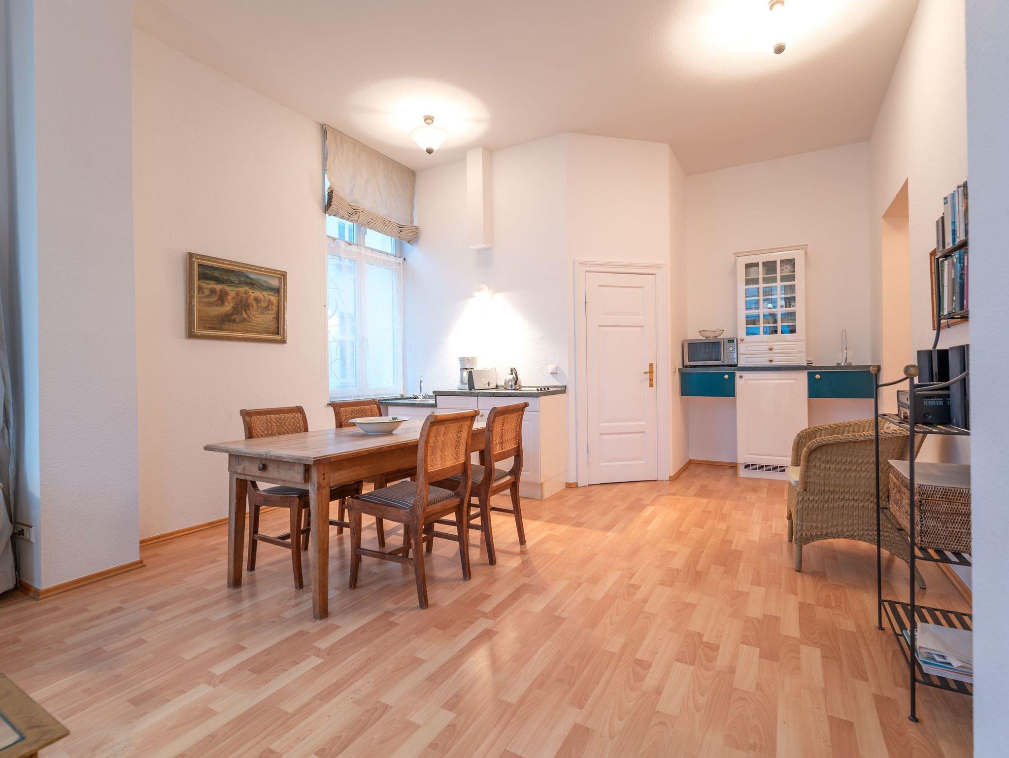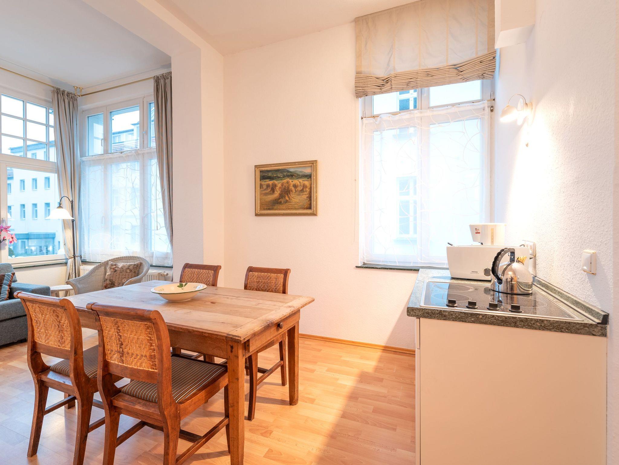 Der großzügige Wohnbereich lädt mit einer gemütlichen Couch, einem Fernseher und einem Esstisch zum Verweilen ein. Die integrierte Küchenzeile ist praktisch ausgestattet mit Kaffeemaschine, Wasserkocher, Toaster, vier Cerankochfeldern und einer Mikrowelle ? perfekt für die Zubereitung kleiner Mahlzeiten.
