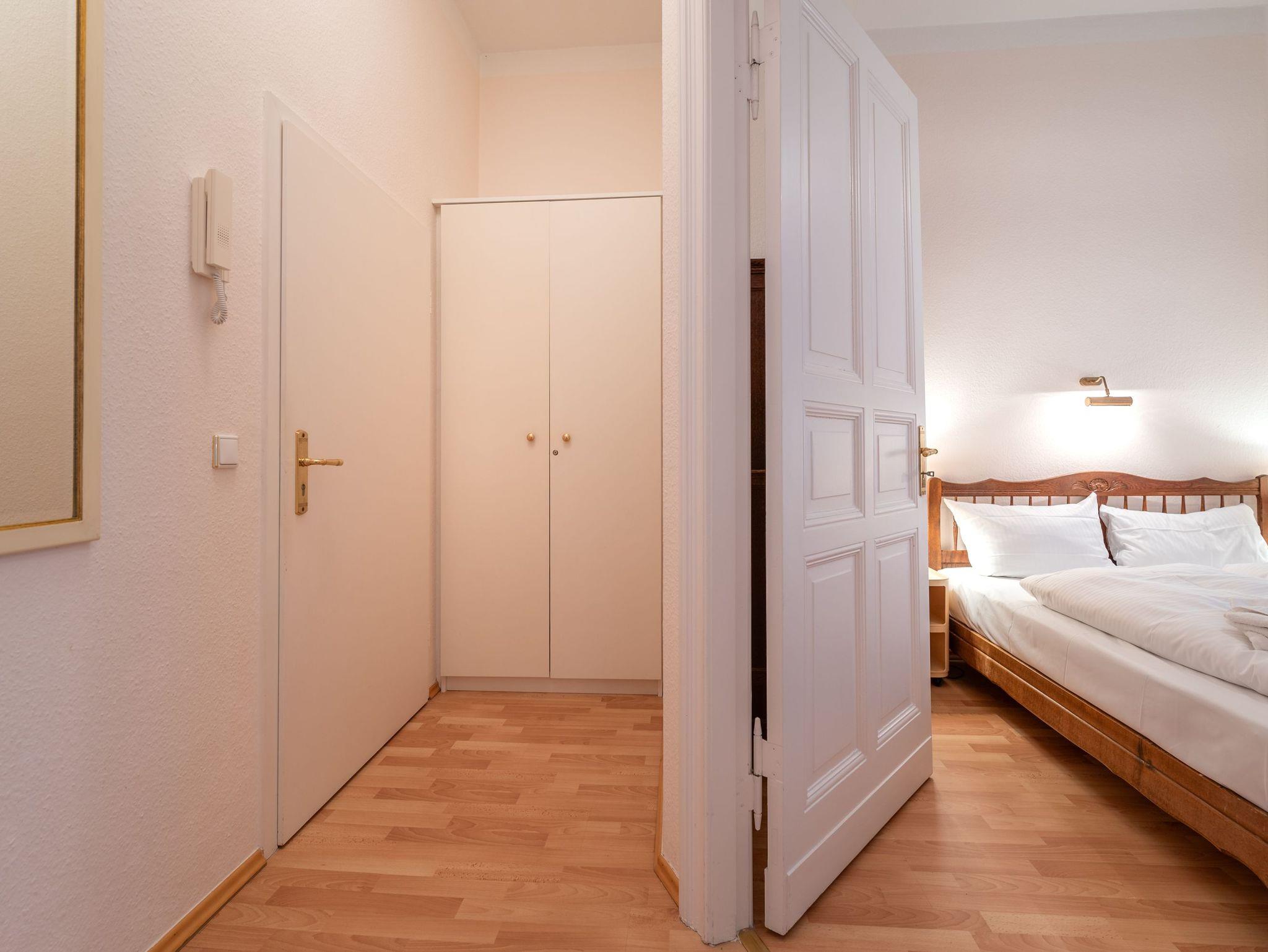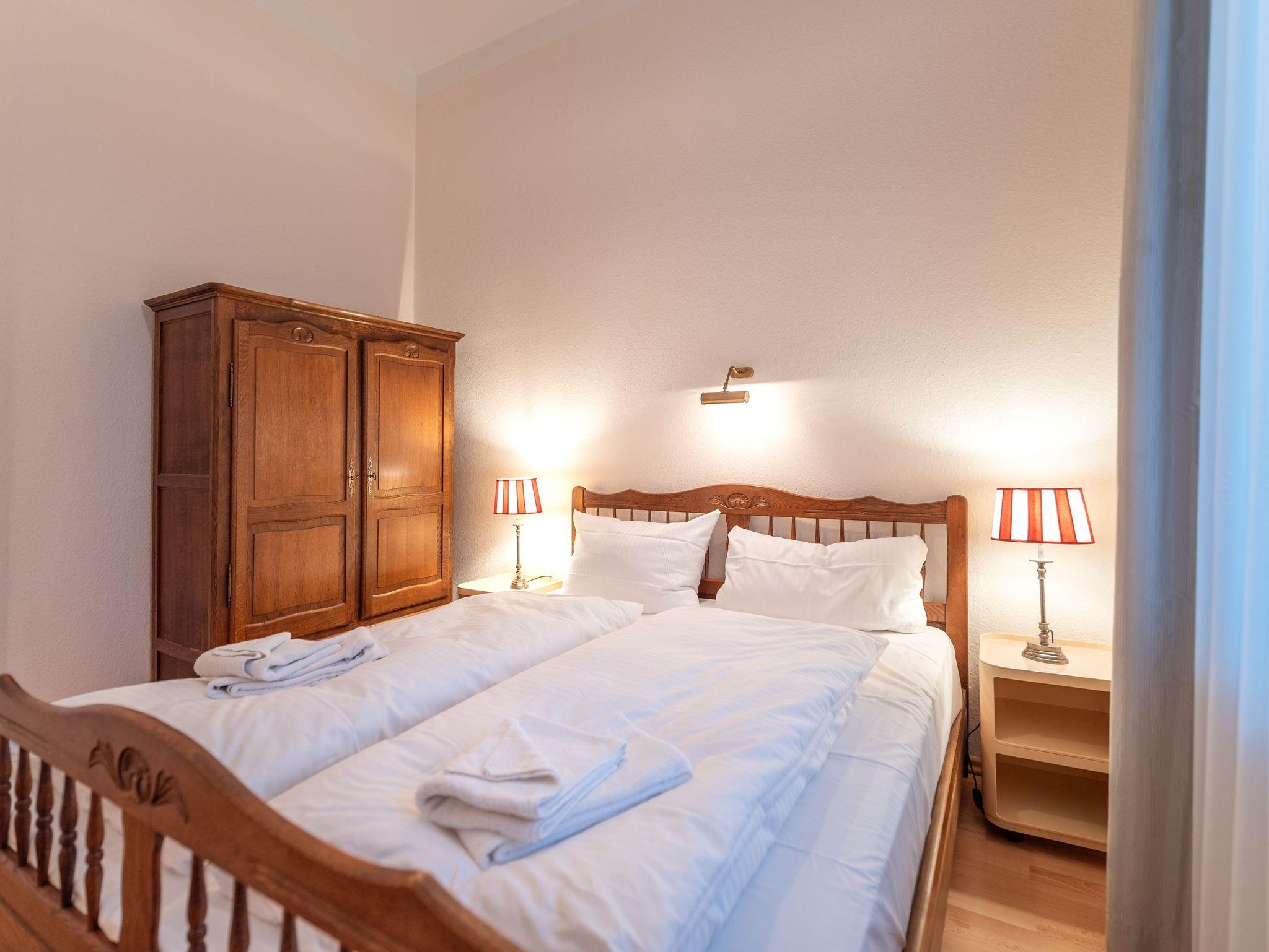 Das Schlafzimmer verfügt über ein 1,40 m breites Doppelbett und einen Schrank, der ausreichend Platz für Ihre Urlaubsgarderobe bietet. Ein Babybett kann bei Bedarf zugebucht und gestellt werden. Das Badezimmer ist mit Dusche und WC ausgestattet und sorgt für zusätzlichen Komfort.