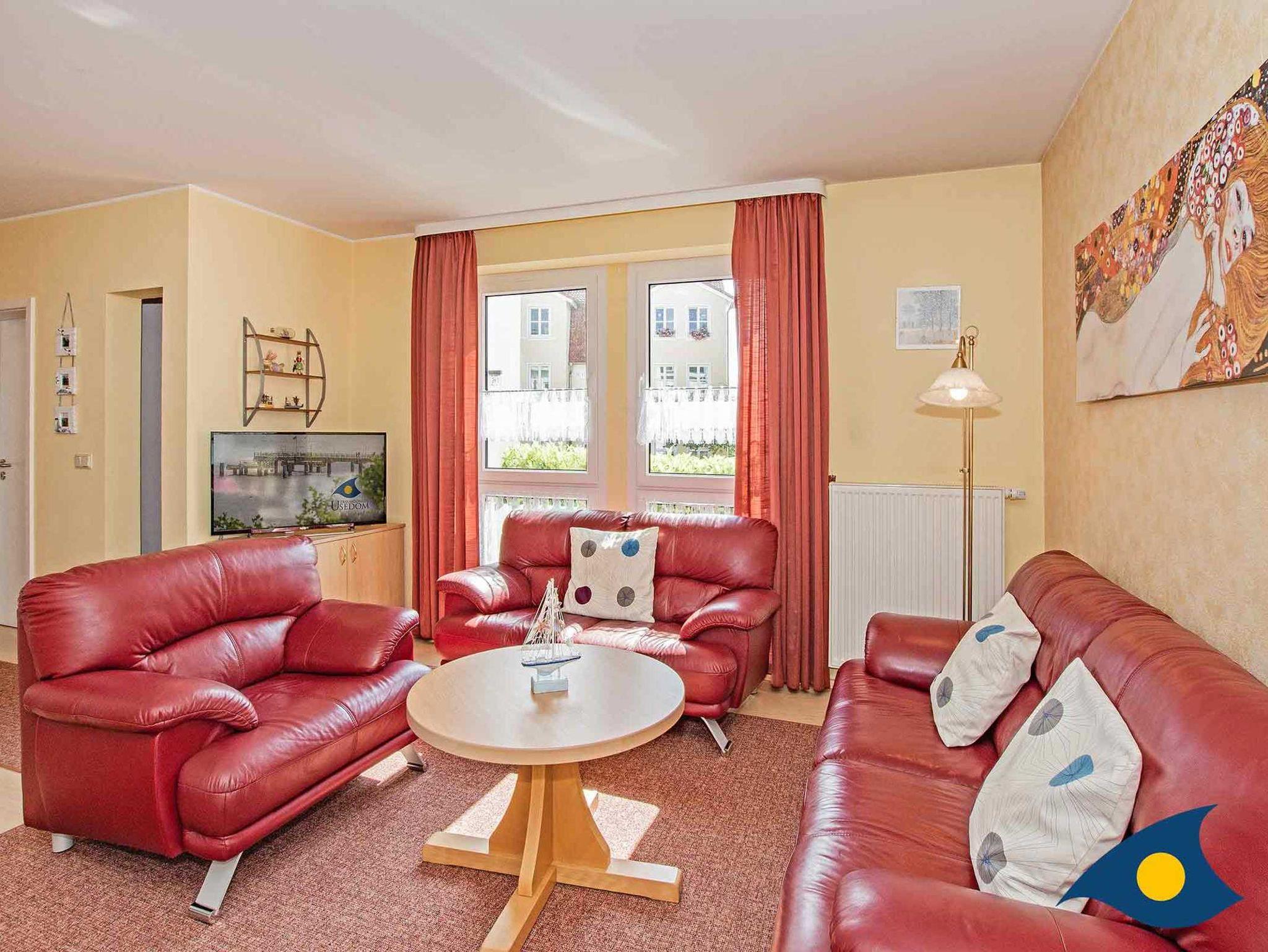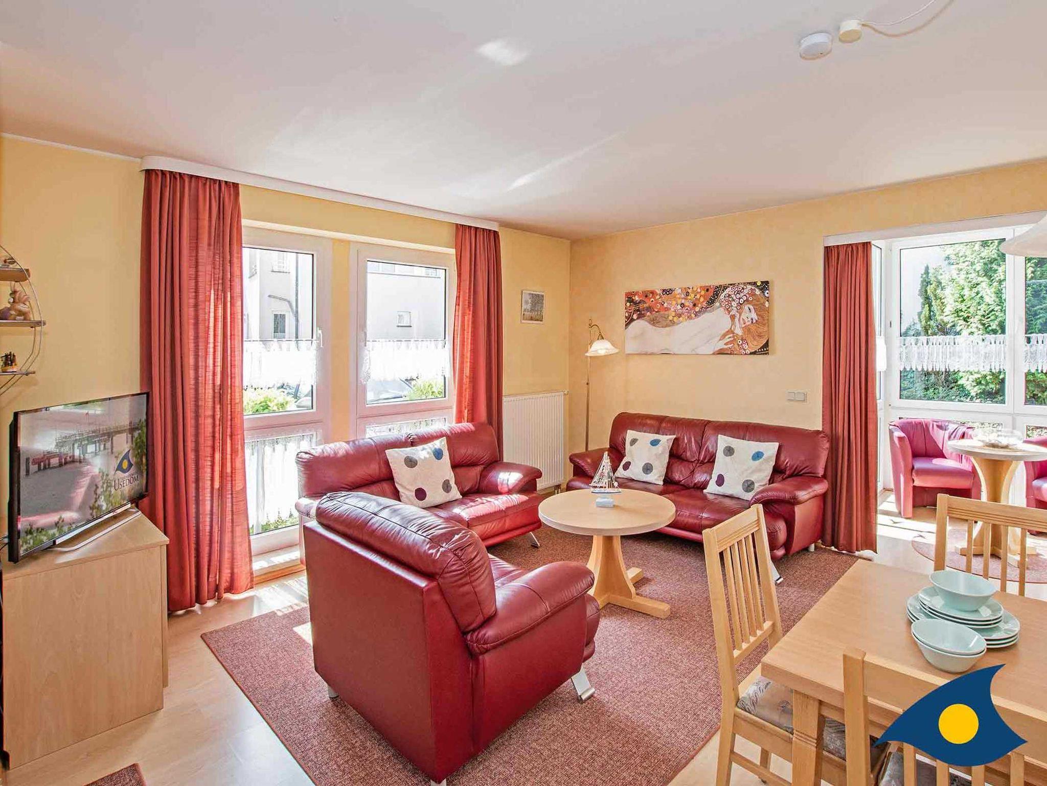 Die Wohnung 13 in der Villa Cosima liegt im Erdgeschoss des Hauses. In dem großzügigen Wohnraum begrüßt Sie eine bequeme Sofalandschaft, eine gut ausgestattete Küchenzeile, eine Essecke und der südlich ausgerichtete Wintergarten mit zwei gemütlichen Sesseln.