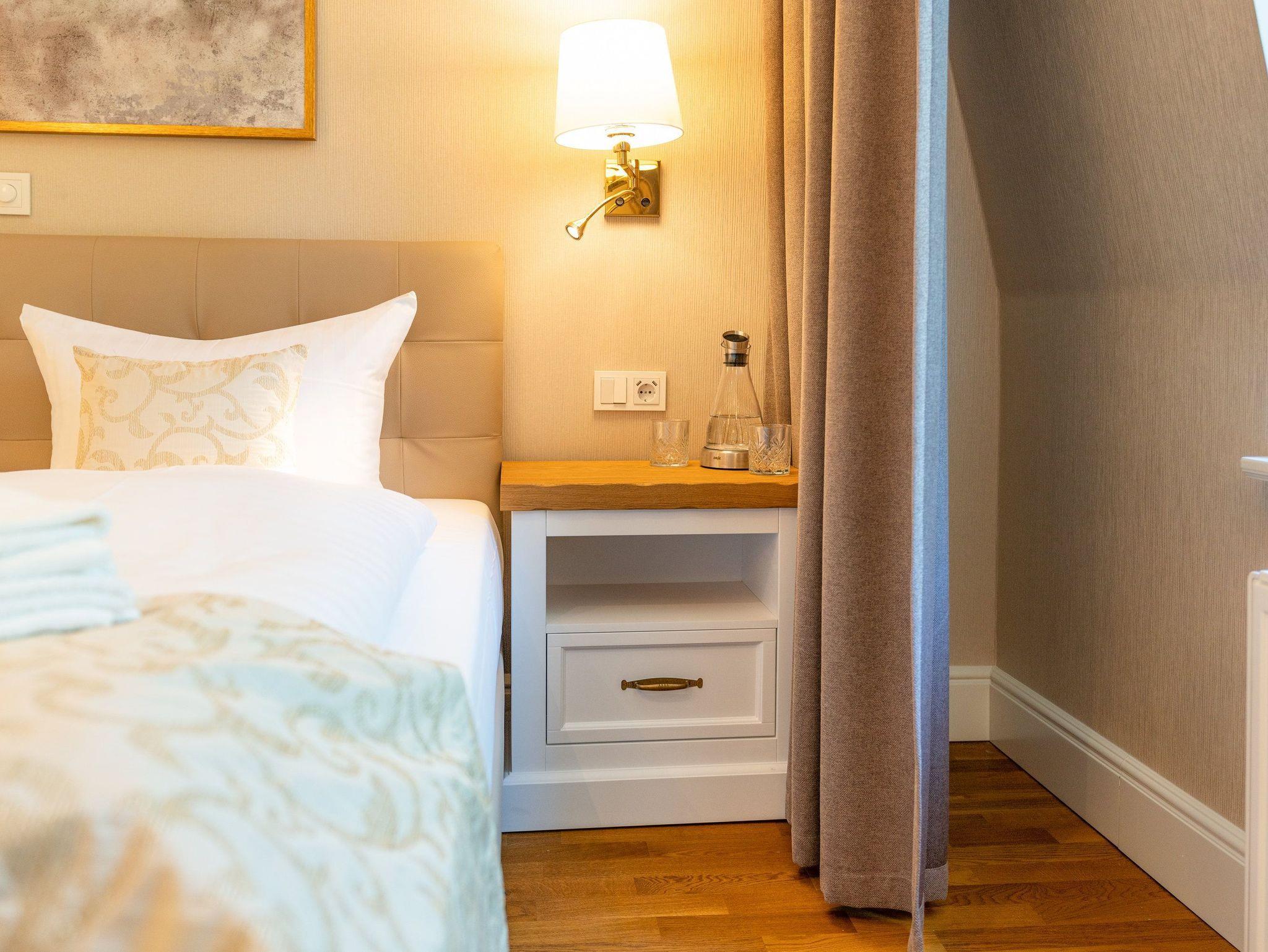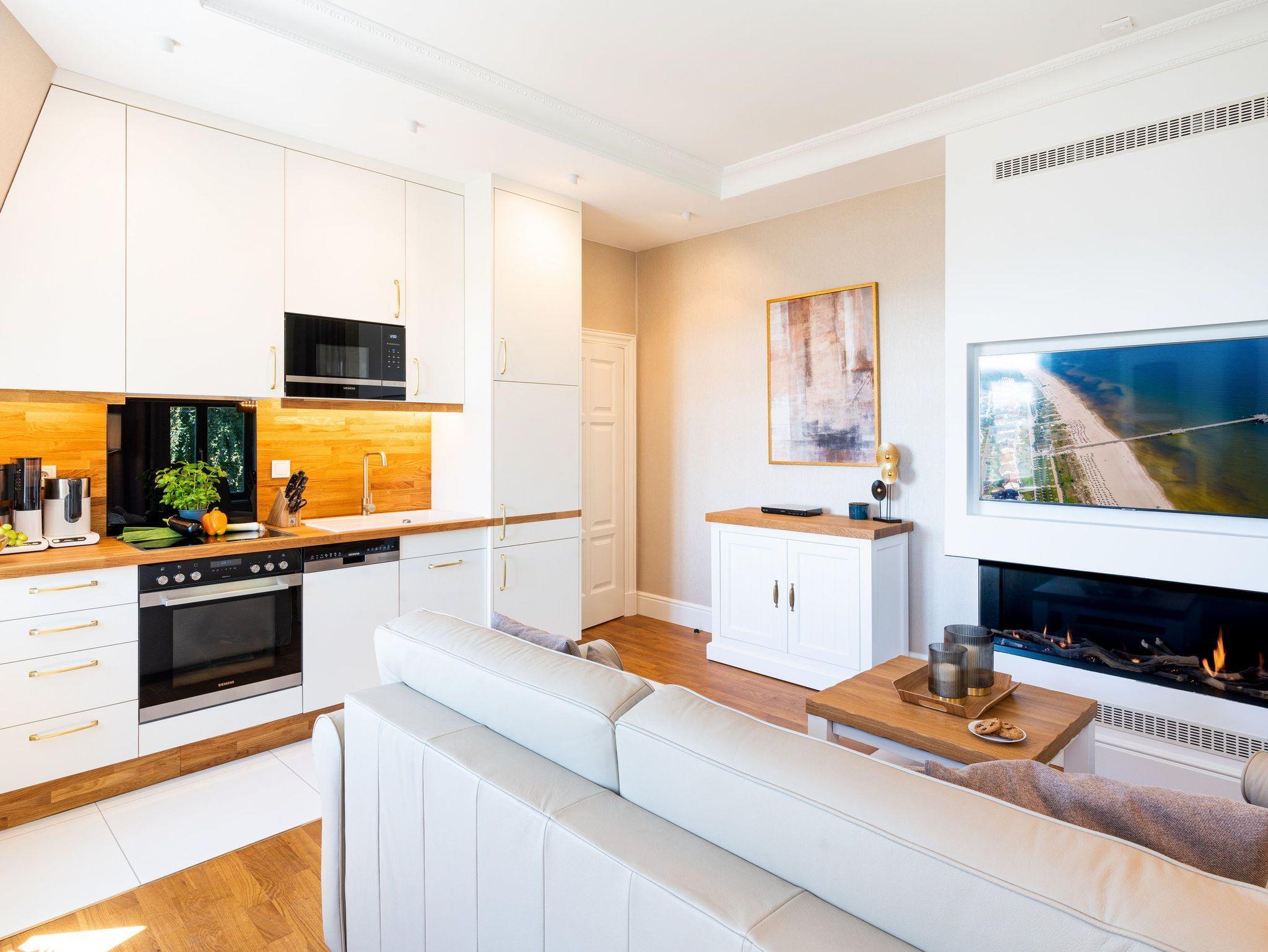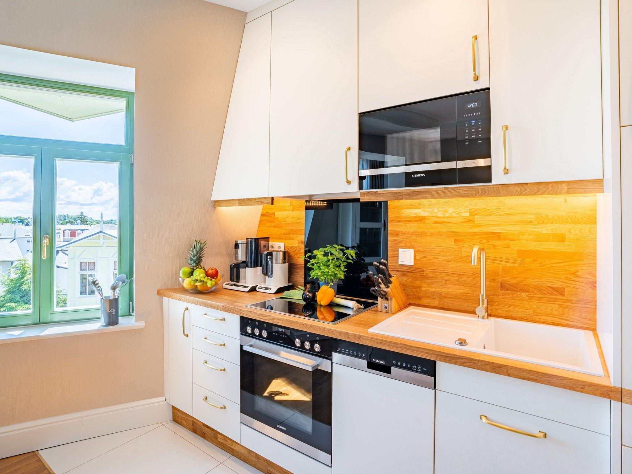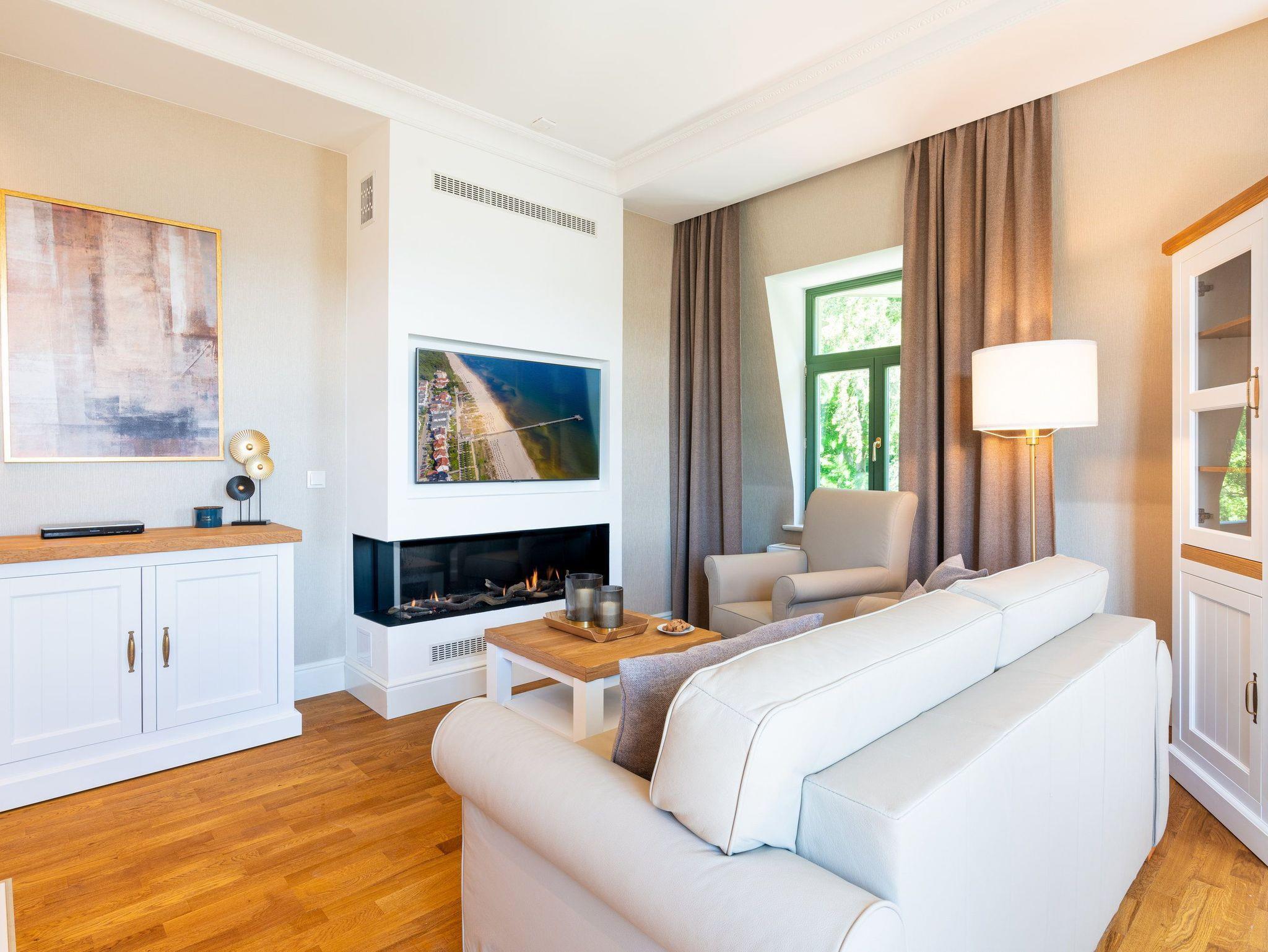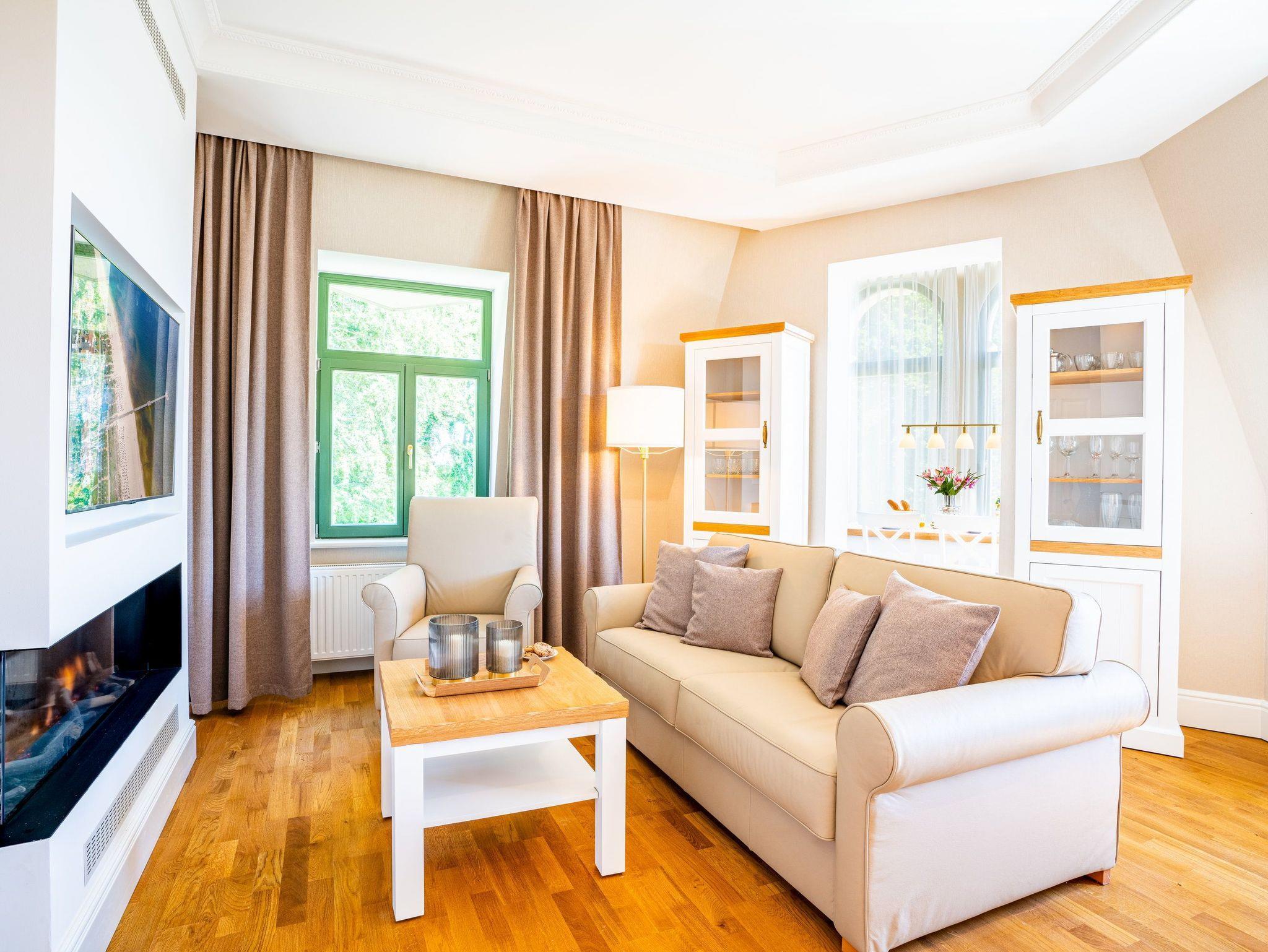 Ein großzügiger Wohnbereich mit einem exklusiven Gaskamin erwartet Sie bereits, sodass Sie eine angenehme Wohlfühlatmosphäre das gesamte Jahr über genießen. Eine bequeme Couchgarnitur und ein Flat-TV runden den Komfort perfekt ab und laden zum Entspannen und Füße hochlegen ein. Das helle Zwei-Zimmer-Appartement hat eine Größe von 60 Quadratmetern und liegt im 2. Obergeschoss der Villa Waldschloss. Die vollausgestattete Küche, welche speziell von einem einheimischen Tischler angefertigt wurde, ergänzt die Annehmlichkeiten dieses neuen Appartements mit allen Raffinessen: Backofen, Mikrowelle, Kühlschrank mit Gefrierfach, Toaster, Wasserkocher, Kaffeemaschine sowie einem Essplatz für 4 Personen mit Blick in den gegenüberliegenden Park. Echtholzparkett im Wohn- und Schlafraum, unkaputtbare Tapeten aus Amerika. Bei der Umgestaltung wurde nichts dem Zufall überlassen. Die vier Schlafplätze verteilen sich auf das Schlafzimmer - mit einem bequemen und zugleich hochwertigem Boxspringbett (200 x 200cm / zwei getrennte Matratze) und der Schlafcouch im Wohnbereich, welche sich im Handumdrehen für zwei Gäste als Schlafmöglichkeit umfunktionieren lässt. Ein Kleiderschrank zum Verstauen Ihrer Habseligkeiten während Ihrer Urlaubszeit steht für Sie bereit. Lassen Sie hier den Tag ausklingen oder genießen Ihre Lieblingsserie vor dem TV.