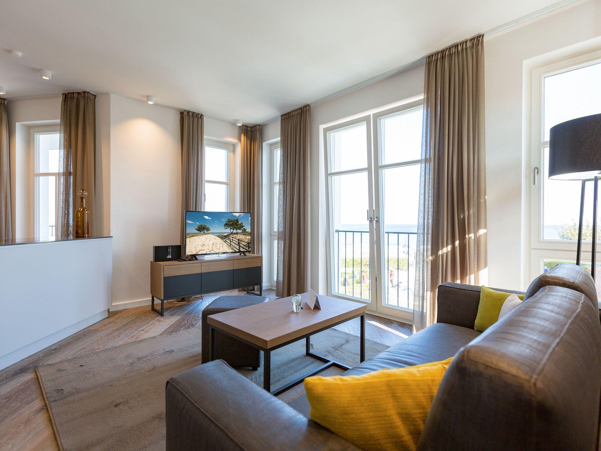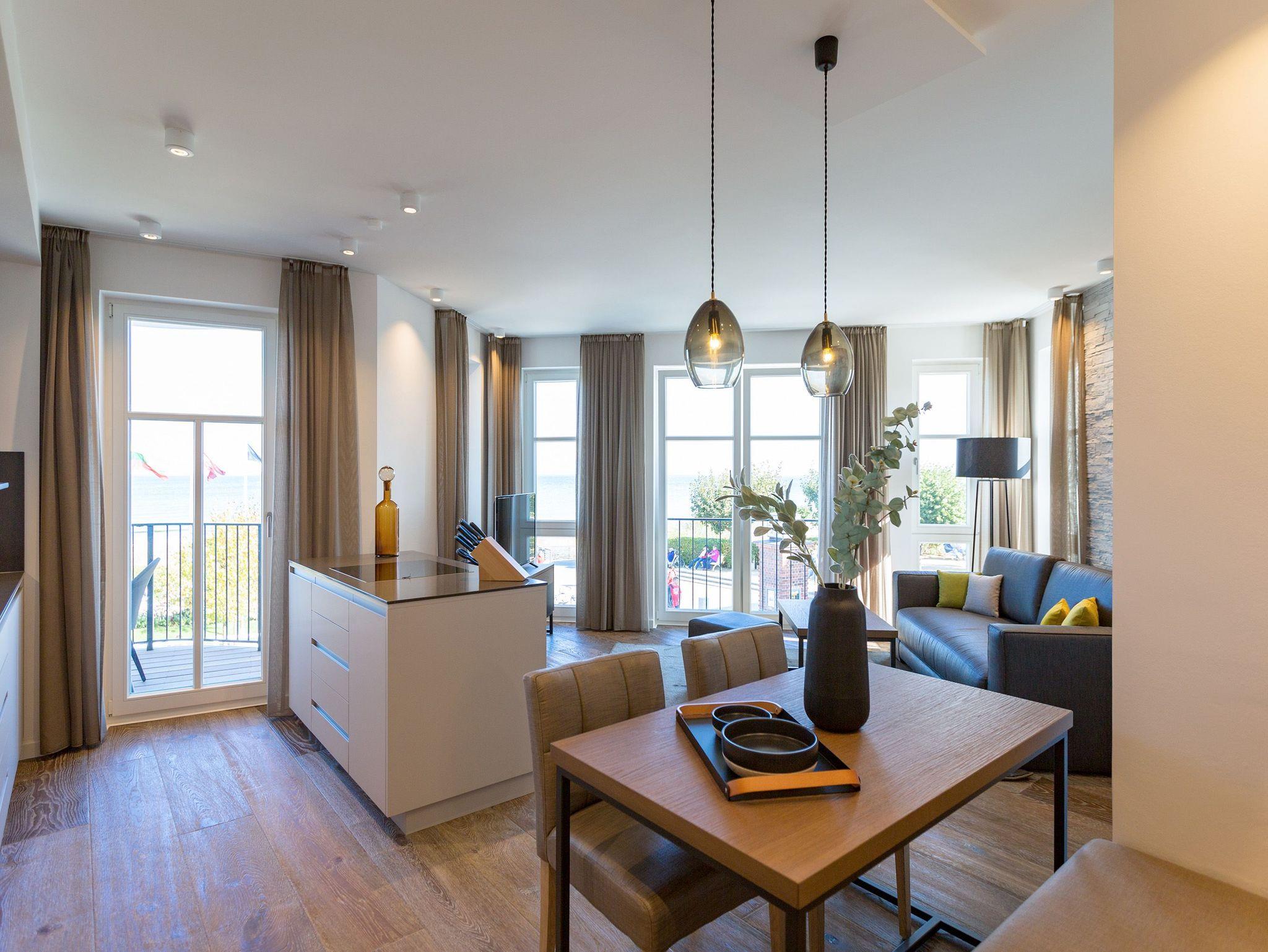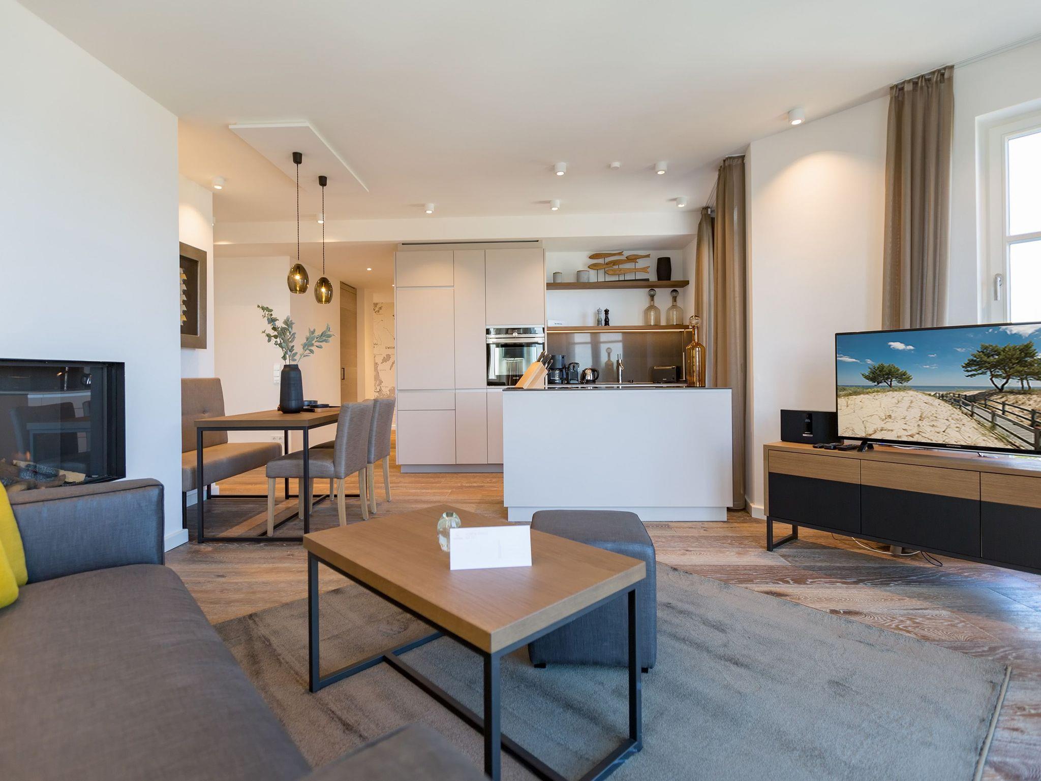 Maritimes Flair mit Seeblick empfängt Sie in den drei Zimmern des Appartements Nummer 2 im 1. Obergeschoss des Beachhouses. Modernster Wohnkomfort gepaart mit der exklusiven Lage dieses Feriendomizils machen die Ostsee-Auszeit für vier Personen und ein Kleinkind bis drei Jahre (im Kinderreisebett) zu einem unvergesslich schönen Erlebnis. Auch Ihr geliebter Vierbeiner ist in dieser Wohnung herzlich willkommen. Insgesamt 79 Quadratmeter groß ist die Wohnung. Und sie ist stilvoll und erlesen eingerichtet. 0815 gibt es hier nicht! Lassen Sie sich schon morgens von der Sonne und dem Rauschen der Ostsee sanft wecken. Aus einem der beiden Schlafzimmer haben Sie einen direkten Blick auf das Meer. Und damit nicht genug. Über den vom Schlafzimmer zugänglichen Balkon (6 Quadratmeter groß) können Sie die frische Ostseebrise denn auch gleich hautnah fühlen. Den Blick schweifen lassen, durchatmen und abschalten: Das ist Urlaub. Übrigens haben beide Schlafzimmer Zugang zu einem Balkon. Der zweite Balkon (8 Quadratmeter groß) schaut südostwärts mitten auf die Einkaufsstraße und das Leben von Bansin hinunter. Ausgestattet mit bequemen Boxspringdoppelbetten (einmal 1,80 m x 2,00 m und einmal 1,60 m x 2,00 m), je einem Flat-TV und geräumigen Schränken bieten Sie Behaglichkeit und ein Rund-um-Sorglos-Gefühl. Das macht sich übrigens im gesamten Appartement breit. Das große und lichtdurchflutete Wohn-Ess-Zimmer ist eine echte Wohlfühlzone mit direktem Blick auf die Ostsee. Das gemütliche Sofa lädt zum Relaxen ein entweder beim Schauen auf das Flammenspiel des gläsernen Gas-Kamins oder beim Schauen eines Films auf dem großen Flat-TV. Zur technischen Ausstattung gehört hier auch eine Hi-Fi-Anlage mit bluetooth-Funktion und kostenloses WLAN. Der schöne Esstisch mit den Stühlen und der Bank ist ideal zum Zusammensitzen. Kochen Sie gemeinsam in der zum Wohnzimmer hin offenen Küche. Die frei stehende Kochinsel ist ein echtes Highlight für Hobbyköche. In den Schränken finden Sie erlesenes Geschirr. Und die Küchenzeile ist mit hochwertigen Markengeräten voll ausgestattet. Ihr Feriendomizil verfügt über zwei Bäder. Eines ist ausschließlich von einem der beiden Schlafzimmer aus zugänglich. Beide sind jedoch mit einer schönen, großen und ebenerdigen Regendusche, einem Waschtisch und einem WC ausgestattet. Im Masterbad befindet sich zudem eine Finnische Sauna, die Sie kostenfrei nutzen können. In einem Hauswirtschaftsraum befindet sich ein Waschtrockner. Kommen Sie also einfach an und entspannen Sie. Die Betten haben wir für Sie bereits bezogen und auch Handtücher liegen für Sie bereit. In der modernen Tiefgarage ist für Sie der Stellplatz Nr. 2 im Doppelparker oben (max. Höhe 1,90m, max. Länge 5,10 m, max. Breite 2,50 m, max. Last 2.600 kg) reserviert.