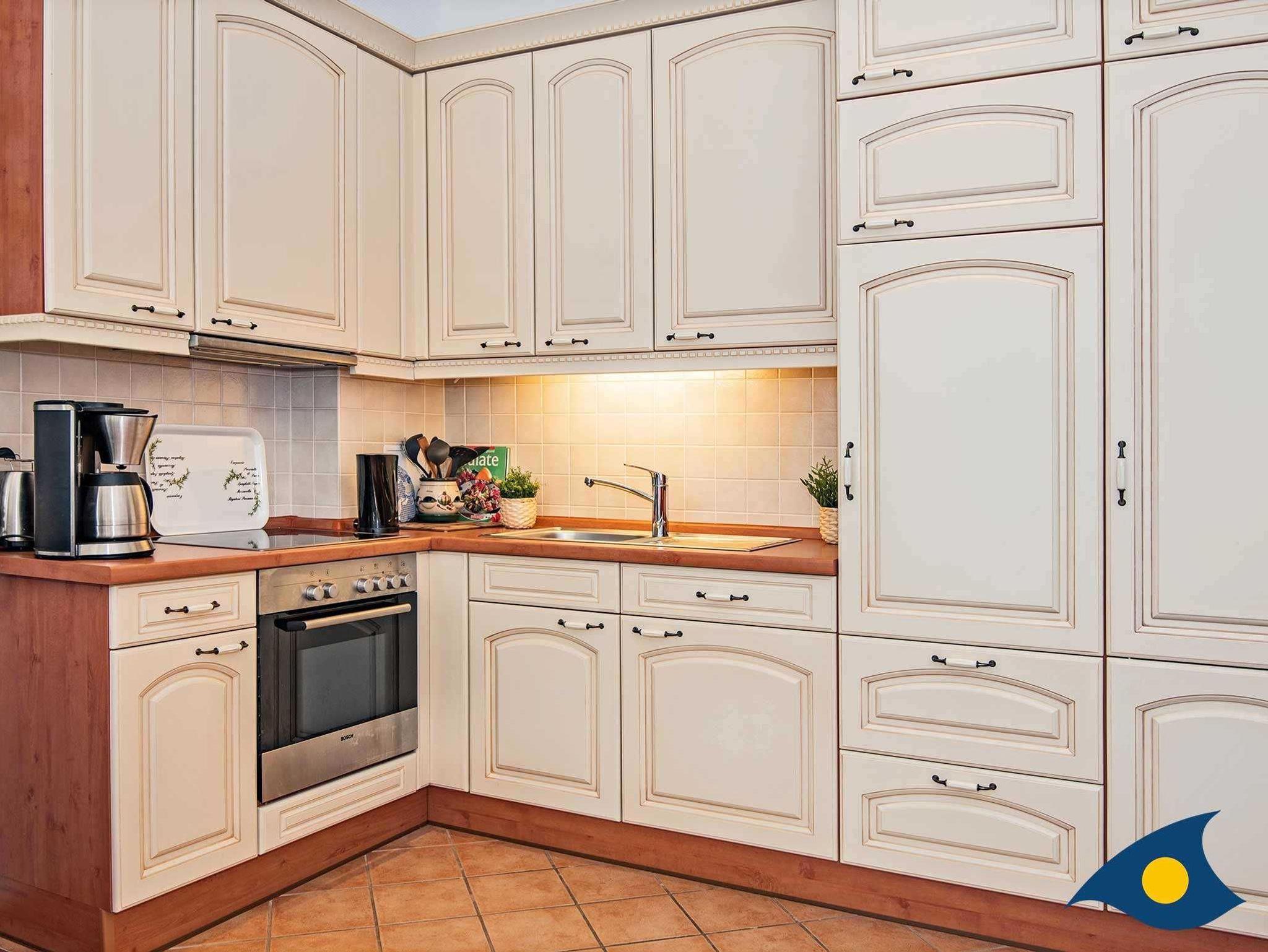 Die Küchenzeile ist im Wohnzimmer integriert und beherbergt viele nützliche Dinge für die tägliche Selbstverpflegung. Der Essplatz in der Loggia bietet Ihnen einen herrlichen Ausblick auf die angrenzenden Villen und den Buchenpark.