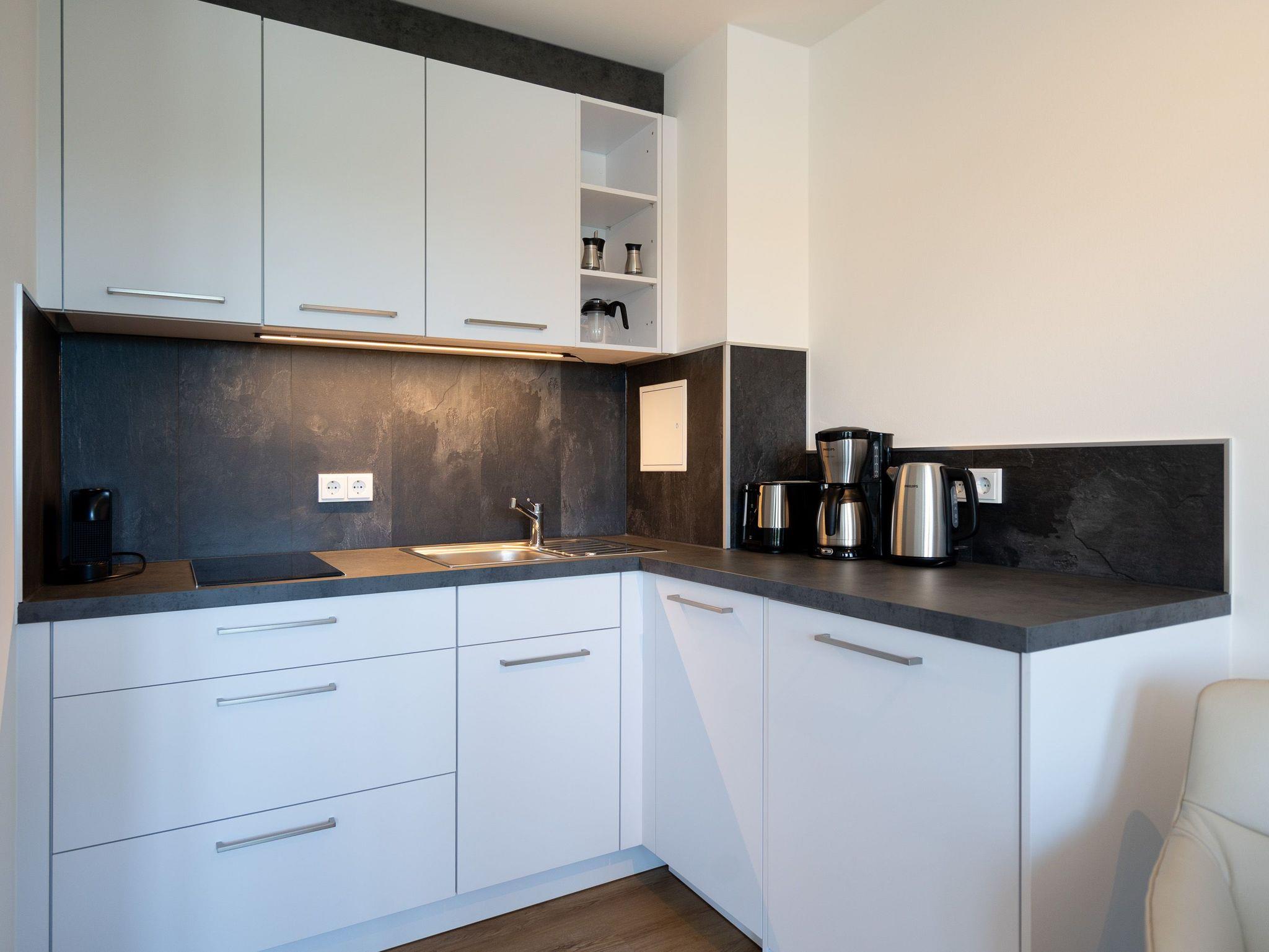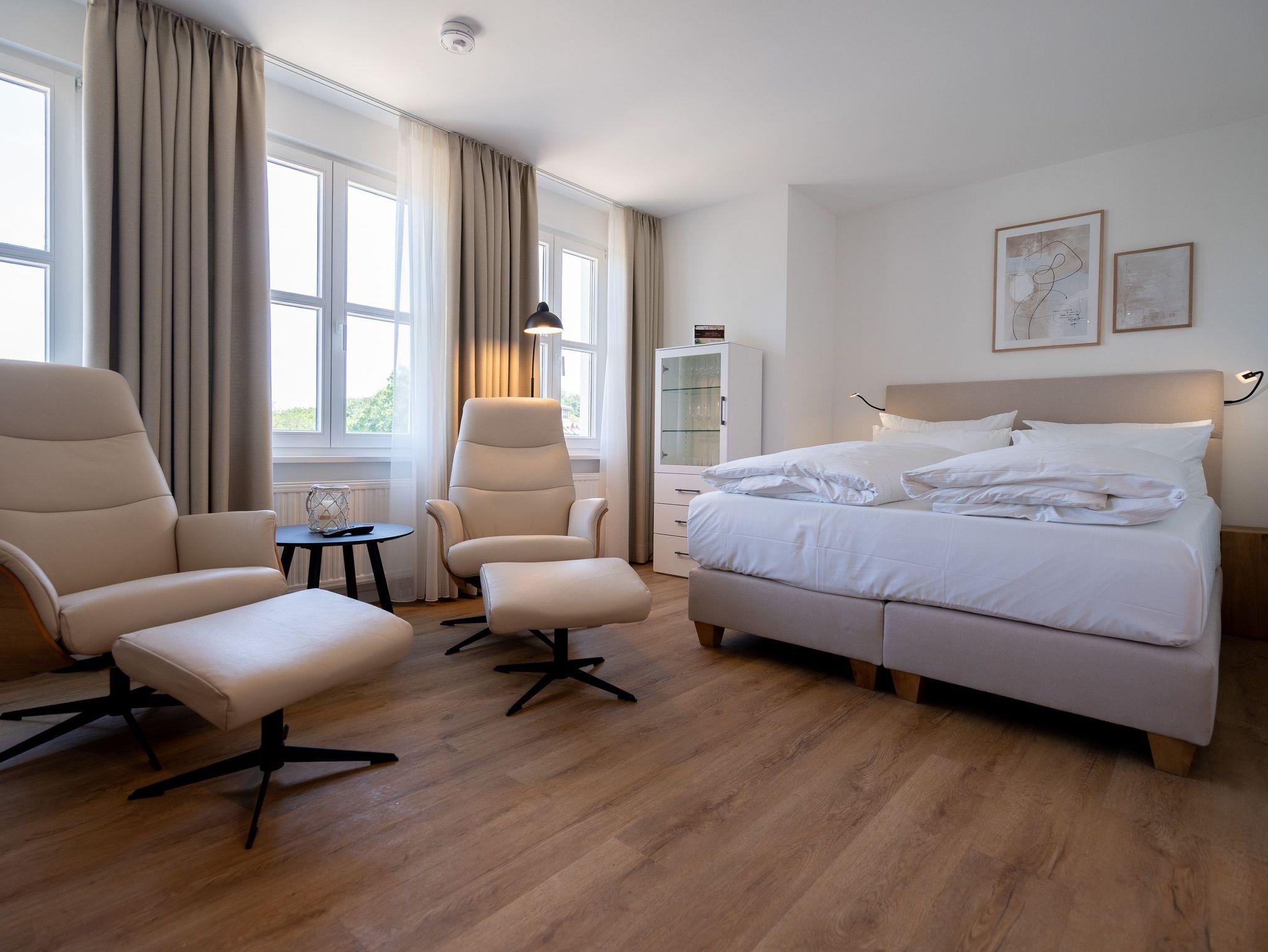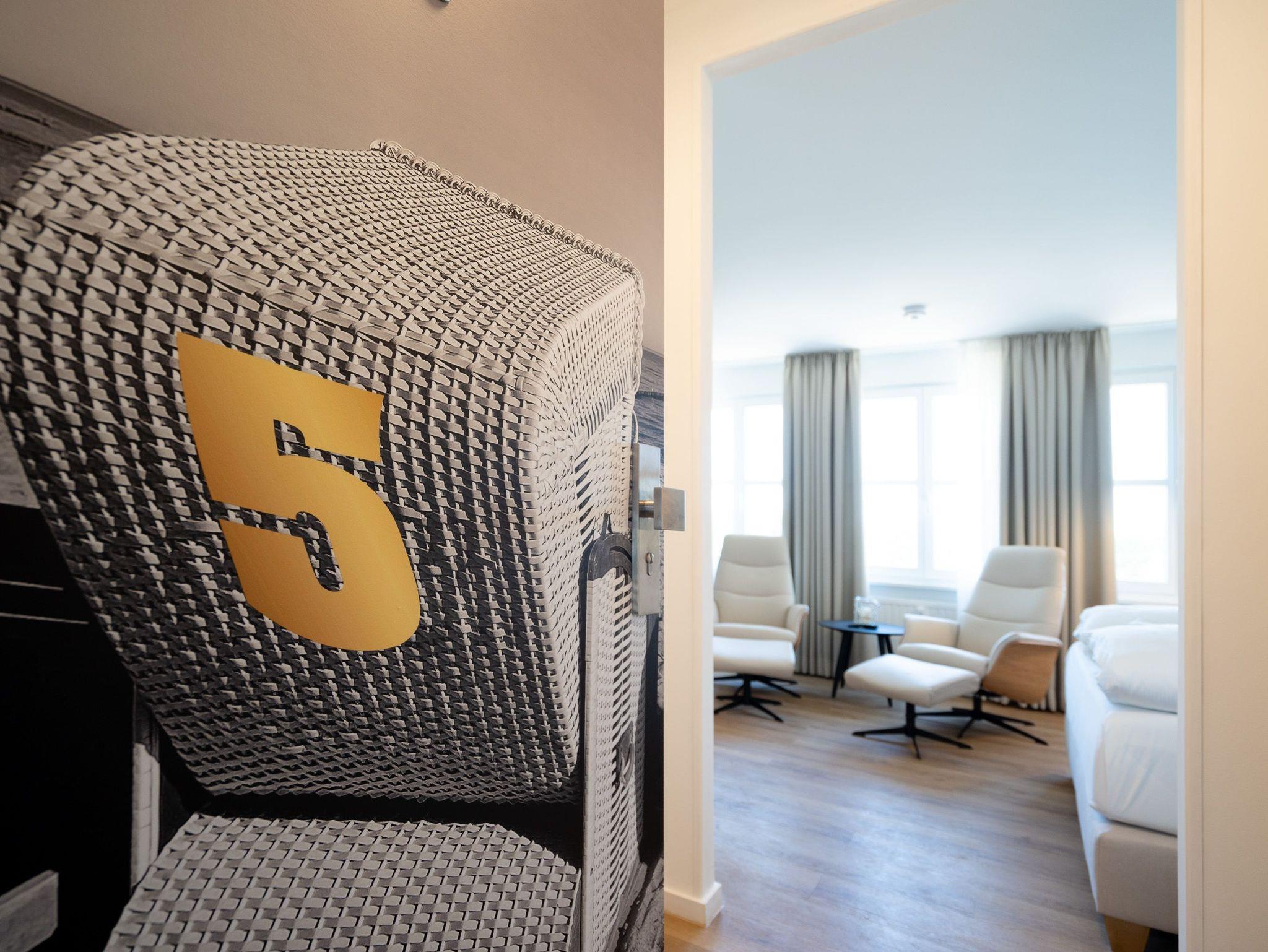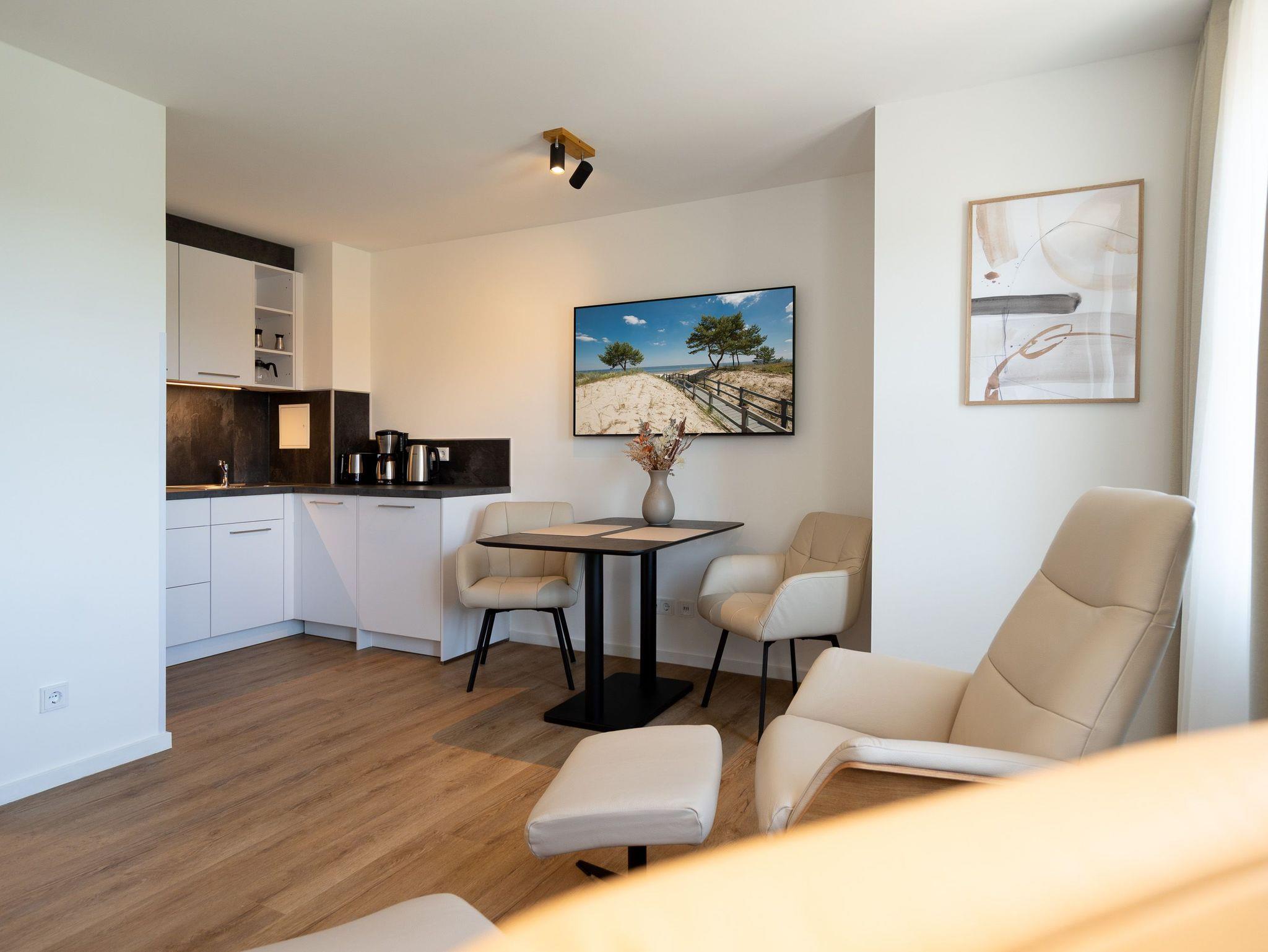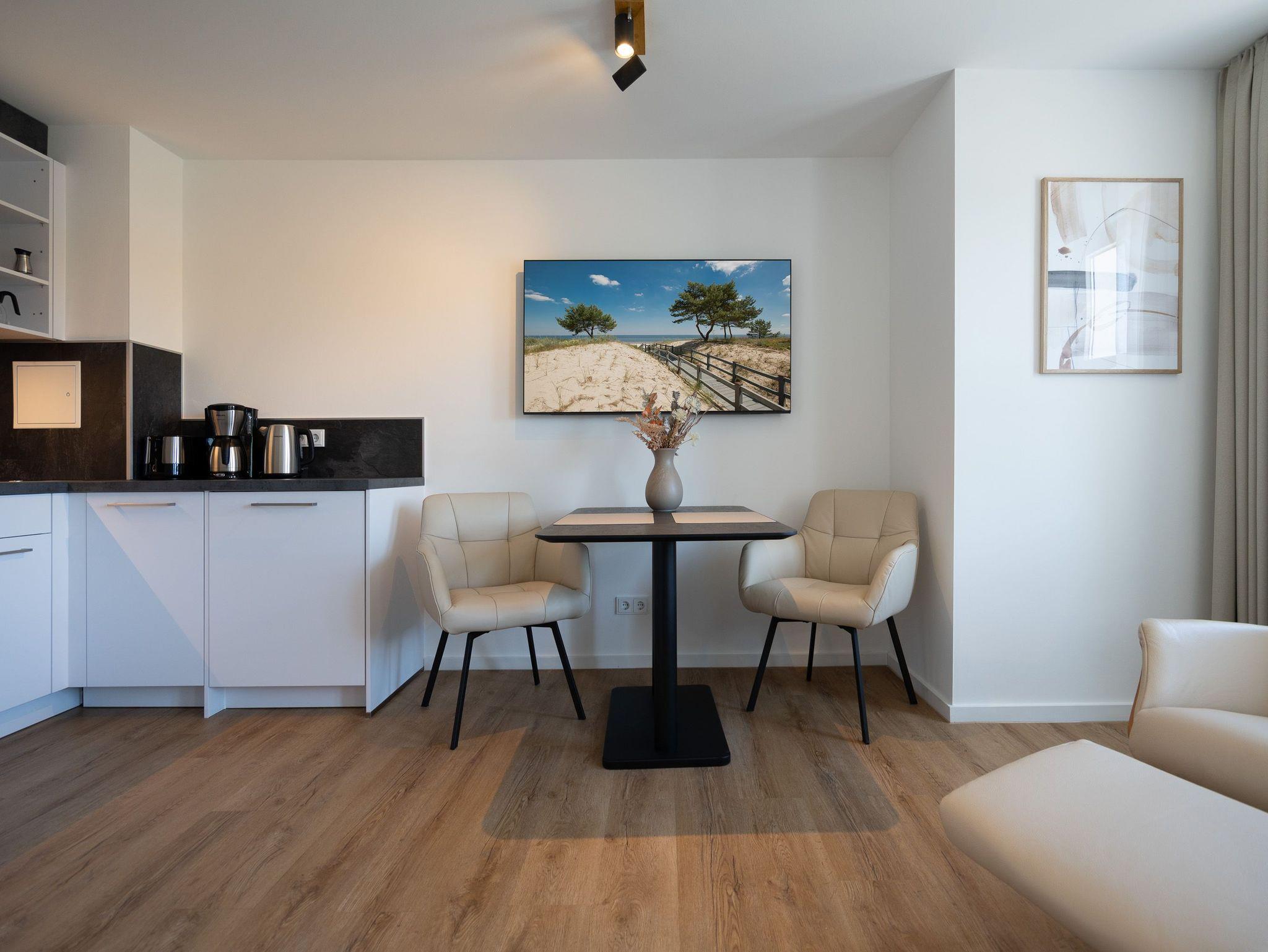 Kompakt, stilvoll, durchdacht ? 1-Raum-Appartement Nr. 5 für zwei in der 2. Etage.Dieses liebevoll eingerichtete 1-Raum-Appartement in der 2. Etage bietet auf 28?m² eine clevere Kombination aus Funktionalität und Wohlfühlambiente ? ideal für Paare oder Alleinreisende, die Wert auf Komfort legen. Der offene Wohnbereich ist hell und freundlich gestaltet. Die moderne Küchenzeile ist ausgestattet mit 2-Platten-Cerankochfeld, Spülmaschine, Kühlschrank mit Gefrierfach und Nespresso-Kapselmaschine ? ideal für den ersten Kaffee am Morgen oder das schnelle Abendessen. Der gemütliche Essplatz für zwei lädt zum Verweilen ein. Für entspannte Stunden stehen zwei komfortable Relaxsessel mit Hocker bereit, begleitet von einem 55-Zoll-Flat-TV ? falls das Meer mal Pause hat. Das hochwertige Boxspringdoppelbett (1,60?m x 2,00?m) sorgt für erholsamen Schlaf, während der Kleiderschrank ausreichend Stauraum für Ihre Urlaubsgarderobe bietet. Das kompakte Bad mit Dusche (0,85m x 0,70m), Waschtisch und WC ist gepflegt und funktional ? alles drin, alles dran. Ein fester PKW-Stellplatz (Nr.?5) befindet sich direkt vor dem Haus, kostenfreies WLAN ist selbstverständlich inklusive. Ein durchdachtes Refugium für alle, die es klar, gemütlich und komfortabel mögen ? willkommen in Ihrer kleinen Auszeit.