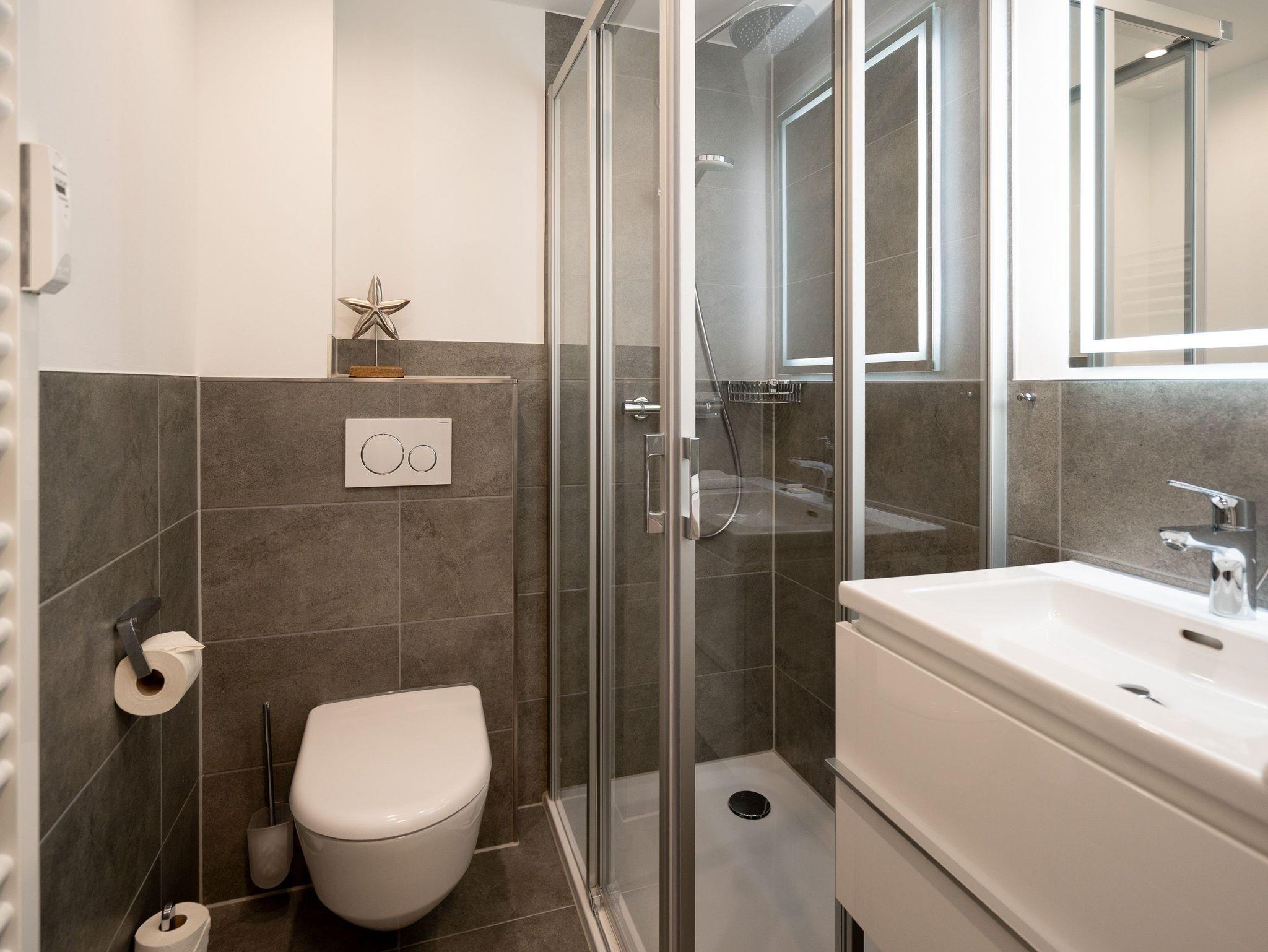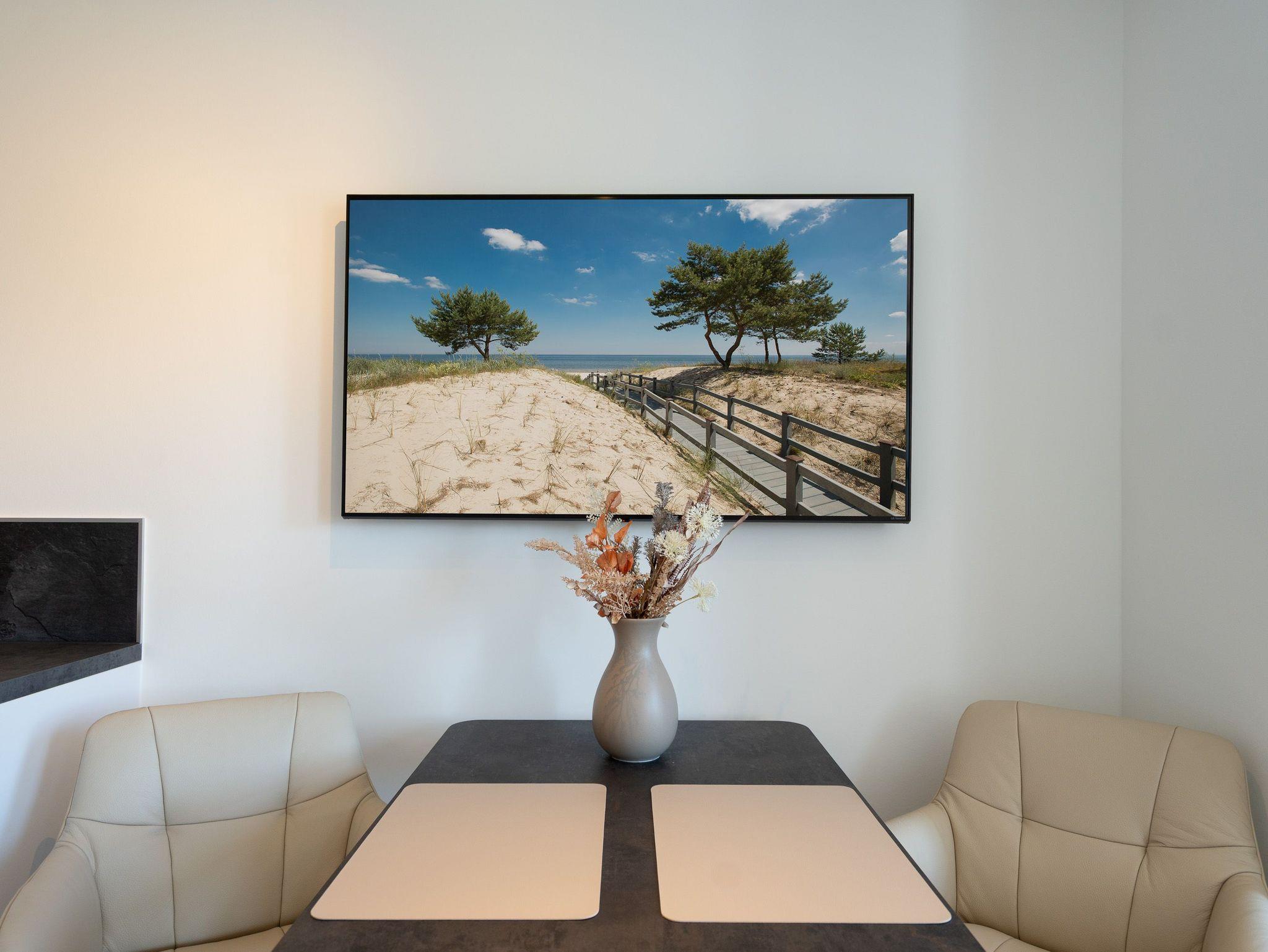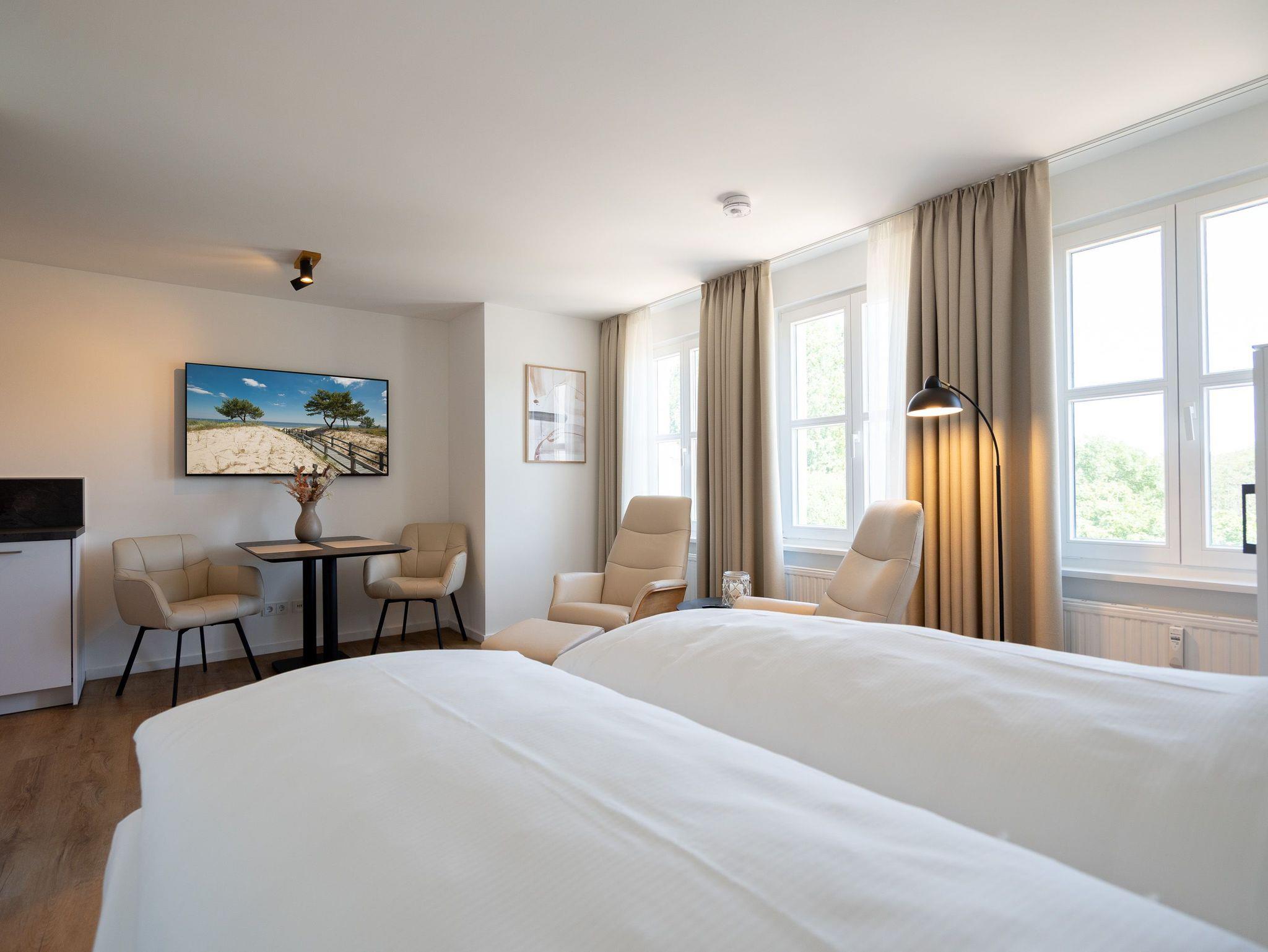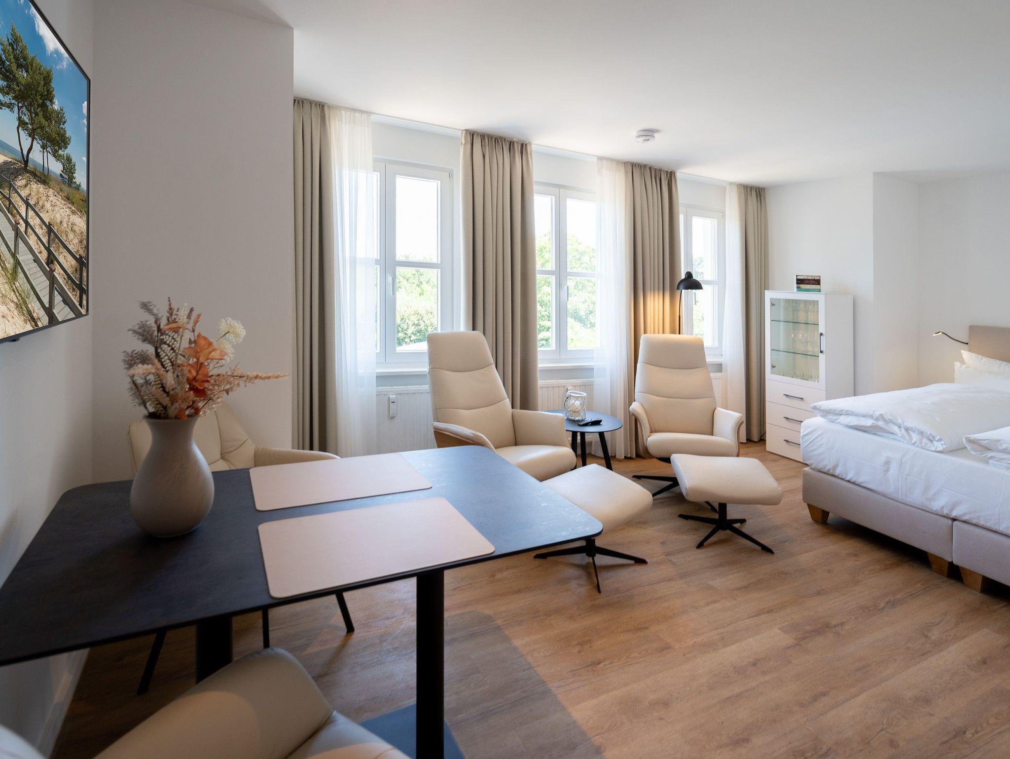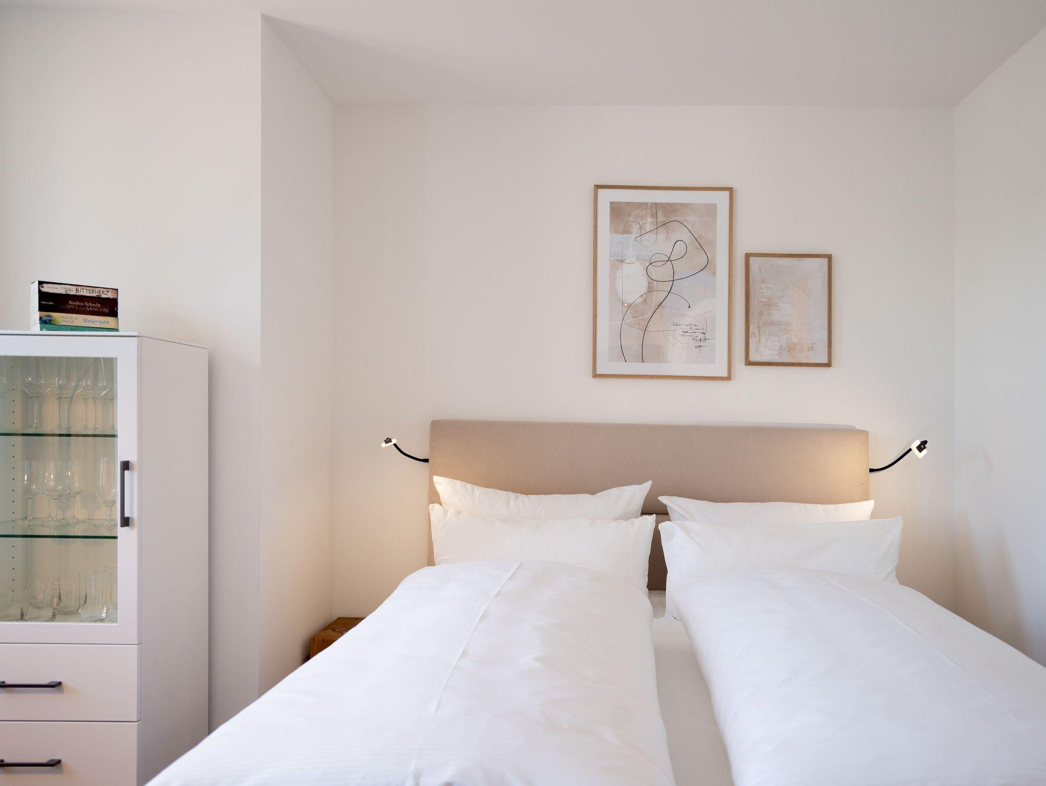 Kompakt, stilvoll, durchdacht ? 1-Raum-Appartement Nr. 5 für zwei in der 2. Etage.Dieses liebevoll eingerichtete 1-Raum-Appartement in der 2. Etage bietet auf 28?m² eine clevere Kombination aus Funktionalität und Wohlfühlambiente ? ideal für Paare oder Alleinreisende, die Wert auf Komfort legen. Der offene Wohnbereich ist hell und freundlich gestaltet. Die moderne Küchenzeile ist ausgestattet mit 2-Platten-Cerankochfeld, Spülmaschine, Kühlschrank mit Gefrierfach und Nespresso-Kapselmaschine ? ideal für den ersten Kaffee am Morgen oder das schnelle Abendessen. Der gemütliche Essplatz für zwei lädt zum Verweilen ein. Für entspannte Stunden stehen zwei komfortable Relaxsessel mit Hocker bereit, begleitet von einem 55-Zoll-Flat-TV ? falls das Meer mal Pause hat. Das hochwertige Boxspringdoppelbett (1,60?m x 2,00?m) sorgt für erholsamen Schlaf, während der Kleiderschrank ausreichend Stauraum für Ihre Urlaubsgarderobe bietet. Das kompakte Bad mit Dusche (0,85m x 0,70m), Waschtisch und WC ist gepflegt und funktional ? alles drin, alles dran. Ein fester PKW-Stellplatz (Nr.?5) befindet sich direkt vor dem Haus, kostenfreies WLAN ist selbstverständlich inklusive. Ein durchdachtes Refugium für alle, die es klar, gemütlich und komfortabel mögen ? willkommen in Ihrer kleinen Auszeit.