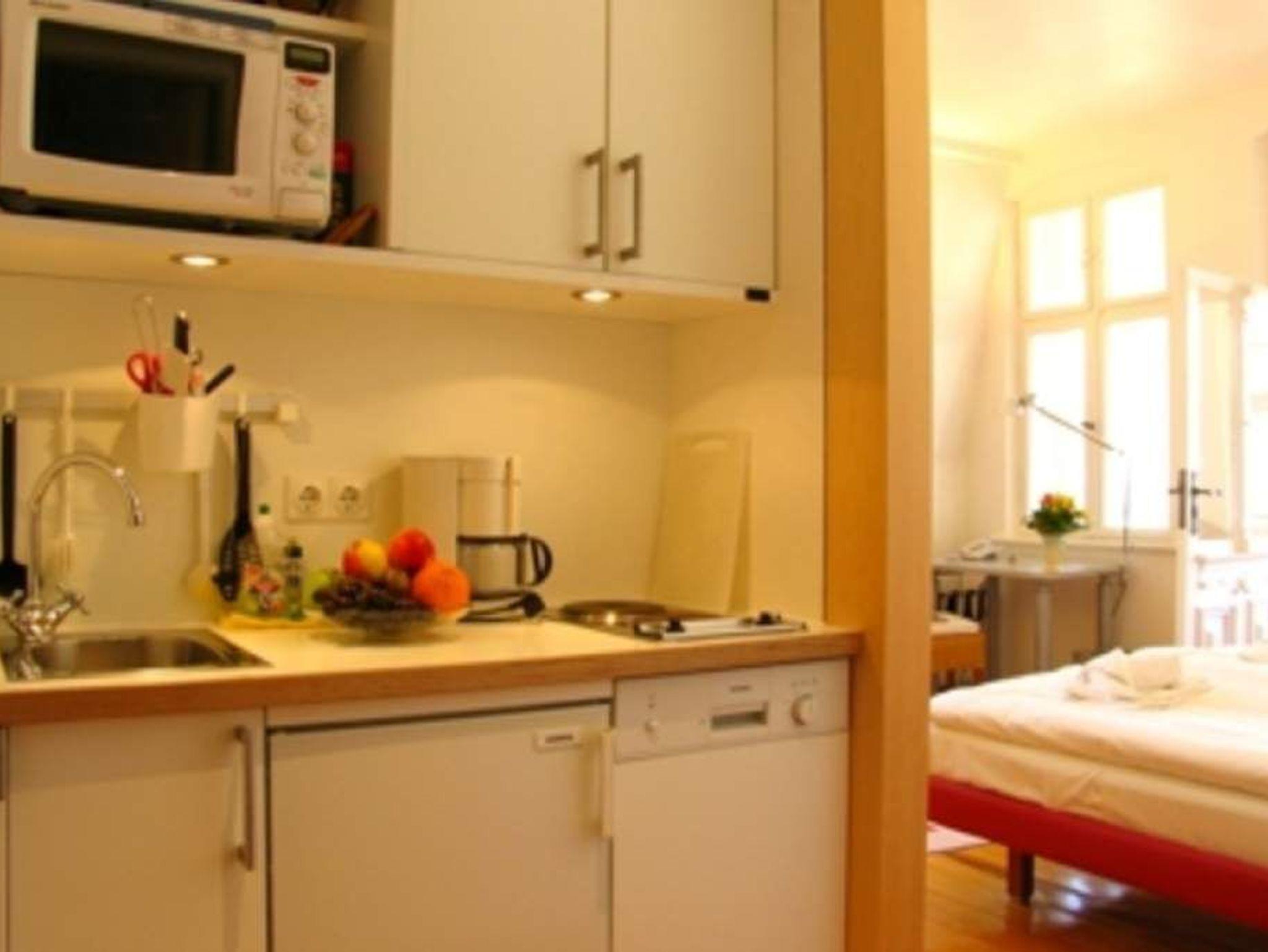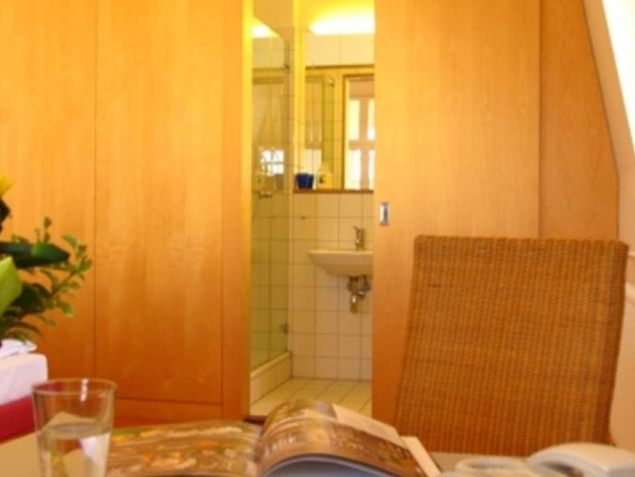 Durch fünf Fenster erhellt das klare Licht des Nordens diese Räume. Die Ostsee ist von fast jedem Platz in der Wohnung zu sehen, am schönsten jedoch ohne Frage von der Veranda aus, denn hier kann man es sich so richtig gemütlich machen. Vom Teetisch oder auch vom Sofa lässt es sich hier herrlich versonnen auf das Meer blicken. Im Schlaf- und Wohnzimmer gibt es einen Schreibtisch mit Arbeitslampe und ein geräumiges Doppelbett. Die kleine Küchenzeile komplettiert das Appartement.