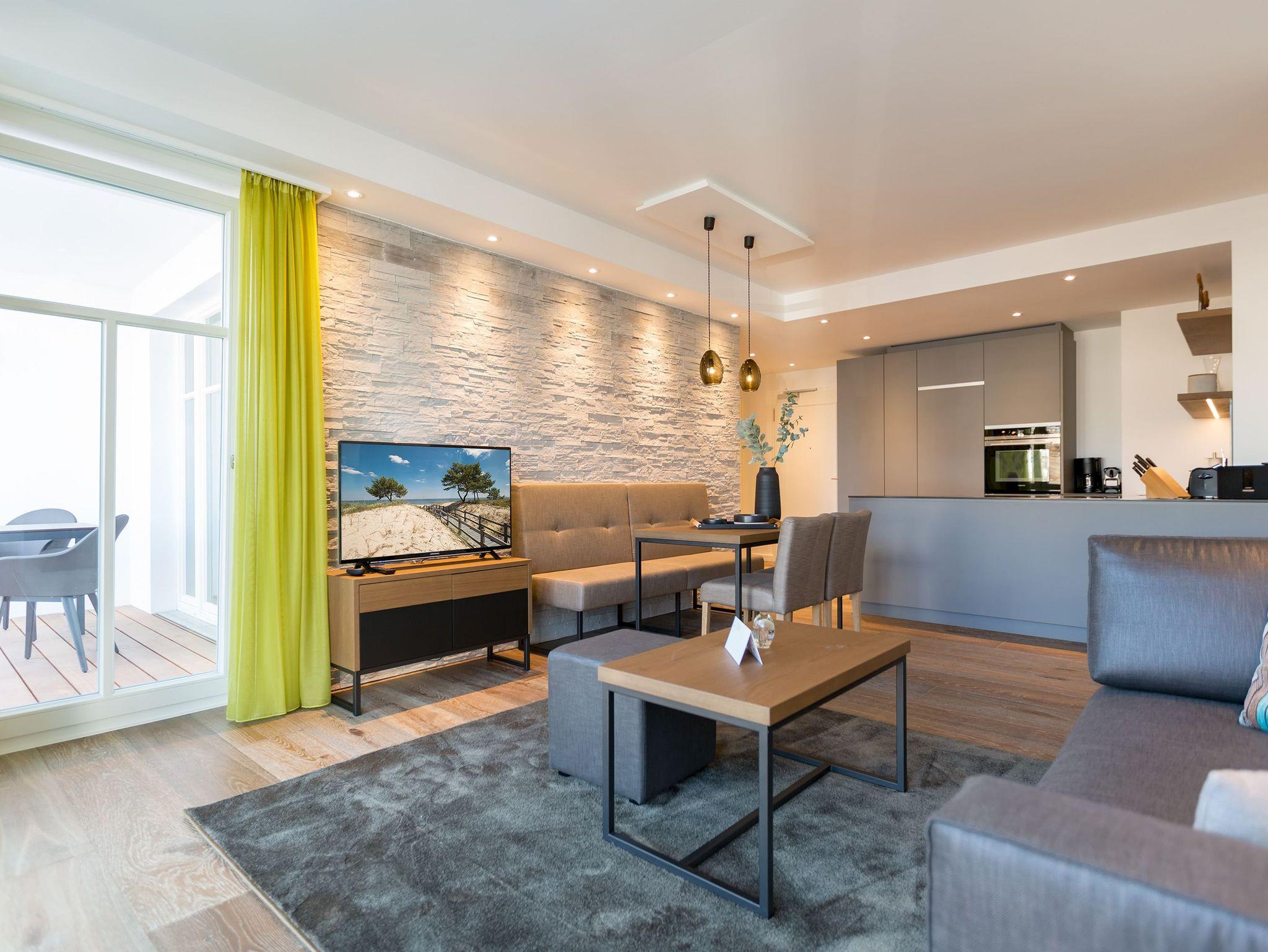 Ein kuscheliges Urlaubsparadies für Zwei wartet im 2. Stock des Beachhouses nur darauf, Ihnen unvergessliche Stunden zu zaubern, in der Sie neue Energie tanken und allen Stress einmal getrost vergessen dürfen. Auf 51 Quadratmetern verführt Sie ein exklusives und stylisches Ambiente zu wahren Urlaubsträumen. Das Zwei-Raum-Appartement wurde von Designerhand konzipiert und mit hochwertigen und ausgewählten Möbeln eingerichtet. Freizügigkeit und Exklusivität waren die Leitgedanken. Es empfängt Sie ein harmonisches Raumkonzept, aus dem Sie am liebsten gar nicht wieder ausziehen wollen. Und das alles in unmittelbarer Nähe zur Ostsee. Vom Balkon (6 Quadratmeter groß) aus können Sie Richtung Nord-West den weiten Blick über das endlose Blau ungehindert genießen. Auf den dazu gehörenden Möbeln lauschen Sie schon zum Frühstück dem Wellenrauschen. Das Wohn-Ess-Zimmer ist geräumig und bietet reichlich Platz für gemeinsame Mußestunden vor dem Gas-Kamin, auf der bequemen Couch oder am schönen Esstisch. Kochen können Sie in der offenen Wohnküche nach Herzenslust. Denn sämtliche Gerätschaften und Utensilien bis hin zum erlesenen Geschirr sind darin zu finden. Das WLAN zum Download diverser Lieblingsgerichte ist kostenfrei. Über die hochwertige Bose-Anlage mit Bluetooth-Funktion ist auch die Lieblingsmusik ein echter Hörgenuss. Zwei Flat-TVs im Wohnzimmer und im Schlafzimmer dienen der Unterhaltung. Apropos Schlafzimmer. Dieser wunderschöne und helle Raum ist nicht nur zum traumreichen Schlafvergnügen bestens geeignet. Sein großes und komfortables Boxspringdoppelbett (1,80 m x 2,00 m) ist für alle entspannenden Tätigkeiten wunderbar geeignet. Da das Schlafzimmer ebenfalls einen Zugang zum Balkon hat, können Sie schon, kaum dass Sie die Augen geöffnet haben, Ostseeweite genießen. Im Badezimmer befindet sich neben einer großzügig geschnittenen Regendusche, einem Waschtisch und einem WC eine Finnische Sauna. Da werden selbst ungemütliche Tage auf Usedom zu entspannenden Auszeitstunden. Handtücher liegen für Sie bereit und die Betten sind bei Ihrer Anreise bezogen. In einem kleinen Hauswirtschaftsraum steht ein Waschtrockner, in dem Sie Ihre Urlaubsgarderobe waschen können. In der modernen Tiefgarage ist für Sie der Stellplatz Nr. 17 im Doppelparker unten (max. Höhe 1,85 m, max. Länge 5,10 m, max. Breite 2,50 m, max. Last 2.600 kg) reserviert.