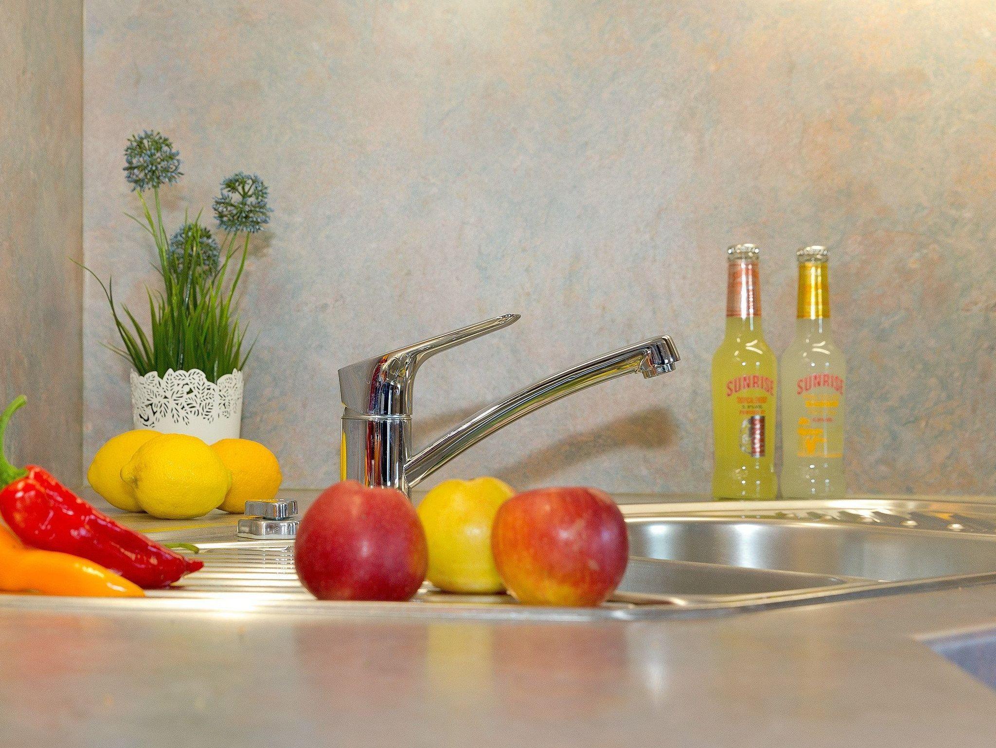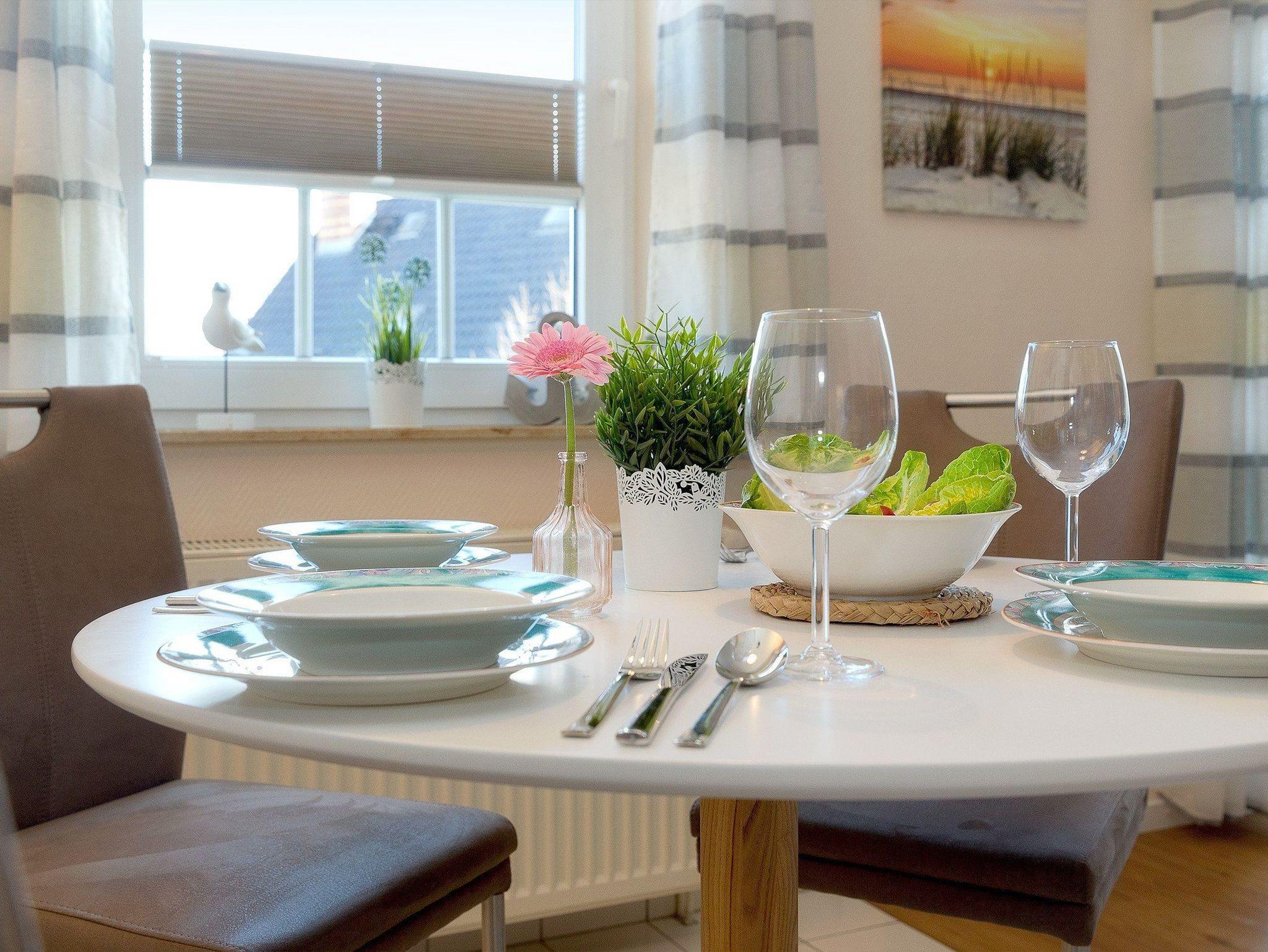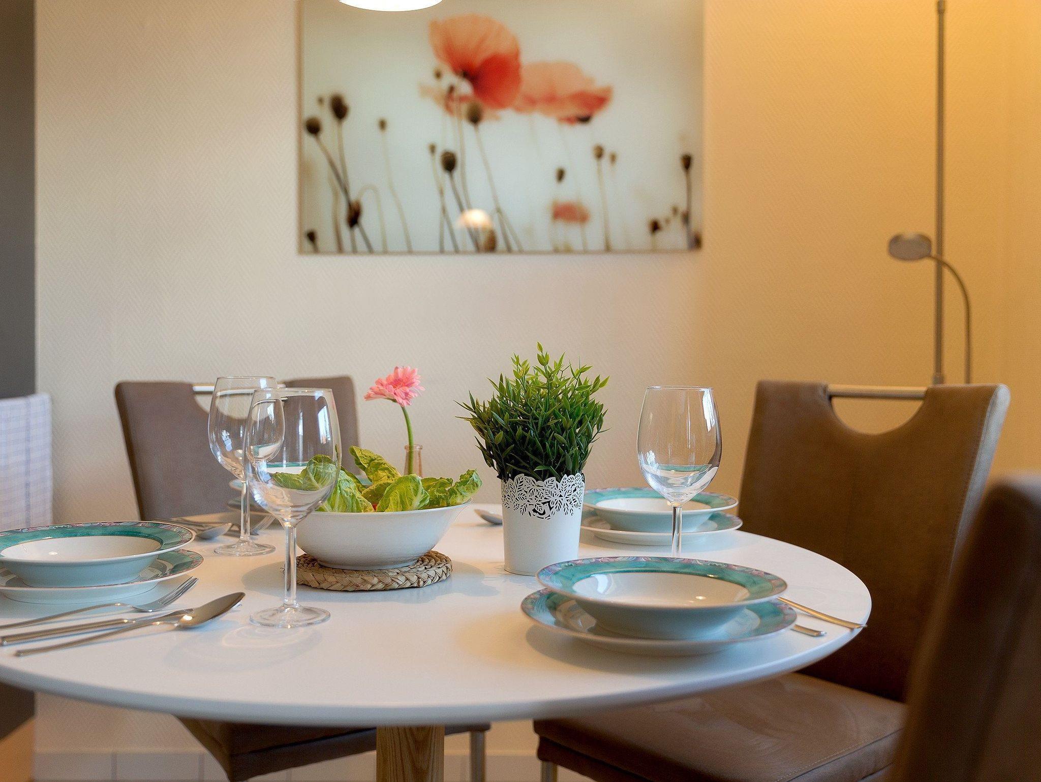 Im ersten Obergeschoss des Hauses begrüßen wir Sie, Dank der warmen Farbgebung, in wohliger Atmosphäre auf 45 Quadratmetern zur schönsten Zeit des Jahres, Ihrer Urlaubszeit. Der gemütlich gestaltete Wohn- und Essbereich lädt dank bequemer Couch und zwei Sesseln sowie Esstisch mit Sitzgelegenheit für bis zu vier Personen zum gemütlichen Beisammensein ein. Die gut ausgestattete Küche (Geschirrspüler, Kühlschrank m. Gefrierfach, Wasserkocher, Toaster, Kaffeemaschine, Tassimo-Automat, Mikrowelle, Kochfeld) lässt das Kochherz höher schlagen. So können Sie sich auch im Urlaub jederzeit eine Ihrer Lieblingsspeisen im Nu zubereiten. Lassen Sie den Abend entspannt im Anschluss vor dem Flat TV ausklingen.