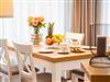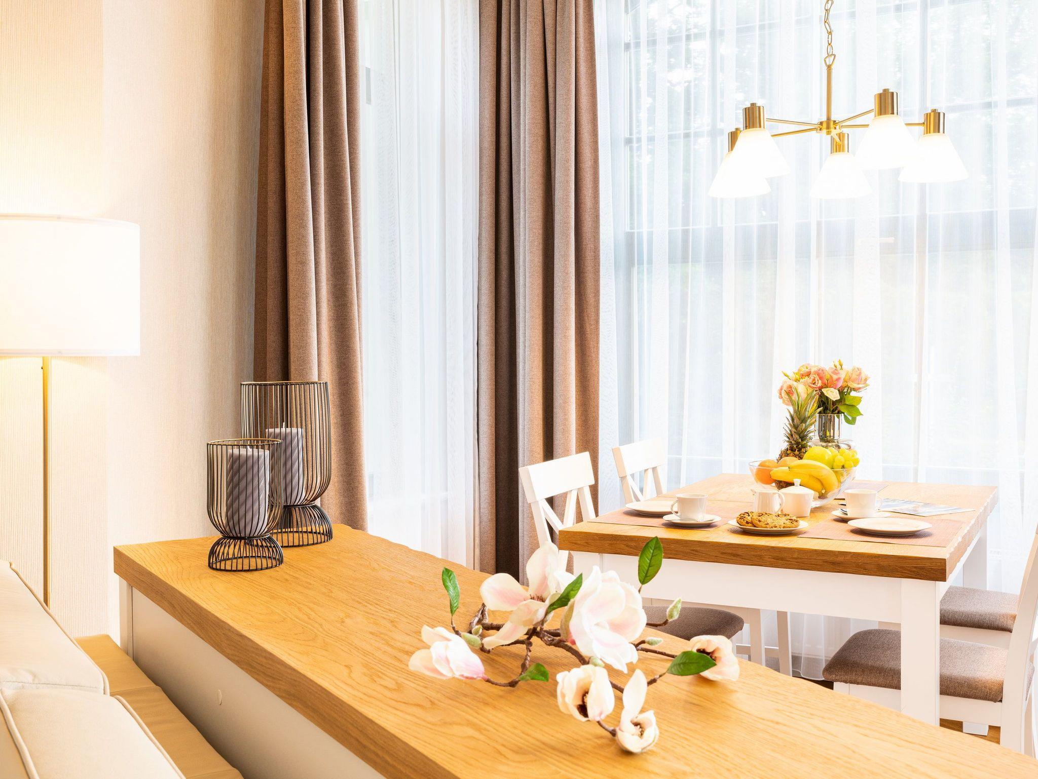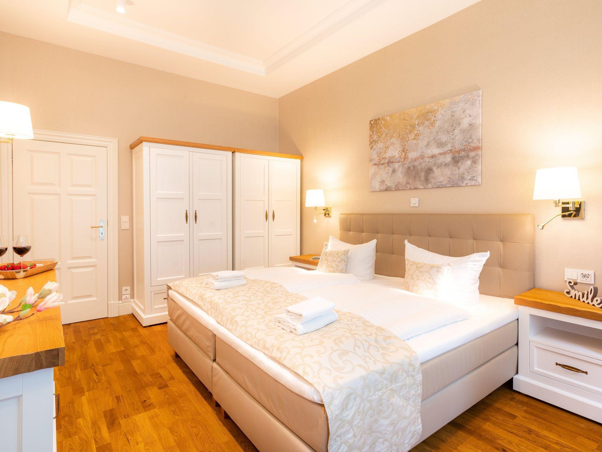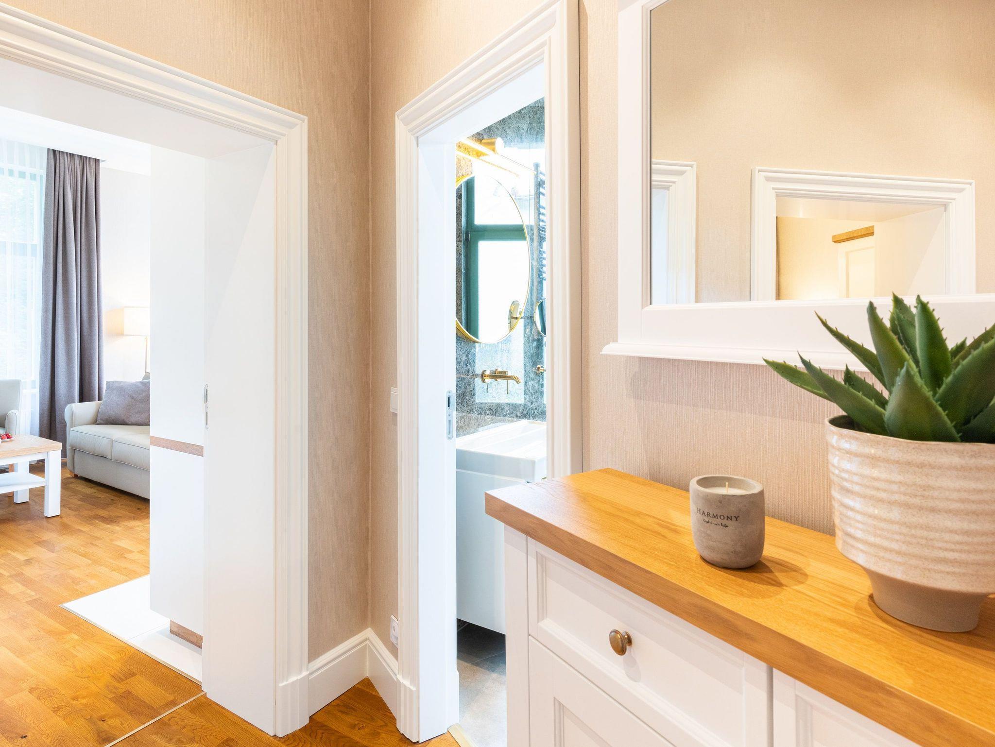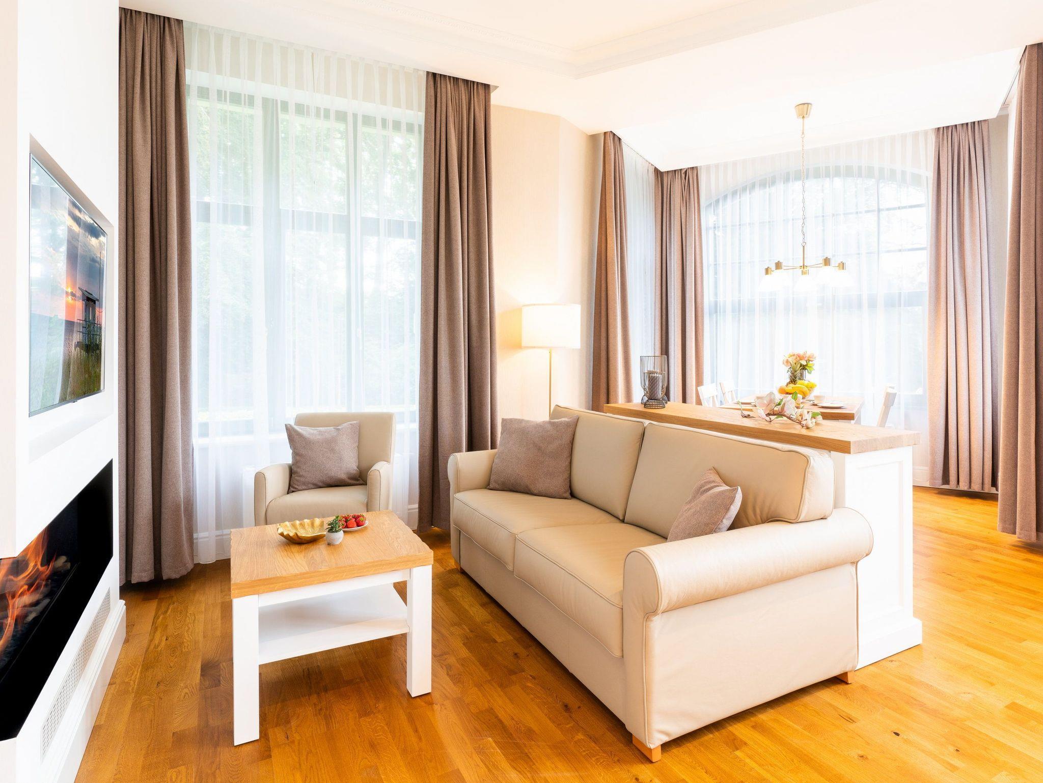 Ein ein großzügiger Wohnbereich mit einem exklusiven Gaskamin erwartet Sie bereits, sodass Sie eine angenehme Wohlfühlatmosphäre das gesamte Jahr über genießen. Eine bequeme Couchgarnitur und ein Flat TV runden den Komfort perfekt ab und laden zum Entspannen und Füße hochlegen ein. Das helle Zwei-Zimmer-Appartement hat eine Größe von 60 Quadratmetern und liegt im Hochparterre der Villa Waldschloss. Die vollausgestattete Küche, welche speziell von einem einheimischen Tischler angefertigt wurde, ergänzt die Annehmlichkeiten dieses neuen Appartements mit allen Raffinessen: Backofen, Mikrowelle, Kühlschrank mit Gefrierfach, Toaster, Wasserkocher, Kaffeemaschine sowie einem Essplatz für 4 Personen mit Blick in den gegenüberliegenden Park. Echtholzparkett im Wohn- und Schlafraum, unkaputtbare Tapeten aus Amerika. Bei der Umgestaltung wurde nichts dem Zufall überlassen.