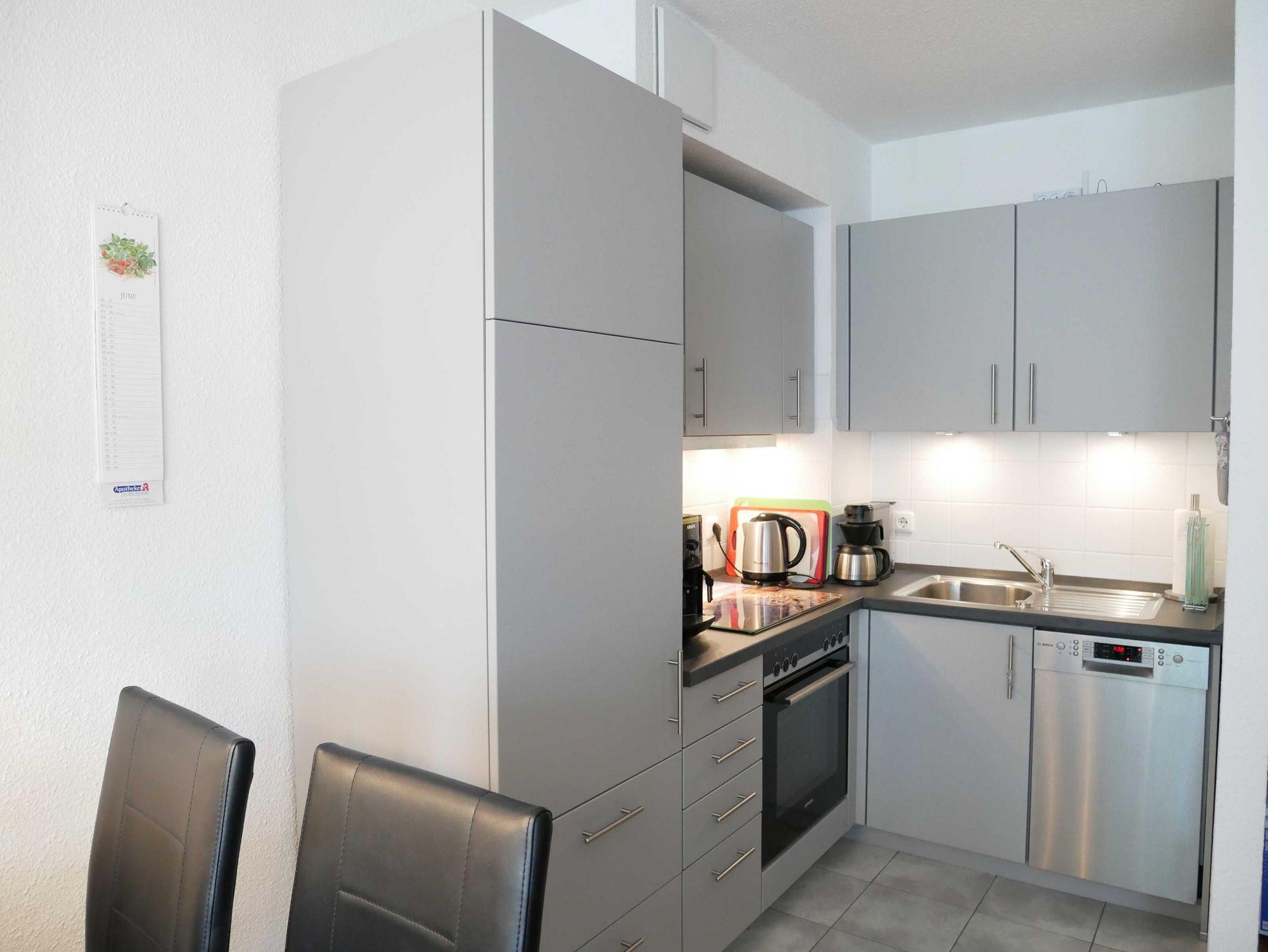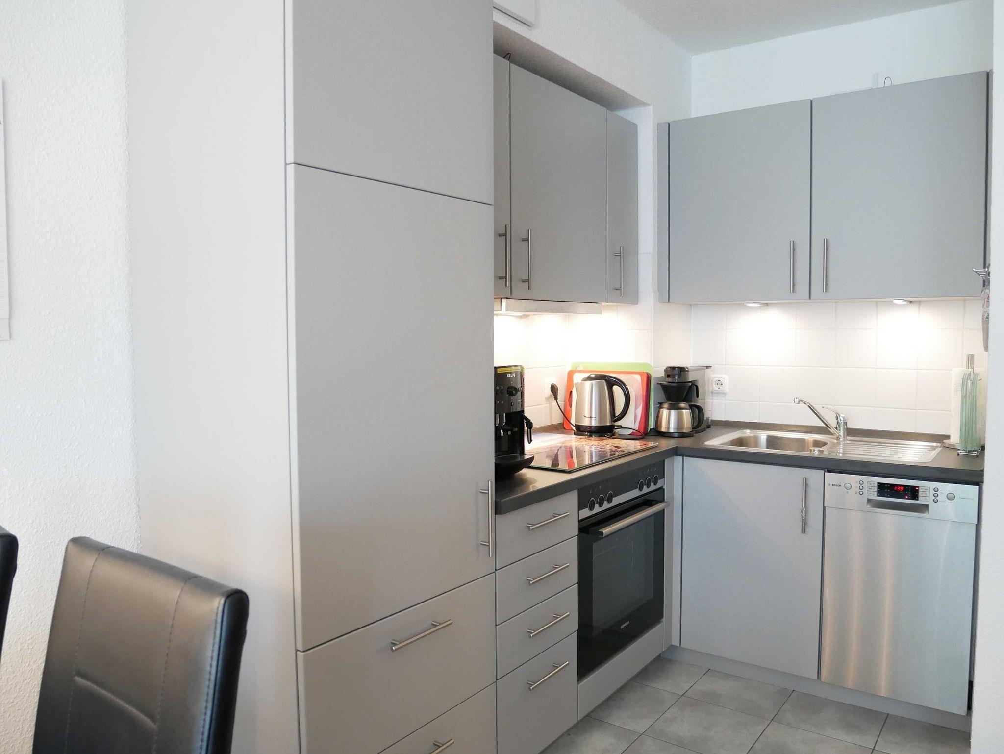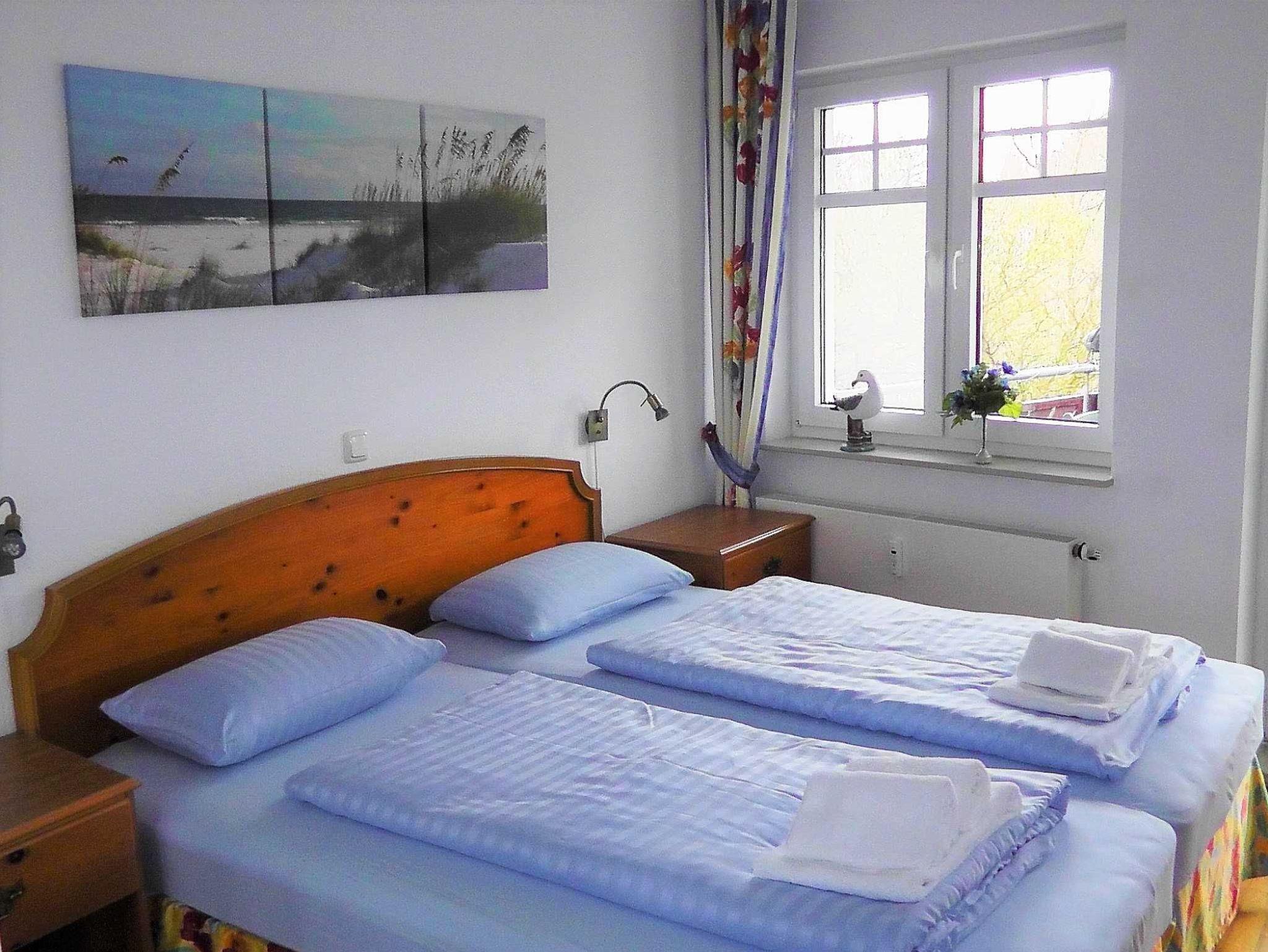 Die moderne, helle NICHTRAUCHER-3-Raum-Ferienwohnung befindet sich im 1. OG. und verfügt über einen sonnigen Balkon zur Südseite. Es erwartet Sie ein gemütlicher Wohn-Essbreich mit Smart-TV , Radio mit CD-Player und DVD-Player. Im Wohnbereich befindet sich auch die offene Wohnküche mit Geschirrspüler, Cerankochfeld, Backofen, Kühl-/Gefrierkombination, Mikrowelle, Kaffeevollautomaten, Toaster, Wasserkocher und Kochgeschirr. Gut schlafen werden Sie in den zwei separaten Schlafzimmern ( 1 x Doppelbett mit Flat-TV und 1 x zwei Einzelbetten). Das Bad ist mit Dusche, WC und Fön ausgestattet. Der Fußboden besteht aus Echtholz-Streifenparkett. Die Erstausstattungen Bettwäsche und Handtücher sind im Preis enthalten.