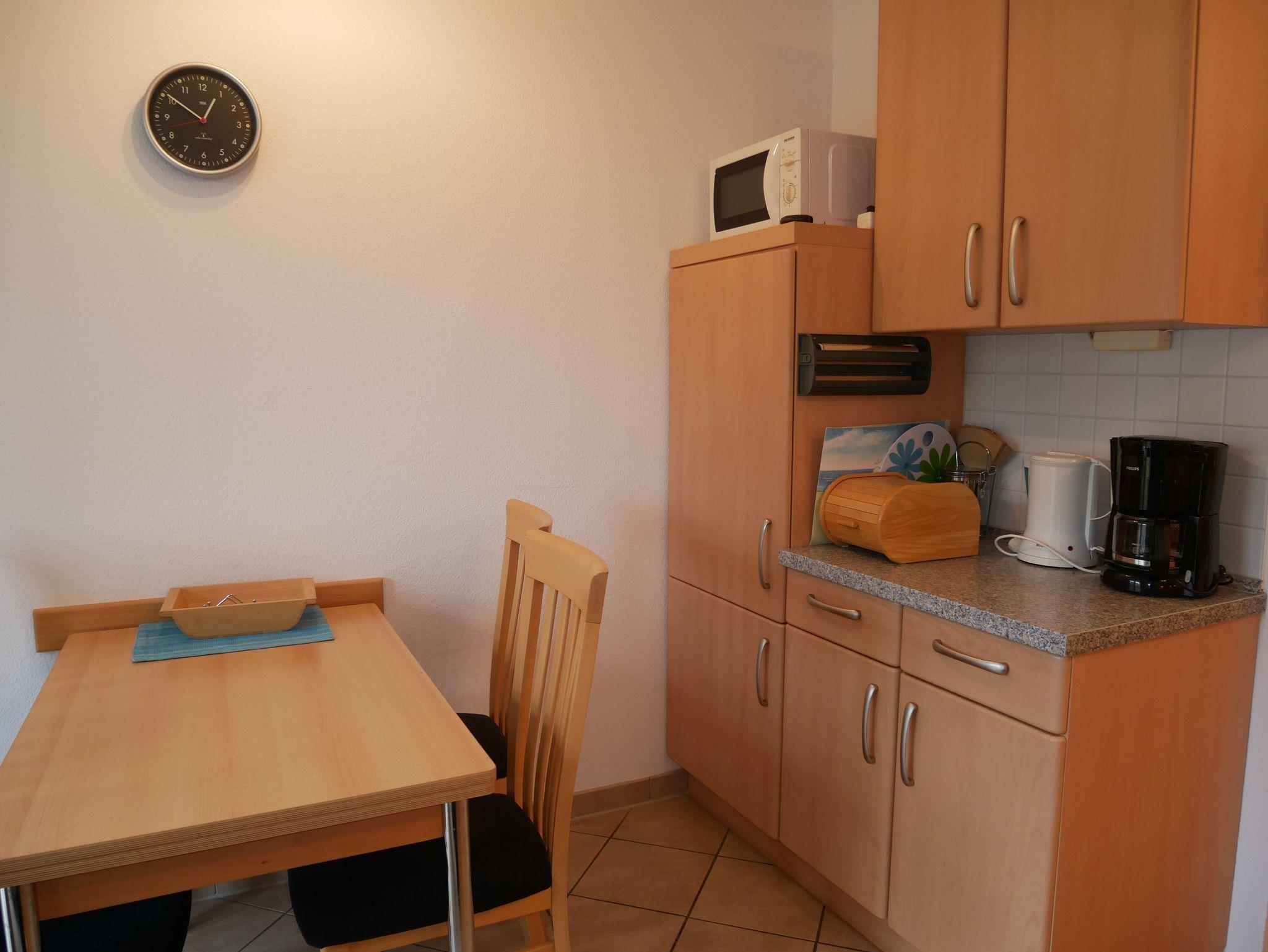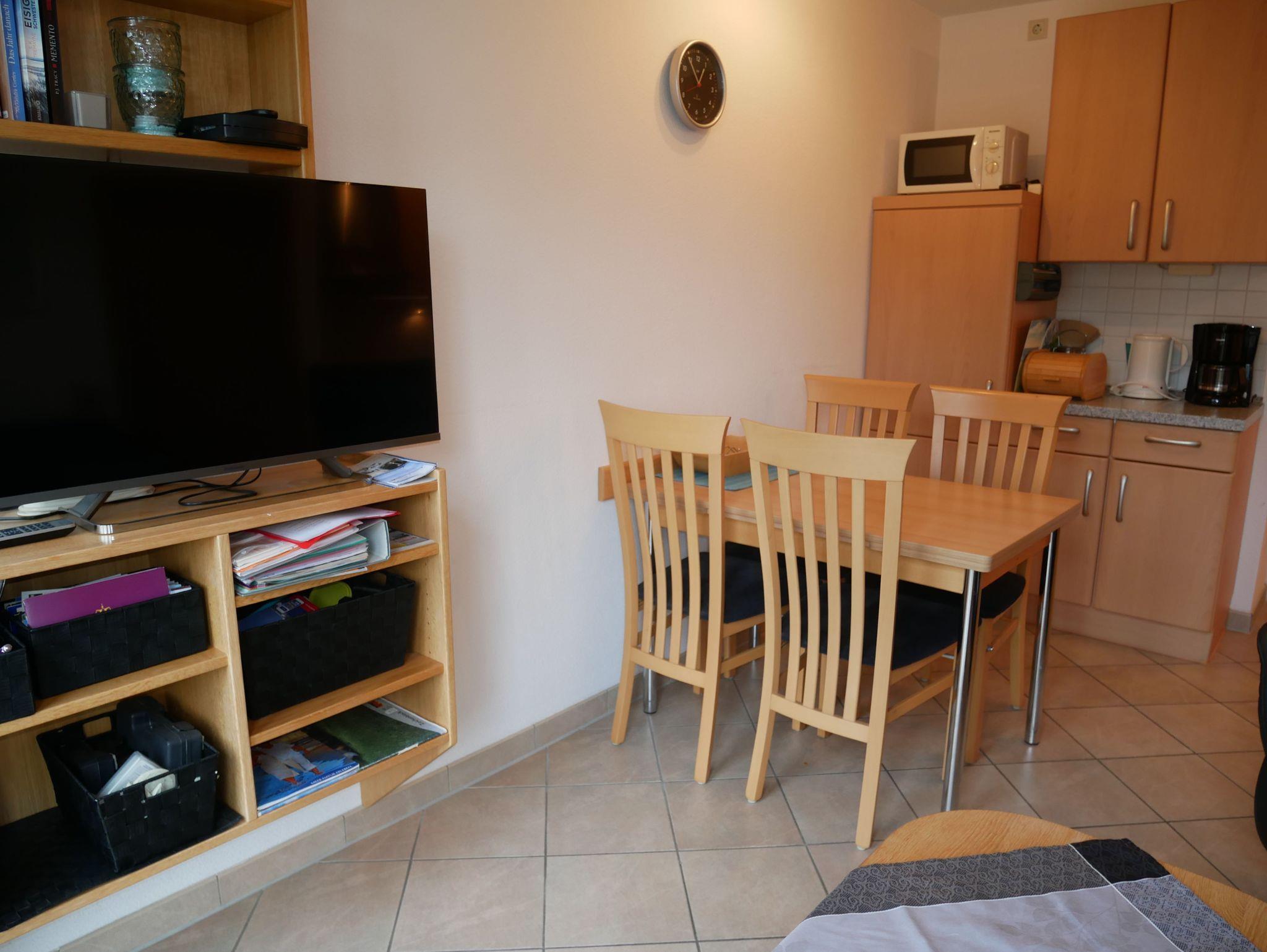 Die komfortable 2-Raum-NICHTRAUCHER Ferienwohnung befindet im 1. Obergeschoss und verfügt über einen Balkon zur Südseite. Das separate Schlafzimmer verfügt über ein Doppelbett mit getrennten Matratzen (Liegefläche pro Pers. 1m x 2,20). Das kombinierte Wohn- und Schlafzimmer ist mit einer gemütlichen Schlafcouch (1,40x2,00m) ausgestattet, sowie mit einem Smart-TV und einem Radio. Die offene Küchenzeile und der Essbereich befinden sich ebenfalls im Wohnbereich. Die Küche ist ausgestattet mit einem 4 Platten-Herd, Backofen, Mikrowelle, Spüle, Kühlschrank und Kaffeemaschine. Das Badezimmer verfügt über eine Dusche, die einen ebenerdigen Einstieg hat und somit auch seniorenfreundlich ist. Die gesamte Wohnung ist mit hellen Bodenfliesen ausgestattet. Bei Anreise liegt einer Erstausstattung Seife, Toilettenpapier, Küchenrolle und ein Geschirrhandtuch für Sie bereit.