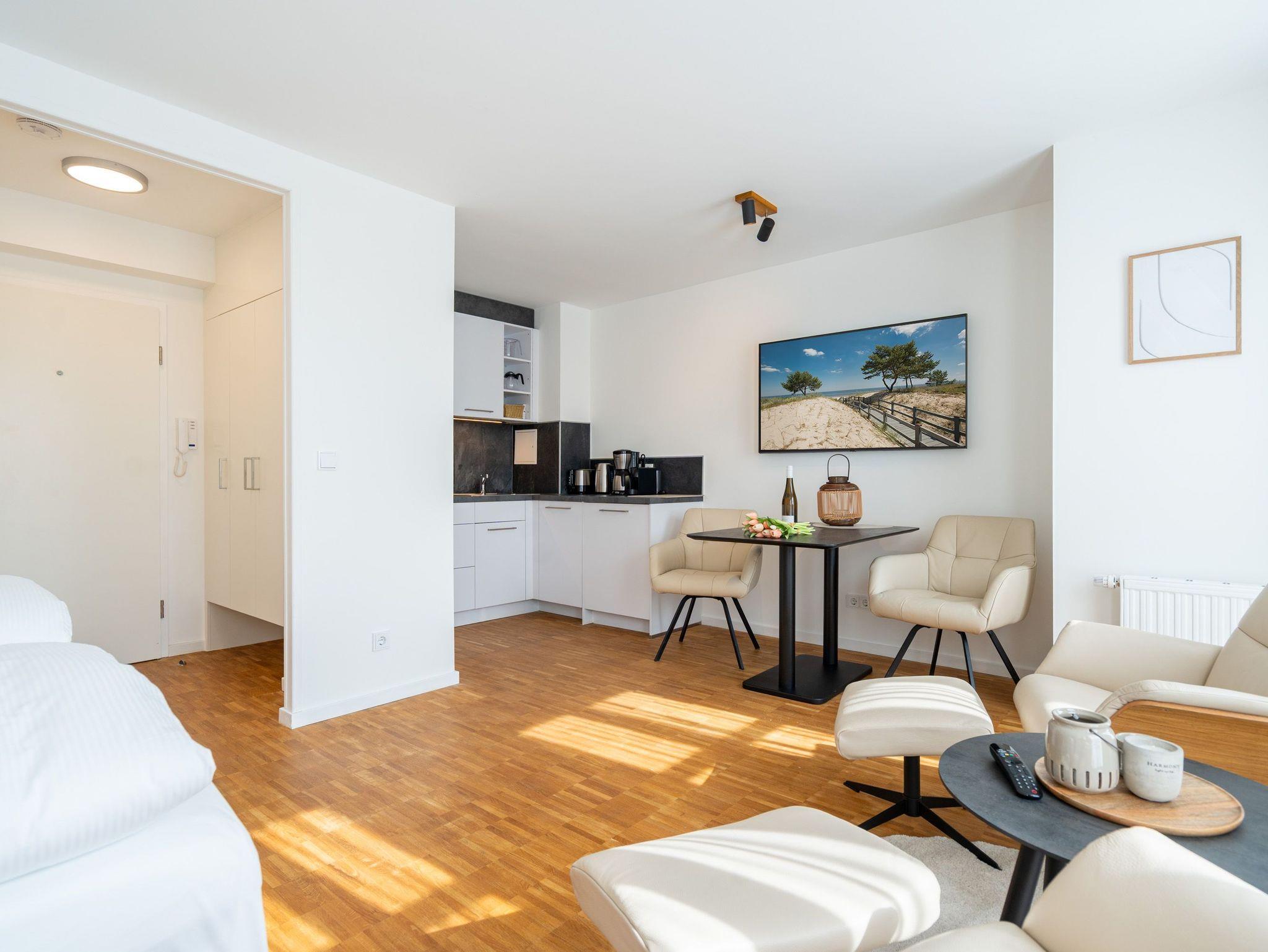 Klein, fein, einfach entspannen ? Ihr 1-Raum-Appartement Nr. 2 zum Wohlfühlen. Willkommen in Ihrem gemütlichen Rückzugsort für zwei! Dieses liebevoll eingerichtete 1-Raum-Appartement (28 m²) im Hochparterre bietet alles, was Sie für einen entspannten Urlaub zu zweit brauchen ? kompakt, stilvoll und durchdacht bis ins Detail. Der offene und helle Wohnbereich empfängt Sie mit einer modernen Küchenzeile, ausgestattet mit 2-Platten-Cerankochfeld, Spülmaschine, Kühlschrank mit Gefrierfach und einer Nespresso-Kapselmaschine ? perfekt für das erste Frühstück oder den kleinen Snack zwischendurch. Am Essplatz für zwei genießen Sie Ihre Mahlzeiten ganz entspannt mit Blick ins Grüne. Zum Entspannen laden zwei bequeme Relaxsessel mit Hockern ein ? perfekt für einen Filmabend am 55-Zoll-Flat-TV oder einfach zum Füßehochlegen. Für erholsame Nächte sorgt das komfortable Boxspringdoppelbett (1,60?m x 2,00?m), ein geräumiger Kleiderschrank bietet Platz für Ihr Urlaubsgepäck. Das kleine Duschbad ist funktional und gepflegt ? mit Waschtisch und WC. Ein PKW-Stellplatz (Nr. 2) steht Ihnen direkt vor dem Haus zur Verfügung, ebenso wie kostenfreies WLAN ? damit Sie auch im Urlaub bestens vernetzt bleiben. Ideal für Paare oder Alleinreisende, die auf Komfort nicht verzichten wollen ? willkommen in Ihrer kleinen Auszeit!