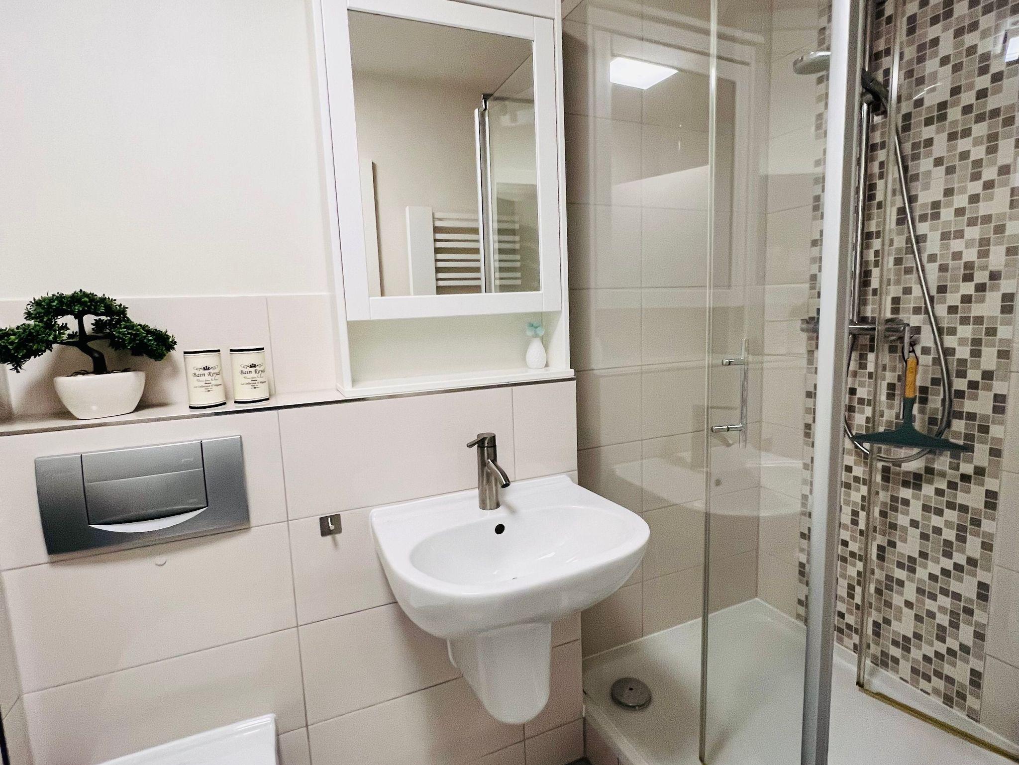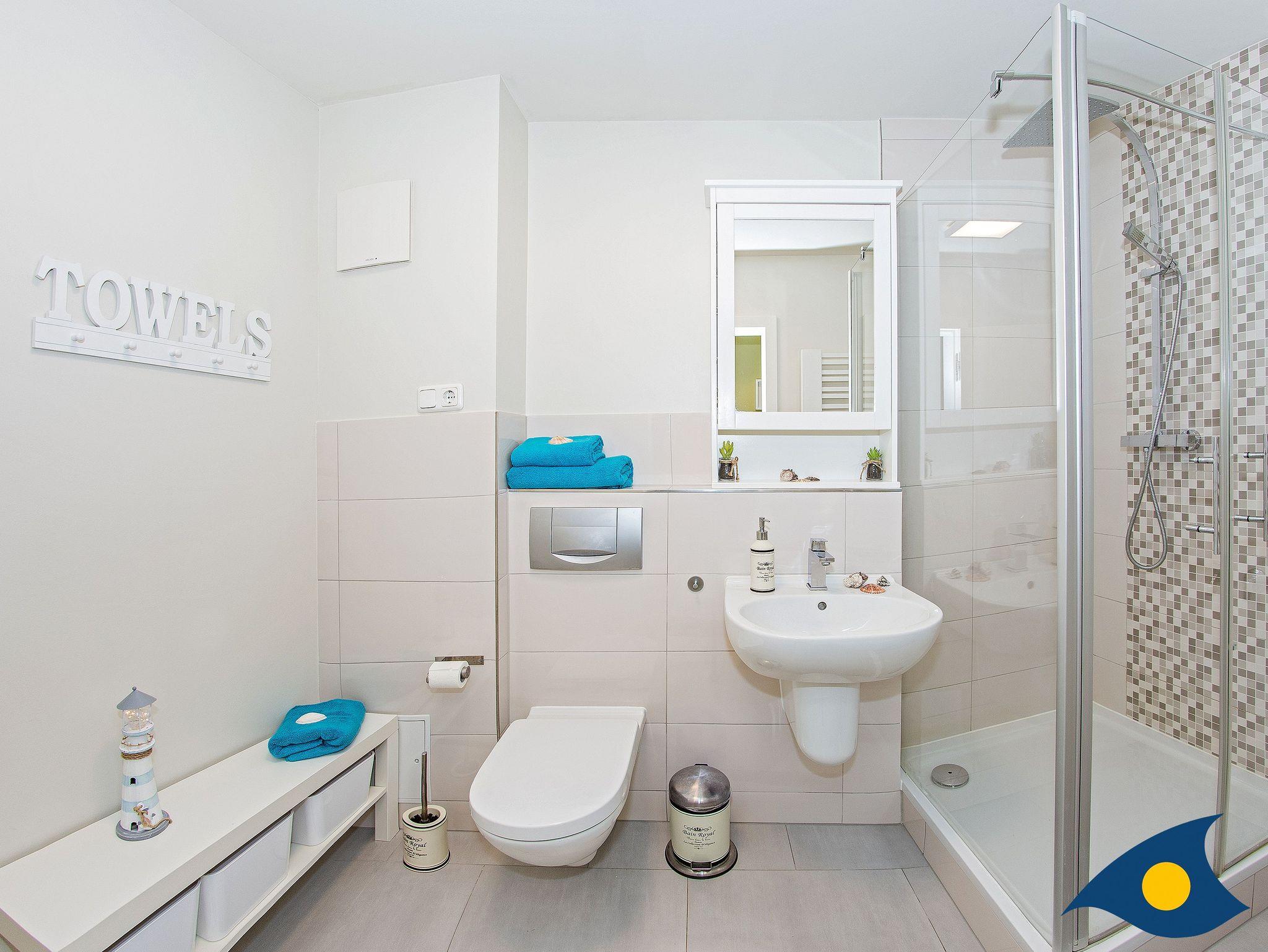 Das kleine Badezimmer mit WC und Dusche sowie einem Spiegelschrank lässt keine Wünsche offen.