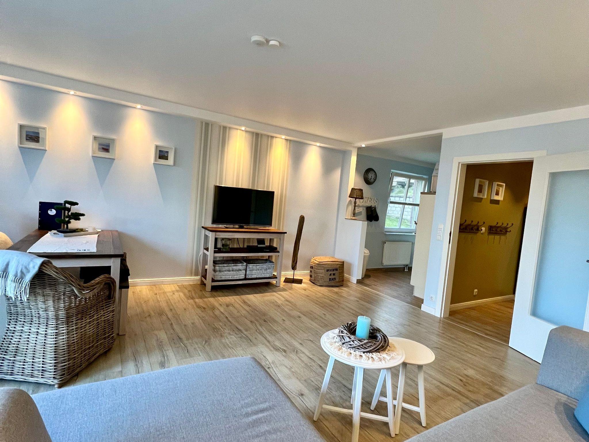 Das Wohnzimmer mit dem bequemen Sofa, das auch für eine dritte Person zum Schlafen verwendet werden kann und der Flachbildfernseher mit DVD-Player laden Sie zu entspannten Abenden ein.