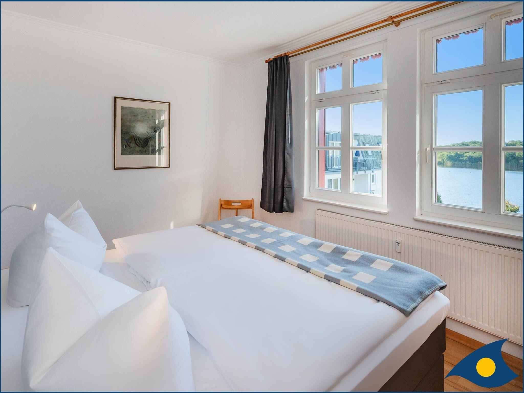 In einem der beiden separaten Schlafzimmer befindet sich ein bequemes Boxspringbett, von dem aus Sie ebenfalls den Blick auf den Schloonsee genießen können.