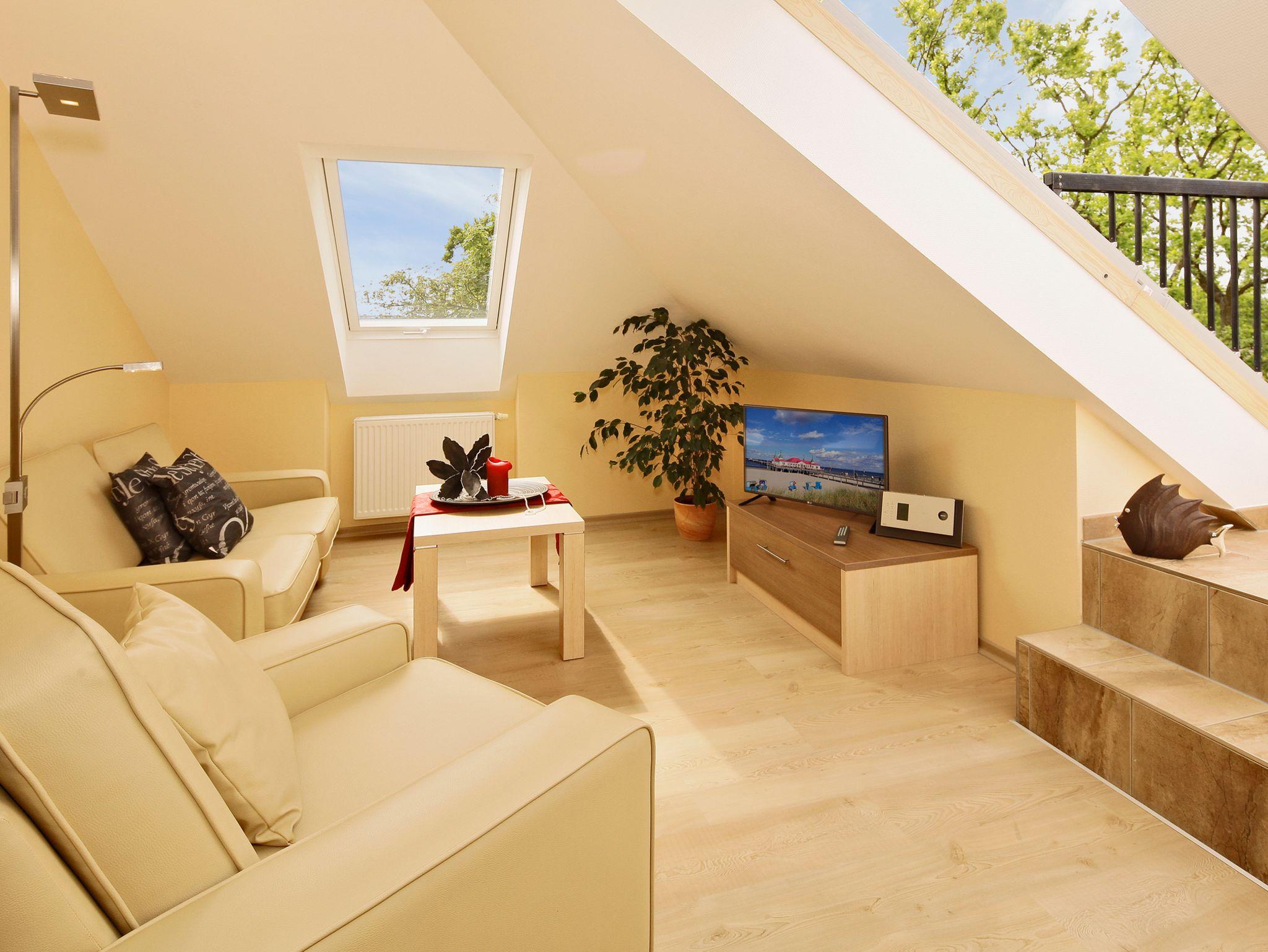 Moderne stilvolle 3 Zimmerferienwohnung für 2 - 4 Personen im Dachgeschoß in Südlage. Wohnzimmer mit TV, CD Eßplatz und integrierter Vollküche mit Geschirrspüler. Wohnung mit Duschbad. Die Wohnung besitzt zwei kleine Velux - Stehbalkone in Südlage.