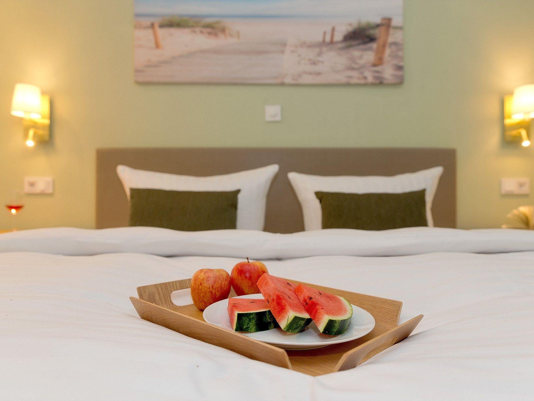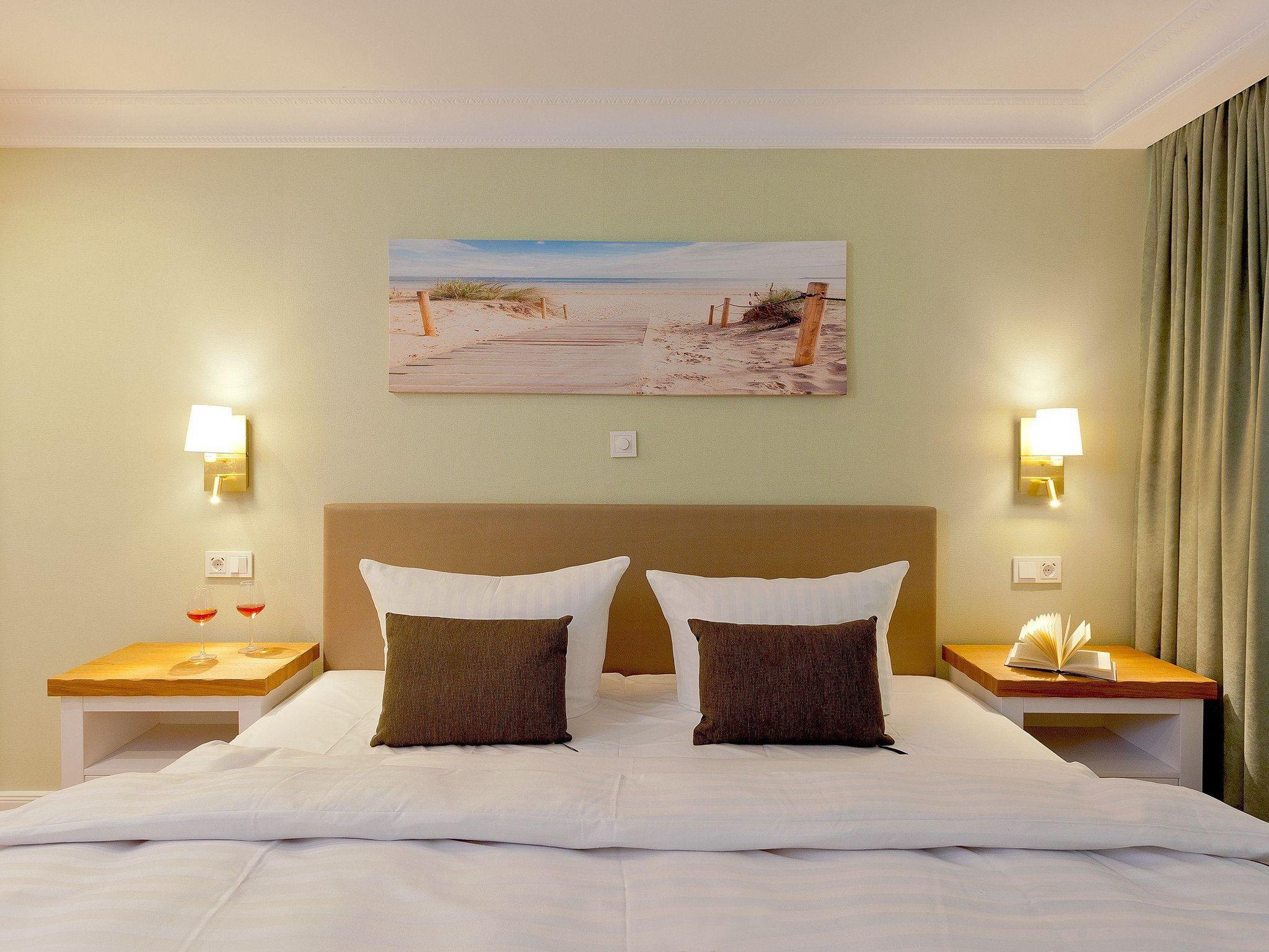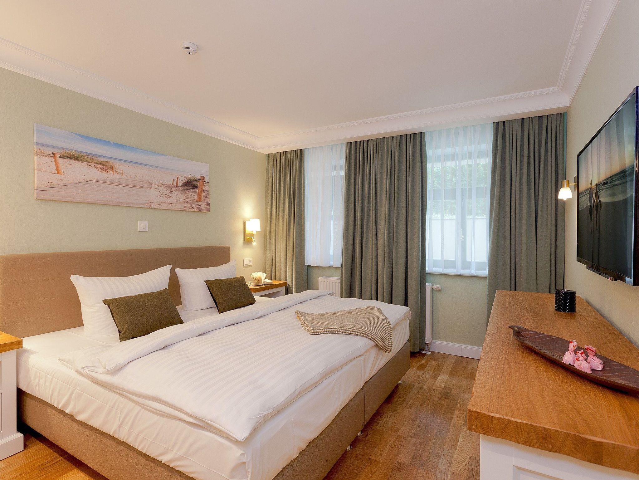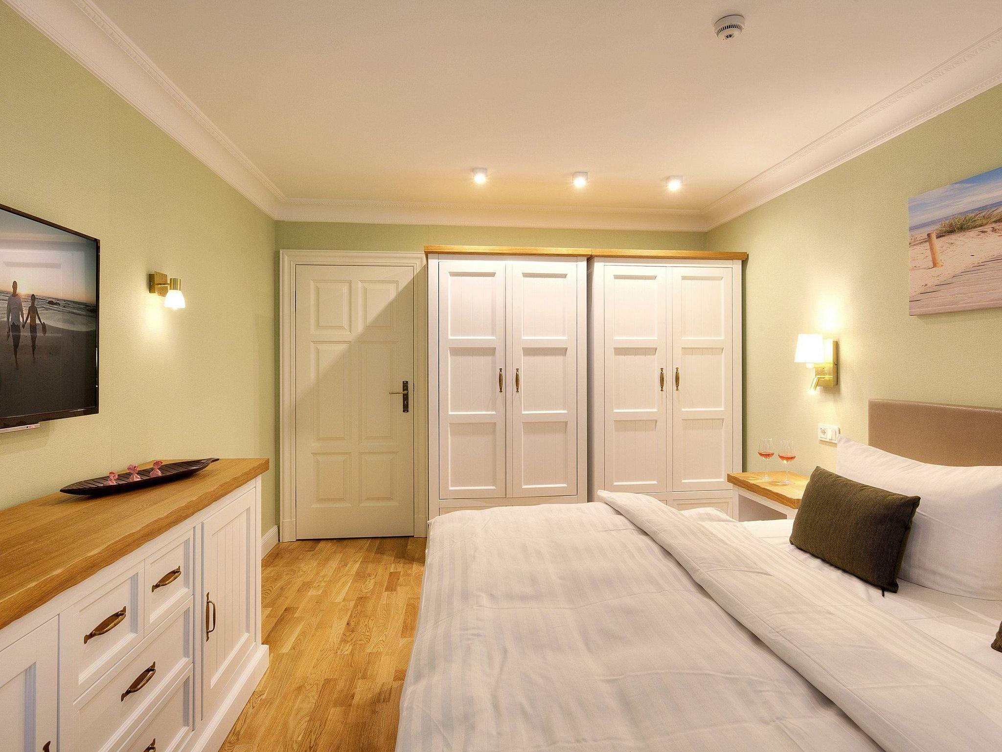 Die vier Schlafplätze verteilen sich auf ein ruhiges Schlafzimmer mit komfortablem Boxspringbett (200 × 200 cm, zwei getrennte Matratzen) sowie eine gemütliche Schlafcouch im Wohnbereich ideal für Kinder oder weitere Gäste. Ein geräumiger Kleiderschrank bietet ausreichend Platz für Ihr Gepäck.