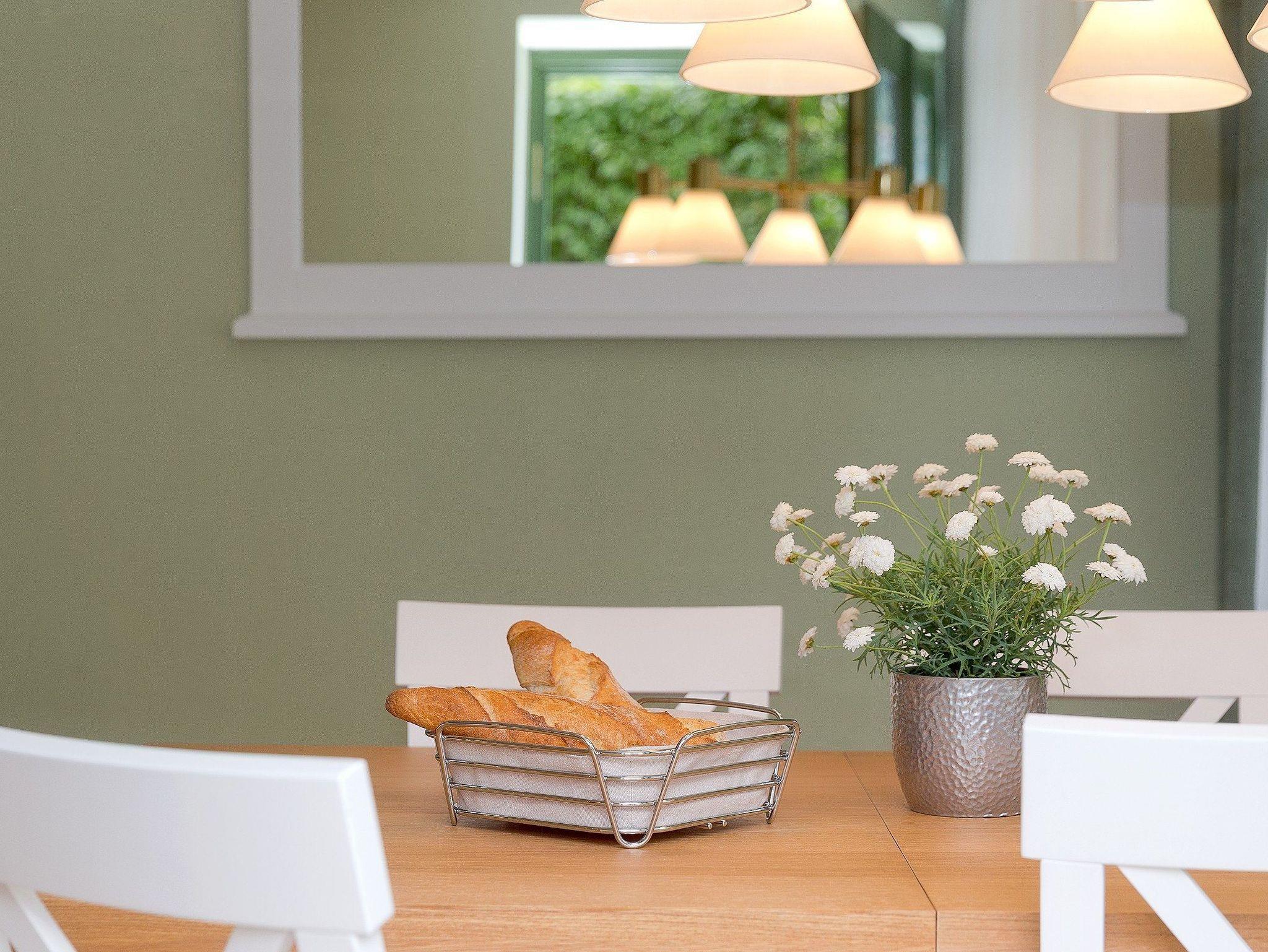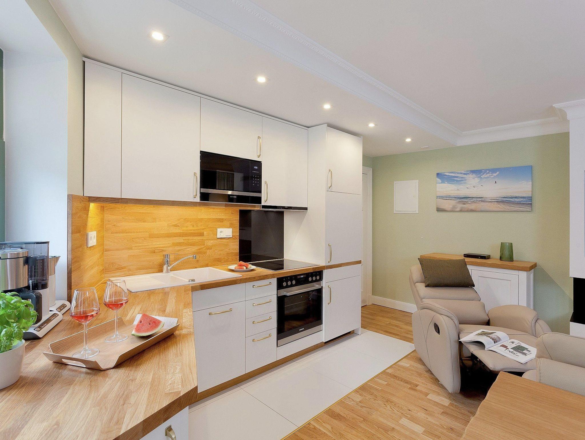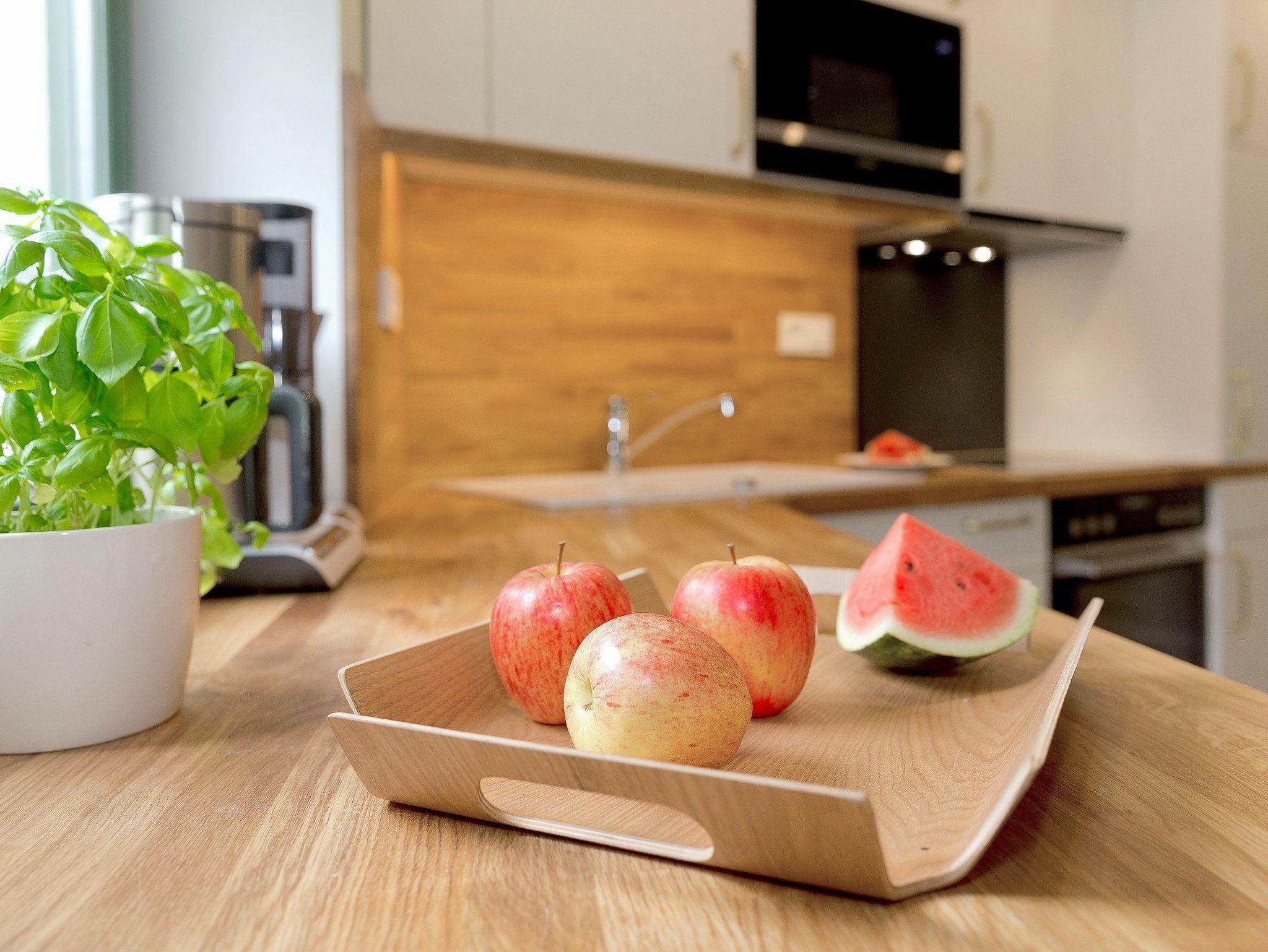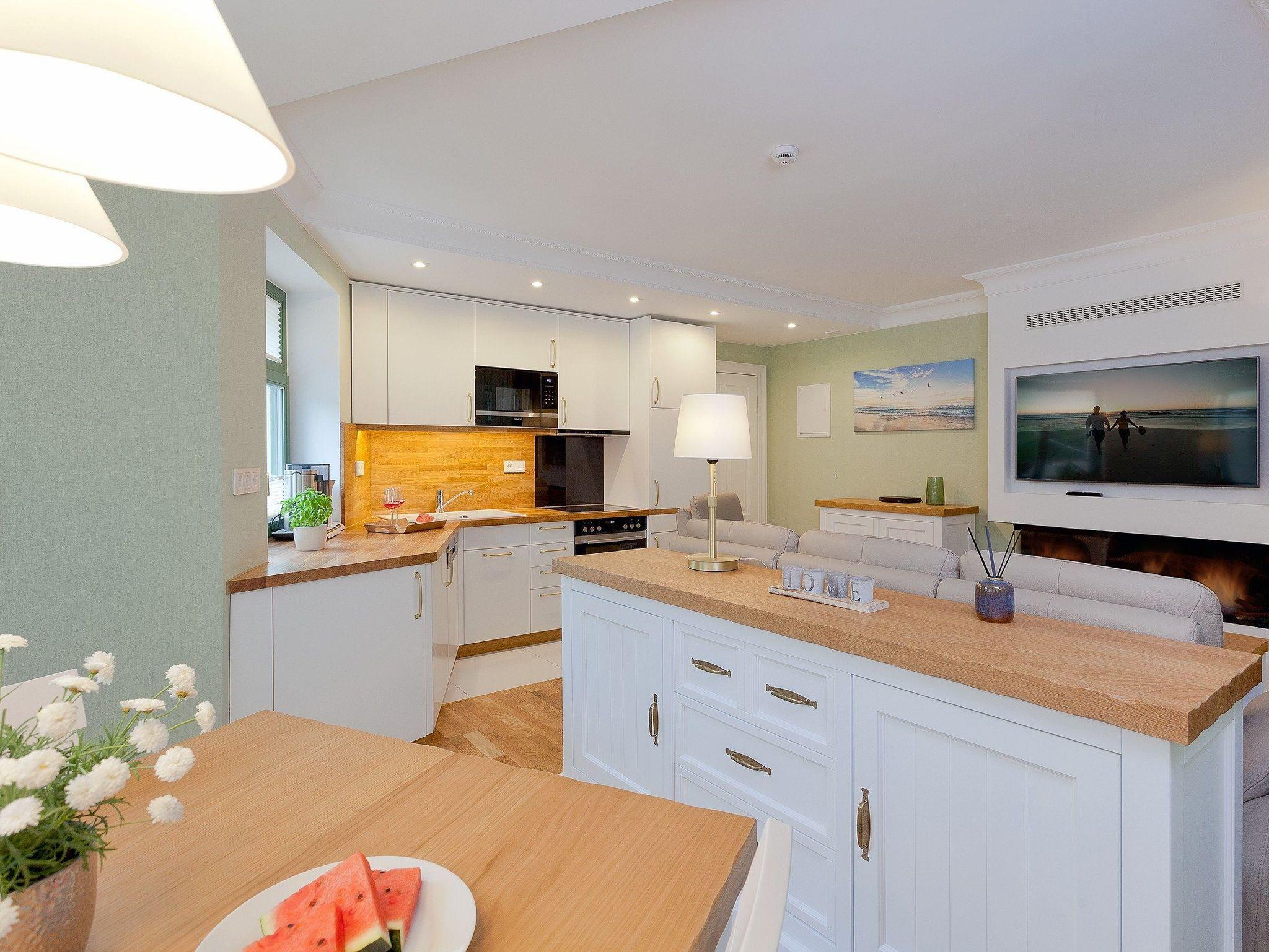 Die voll ausgestattete Küche, maßgefertigt von einem einheimischen Tischler, bietet alles, was Sie für einen entspannten Urlaub benötigen: Backofen, Mikrowelle, Kühlschrank mit Gefrierfach, Kaffeemaschine, Wasserkocher, Toaster sowie einen Essplatz für vier Personen ? ideal für gemeinsame Mahlzeiten.