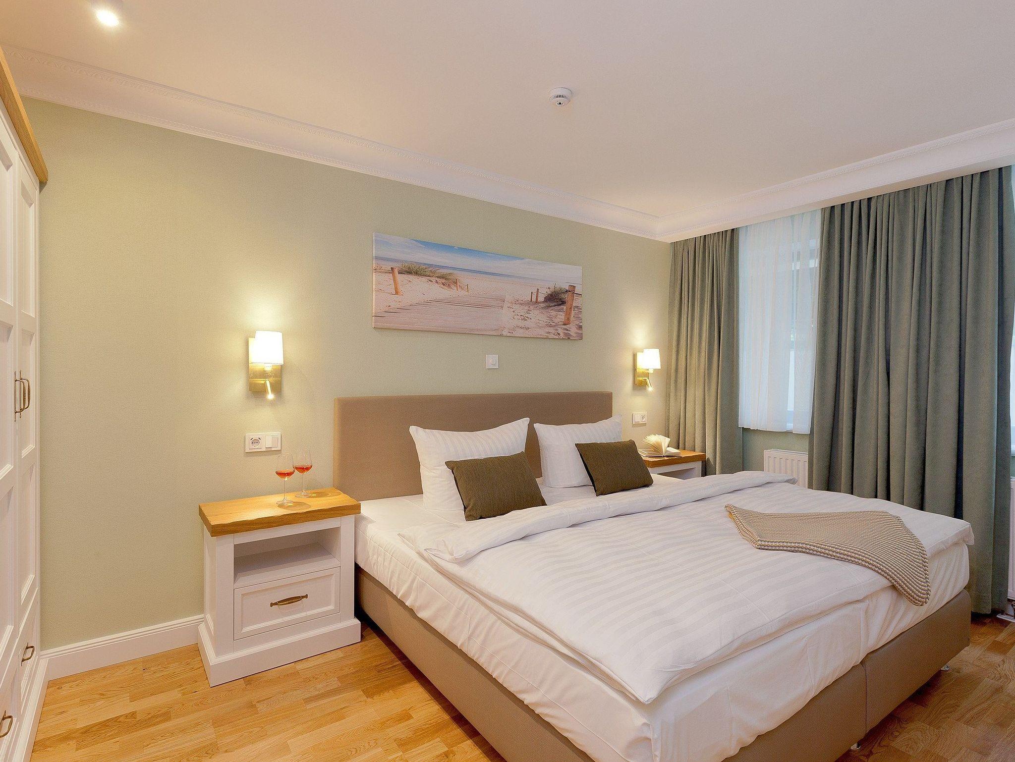 Die vier Schlafplätze verteilen sich auf ein ruhiges Schlafzimmer mit komfortablem Boxspringbett (200 × 200 cm, zwei getrennte Matratzen) sowie eine gemütliche Schlafcouch im Wohnbereich ? ideal für Kinder oder weitere Gäste. Ein geräumiger Kleiderschrank bietet ausreichend Platz für Ihr Gepäck.