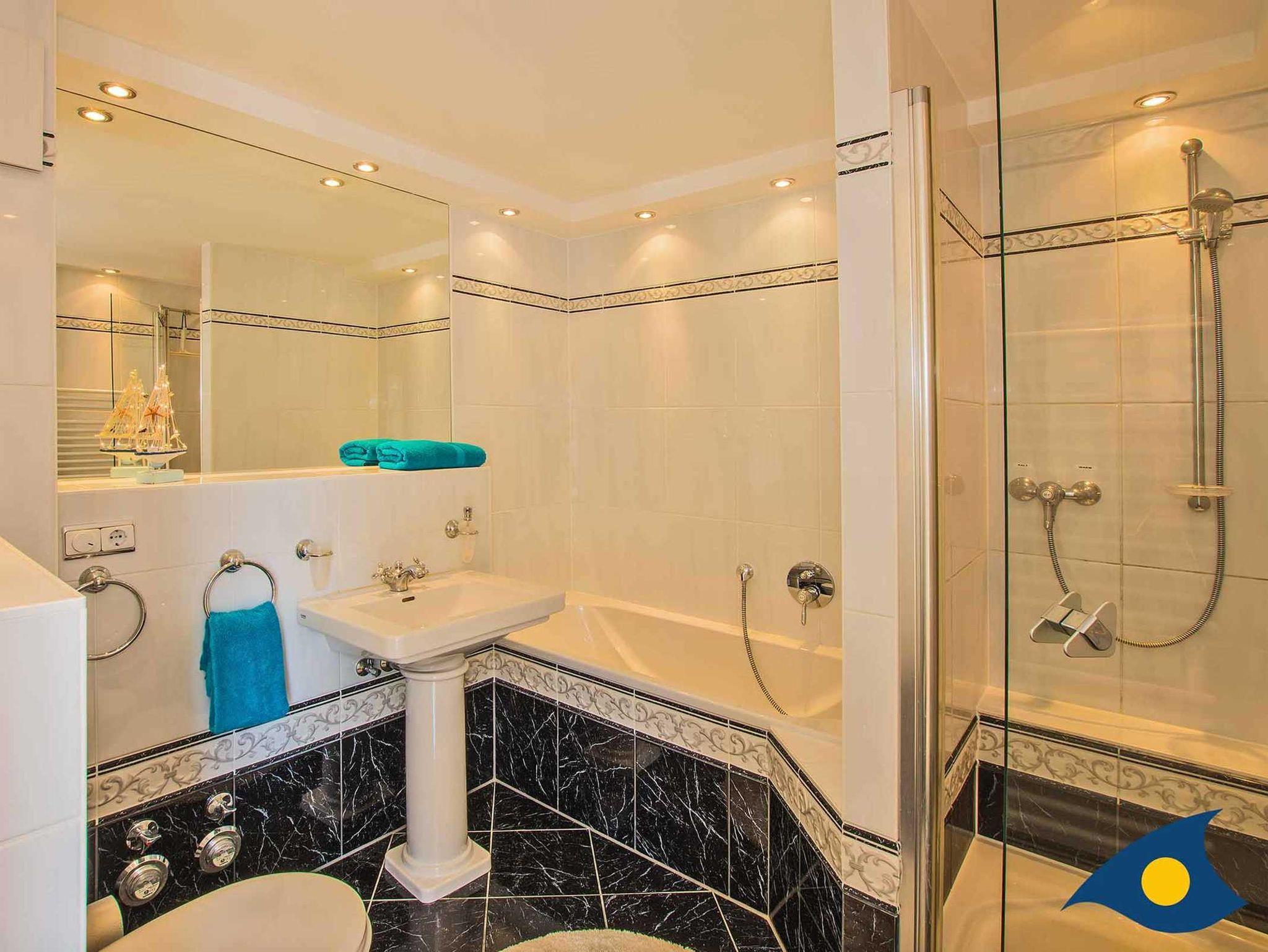 Hochwertiges Bad mit Badewanne und separater Dusche - darüber hinaus verfügt die Wohnung über ein elegantes WC