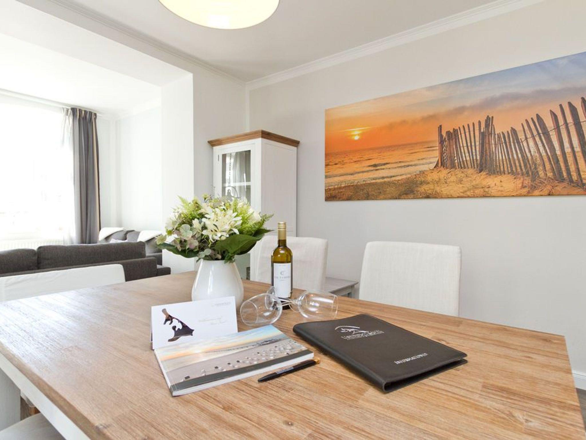 Die helle, freundliche 3-Raum-Ferienwohnung im Erdgeschoss der Villa ist 2016 frisch renoviert - modern eingerichtet und sehr geschmackvoll dekoriert und bietet Platz für 4 bis 6 Personen. Sie verfügt über ein Wohnzimmer mit Schlafcouch und Flat-TV, eine komplett ausgestattete Küchenzeile (Ceranfeld, Backofen) mit Essbereich, zwei Schlafzimmer mit Boxspring-Doppelbetten, zwei Duschbäder und eine großzügige Terrasse. Die vollständige Einrichtung lässt keine Wünsche offen. Auch die beiden Schlafzimmer sind je mit einem Flat-TV ausgestattet. Für die 5. und 6. Person besteht die Möglichkeit der Aufbettung auf der Schlafcouch im Wohnzimmer. Auf Wunsch stellen wir für unsere kleinen Gäste ein Kinderreisebett (ohne zusätzliche Matratze [&] Bettzeug) und einen Kinderhochstuhl zur Verfügung. Die Betten sind bei Anreise bezogen und Handtücher liegen bereit. Ein PKW-Stellplatz steht auf dem Parkdeck zur Verfügung. Die Villa Frisia bietet Ihnen ein strandnahes Feriendomizil in stilvoller, exklusiver Atmosphäre. Es erwarten Sie moderne, ansprechend möblierte und sehr komfortabel ausgestattete Appartements mit vielen Extras. Zu jeder Wohnung gehört ein Pkw-Stellplatz. Ein Fahrradkeller befindet sich direkt am Objekt. Waschmaschine [&] Trockner im Haus sind gegen Gebühr nutzbar. Das WLAN-Netz im Haus steht kostenfrei zur Verfügung.
