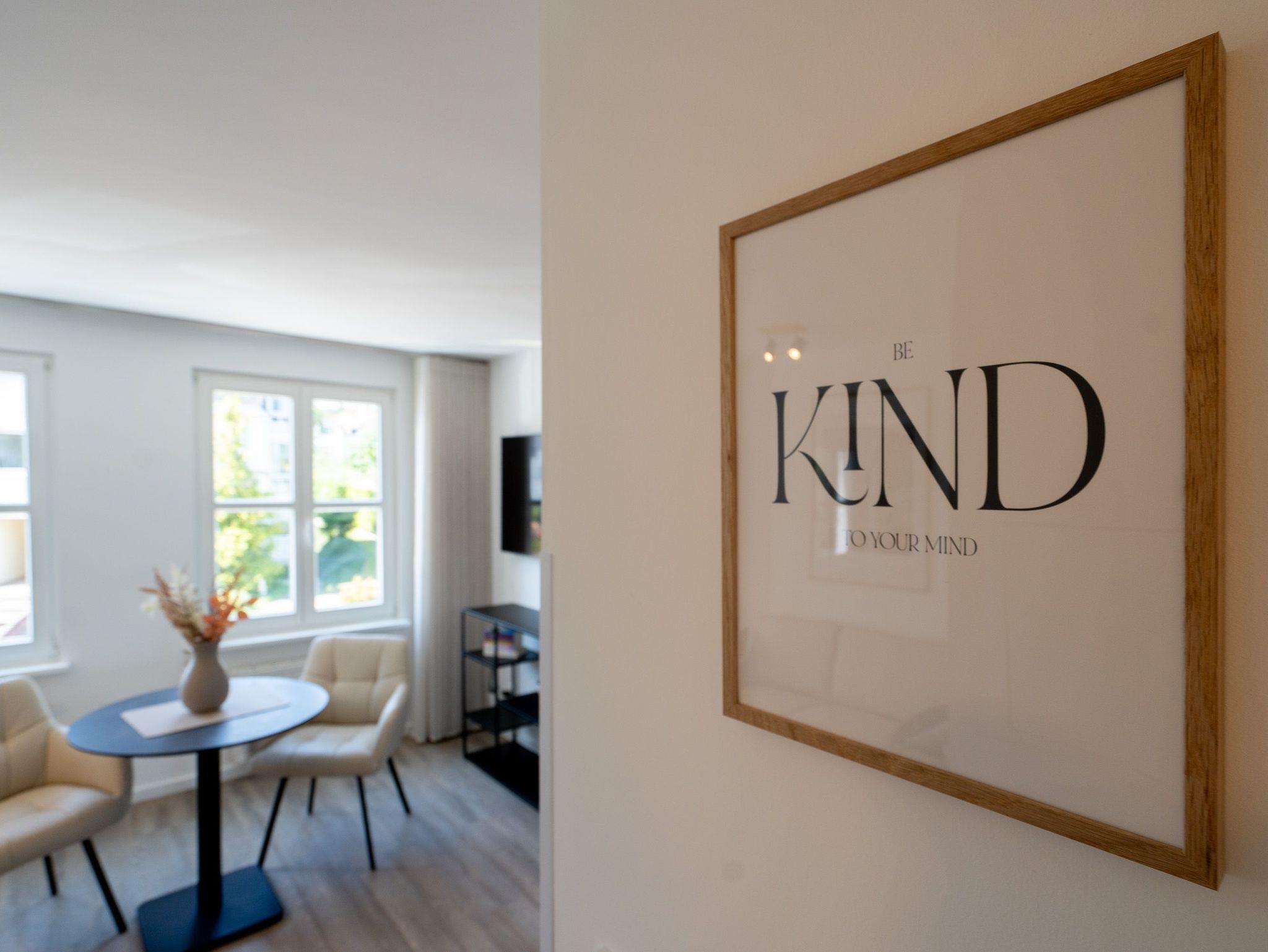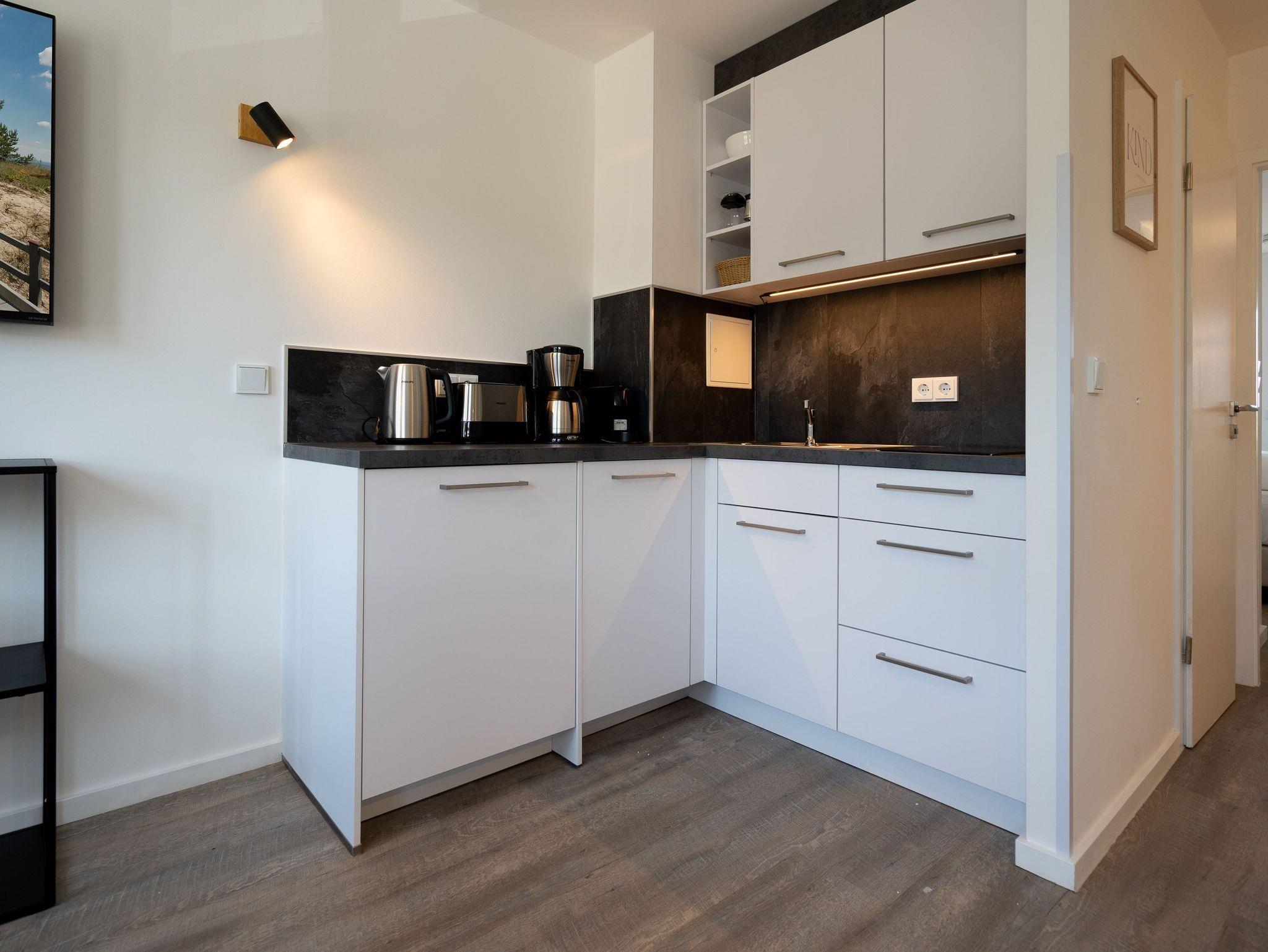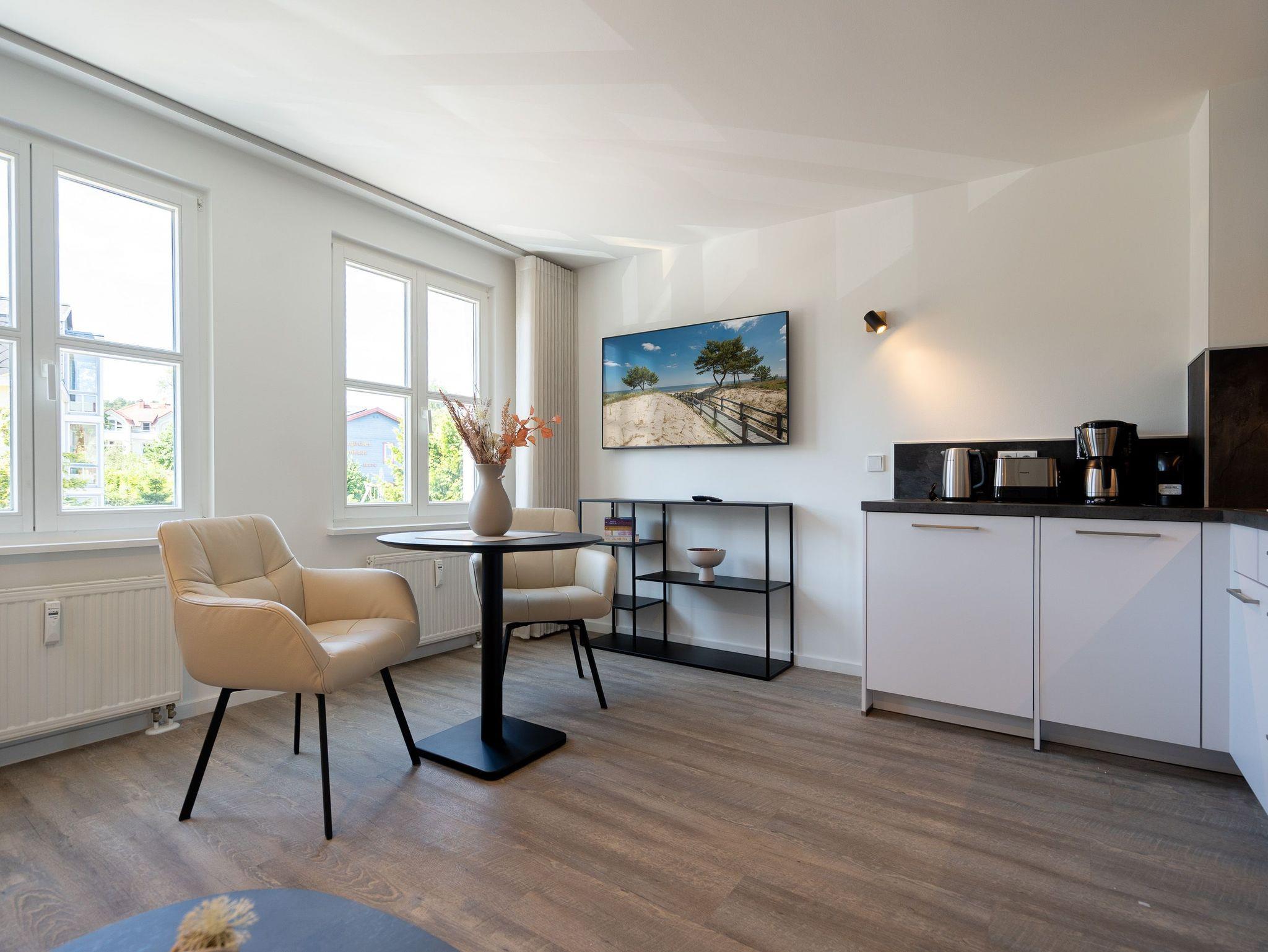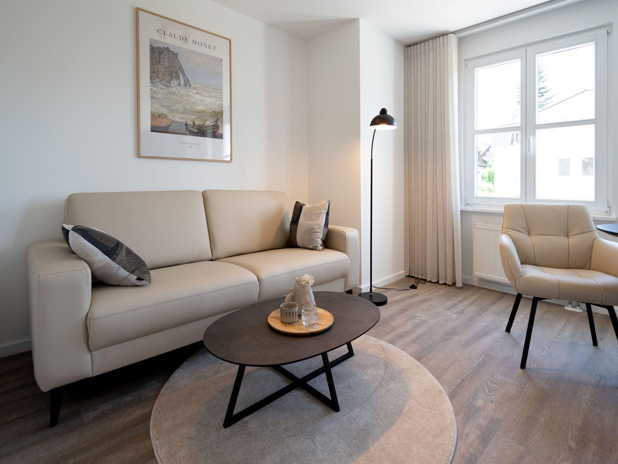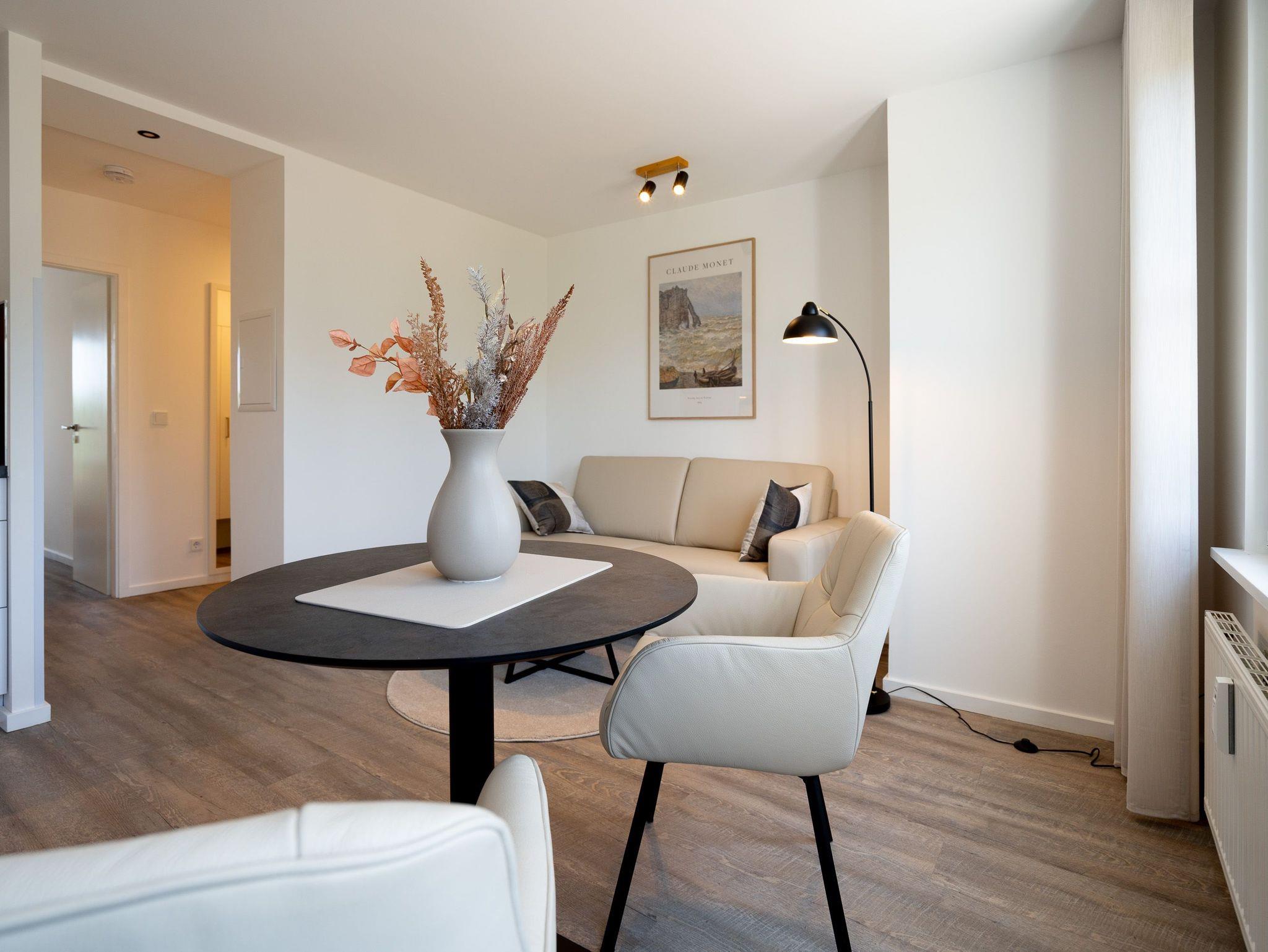 Lichtdurchflutetes 2-Raum-Appartement Nr. 4 mit Balkon ? Entspannung in der 2. Etage. Dieses charmante 2-Raum-Appartement in der 2. Etage bietet auf 33?m² ein stilvolles Zuhause auf Zeit für zwei Personen ? durchdacht geschnitten, hell und mit liebevollen Details ausgestattet. Der offene Wohnbereich empfängt Sie mit einer modernen Küchenecke inklusive 2-Platten-Cerankochfeld, Spülmaschine, Kühlschrank mit Gefrierfach und Nespresso-Kapselmaschine ? ideal für einen entspannten Start in den Tag oder das unkomplizierte Abendessen. Am Esstisch für zwei genießen Sie Ihre Mahlzeiten in gemütlicher Atmosphäre. Ein komfortables Sofa und der 55-Zoll-Flat-TV sorgen für entspannte Stunden ? ob mit Buch, Film oder einfach beim Durchschnaufen. Im separaten Schlafzimmer erwartet Sie ein komfortables Boxspringbett (1,80?m x 1,95?m), das erholsame Nächte garantiert. Von hier aus gelangen Sie direkt auf den sonnigen Süd-Ost-Balkon (ca. 5?m²) ? ein Lieblingsplatz für die Morgenstunden oder ein Gläschen Wein am Abend. Ein geräumiger Kleiderschrank steht im Flur zur Verfügung und bietet ausreichend Stauraum für Ihr Gepäck. Das kompakte Bad mit Dusche ( 0,85 m x 0,70 m), Waschtisch und WC ist funktional und gepflegt ? alles, was man braucht, nichts, was fehlt. Ein fester PKW-Stellplatz (Nr. 4) befindet sich direkt vor dem Haus. Und natürlich steht Ihnen kostenfreies WLAN zur Verfügung. Ideal für Paare, Alleinreisende oder alle, die gerne mit Leichtigkeit wohnen ? herzlich willkommen!