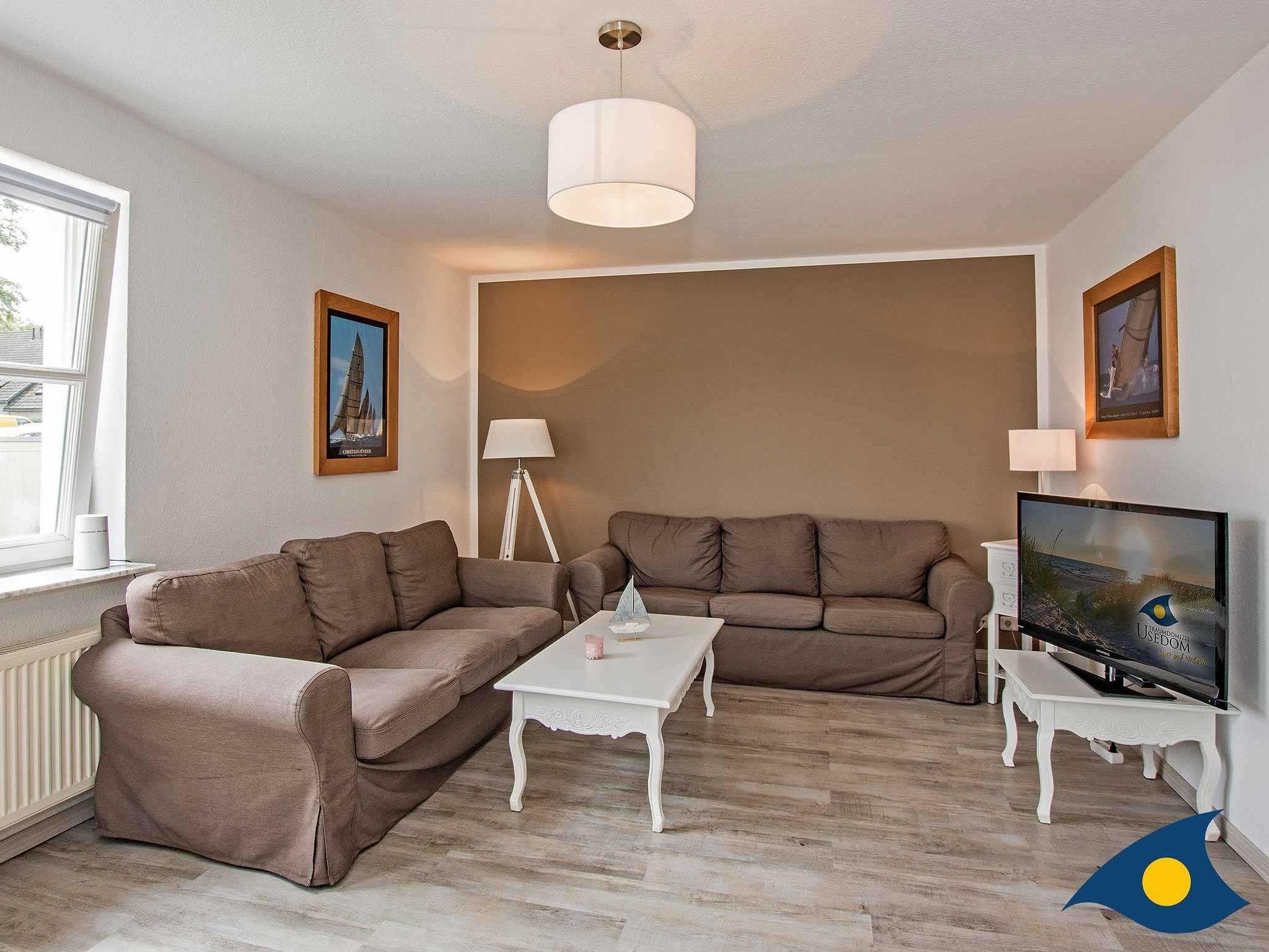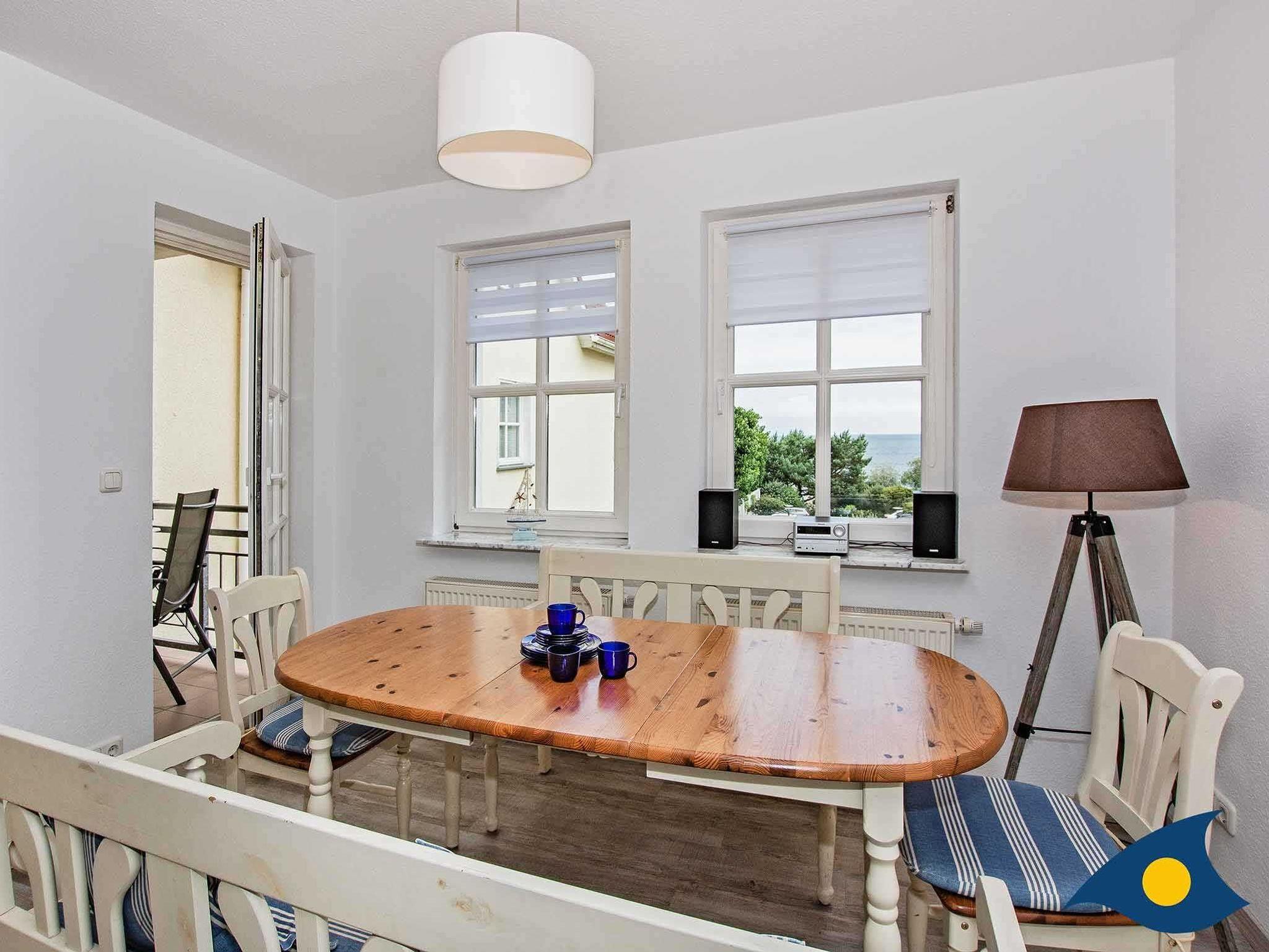 Das geräumige Wohnzimmer mit Meerblick lädt zu gemutlichen Fernseh- oder Spieleabenden ein. Der große Tisch am Fenster dient als Essplatz und wird auch gerne zum Schreiben der Urlaubsgruße genutzt. Denn auch von hier genießen Sie die schöne Aussicht auf die Ostsee.