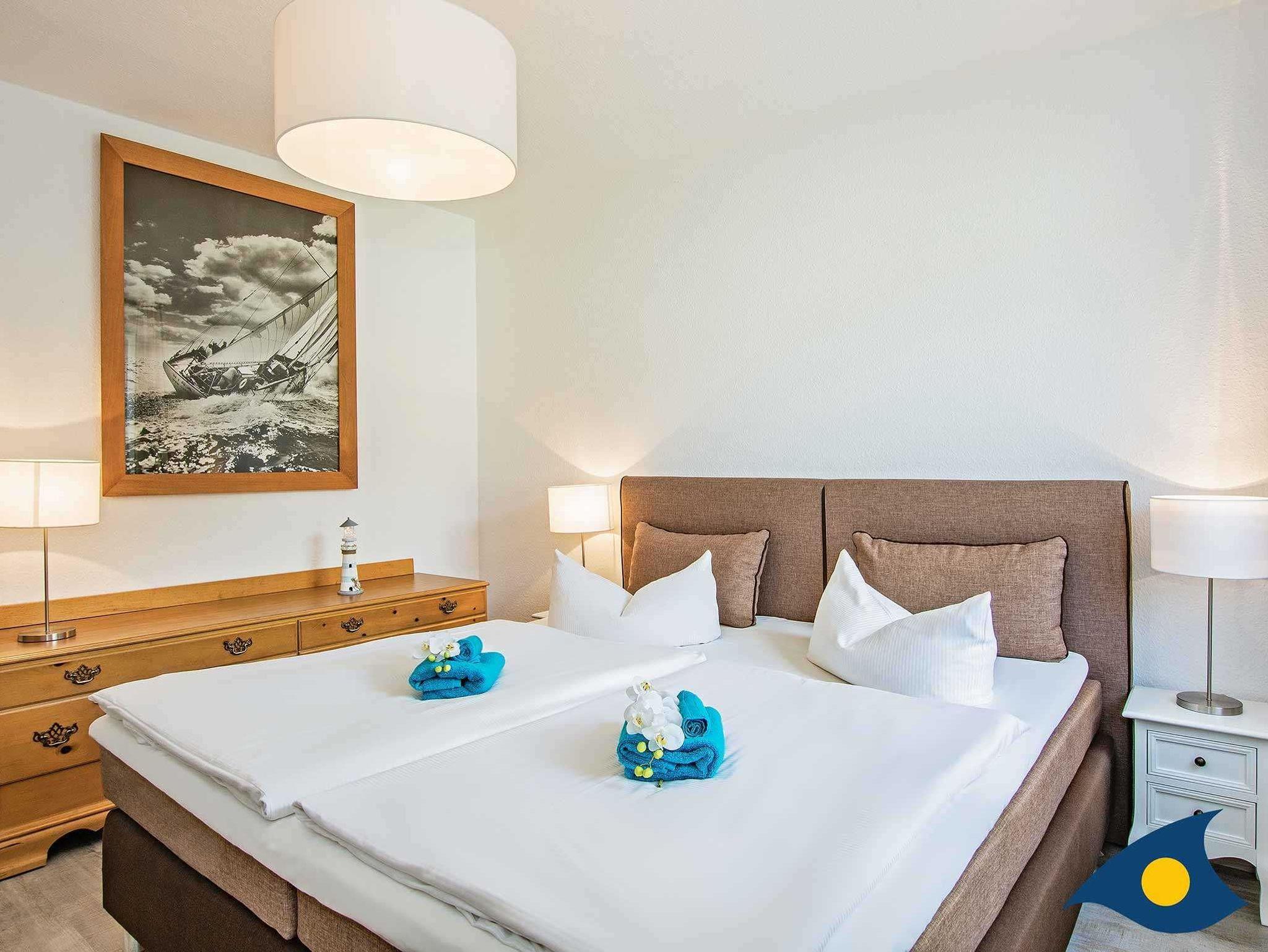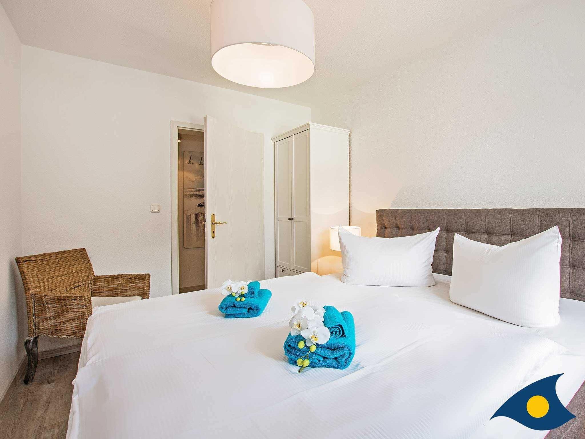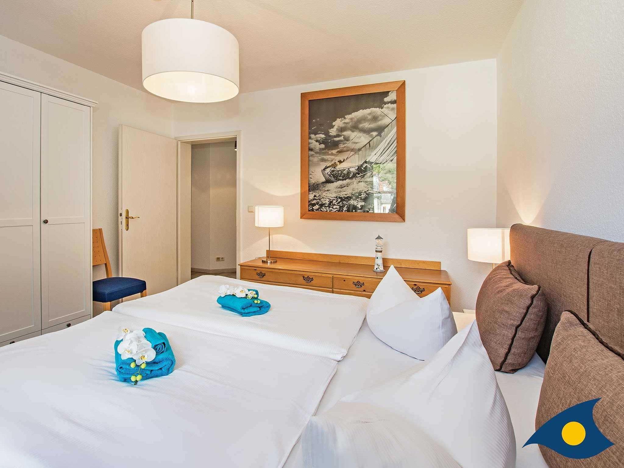 Die Schlafzimmer sind ruhig zur Hofseite gelegen und bieten neben einem gemutlichen Schlafplatz genugend Stauraum fur Ihre Urlaubsgarderobe. Die Betten sind 1,80 m x 2,00 m und 1,60 m x 2,00 m groß.