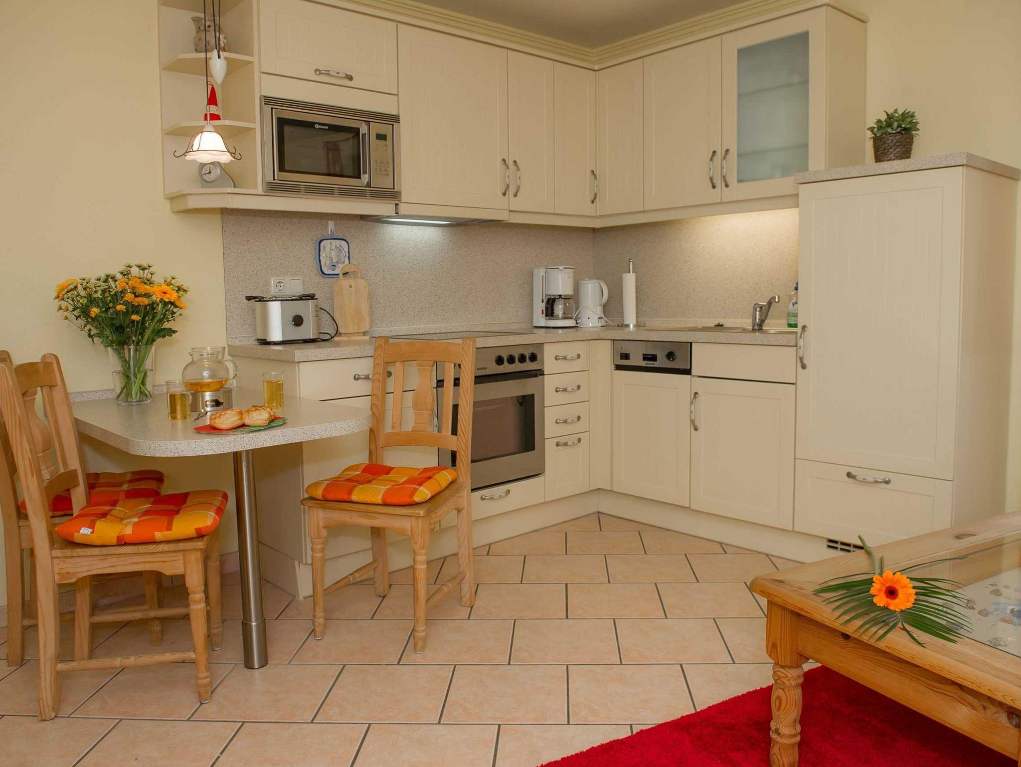 Die helle, im halben Souterrain gelegene 32 qm große 2-Zimmer-Wohnung ist geschmackvoll eingerichtet. Der gemütliche Wohn-Essbereich geht in eine offene, sehr gut ausgestattete Küche über. Geschirrspüler, Mikrowelle, Toaster, Wasserkocher, Backofen usw. gehören zum Standard. Zugehörig zur Wohnung ist eine große Terrasse. Auf dem bequemen Schlafsofa kann eine Aufbettung für 2 weitere Personen vorgenommen werden. Das kleine, maritim eingerichtete Duschbad rundet den Gesamteindruck der Wohnung ab. Ein Waschraum mit Waschmaschine und Trockner steht den Hausgästen mittels Münzautomat zur Verfügung. Die Stadt Residenz verfügt über einen kleinen Wellnessbereich mit Sauna und Whirlpool, den die Hausgäste gegen Gebühr individuell nach Absprache nutzen können. Ideal zum Entspannen nach einem Strandspaziergang in den Herbst-, Winter- und Frühjahrsmonaten.