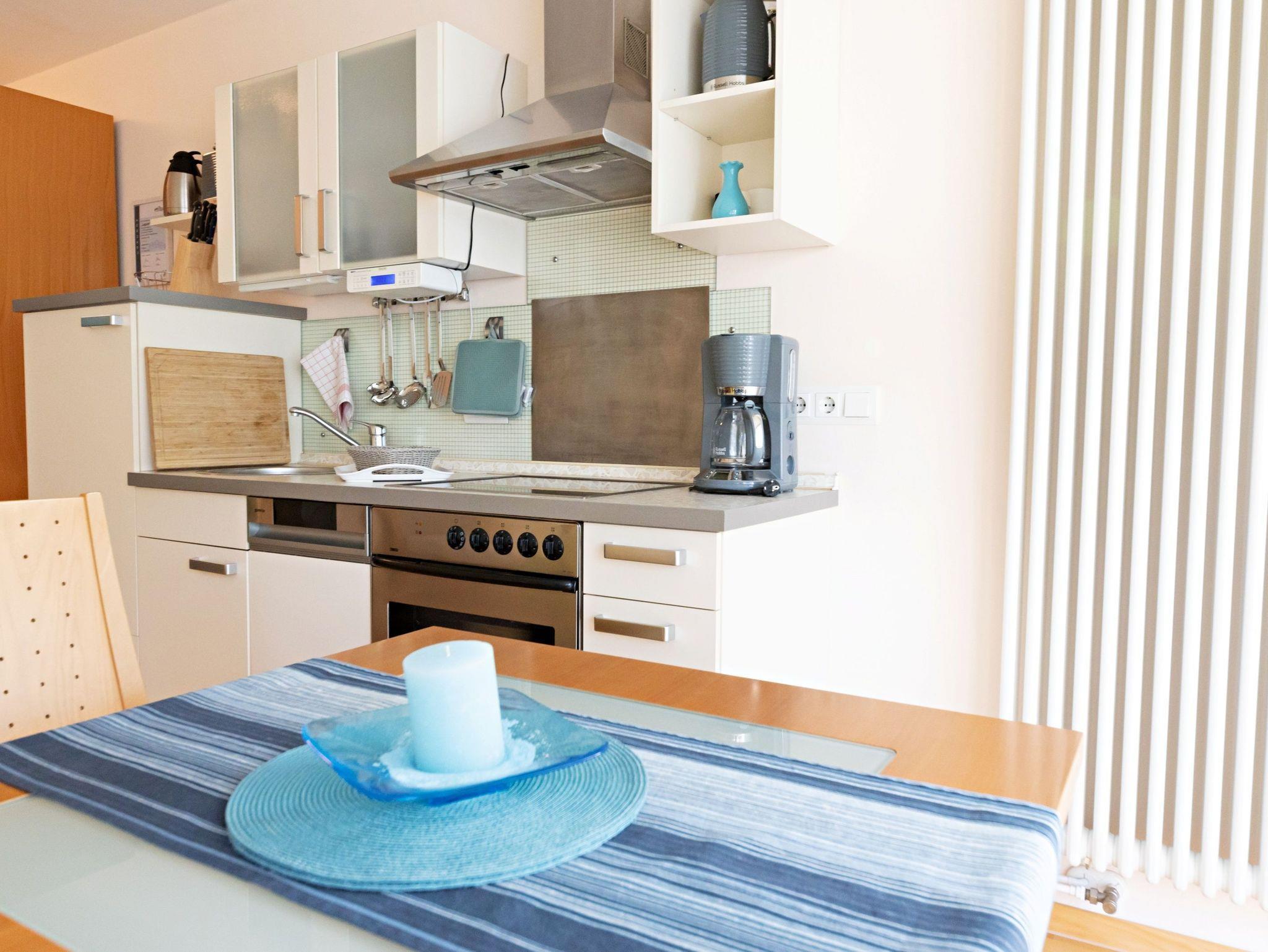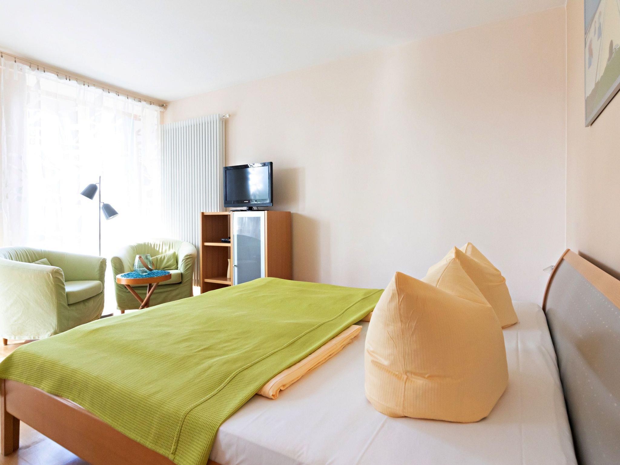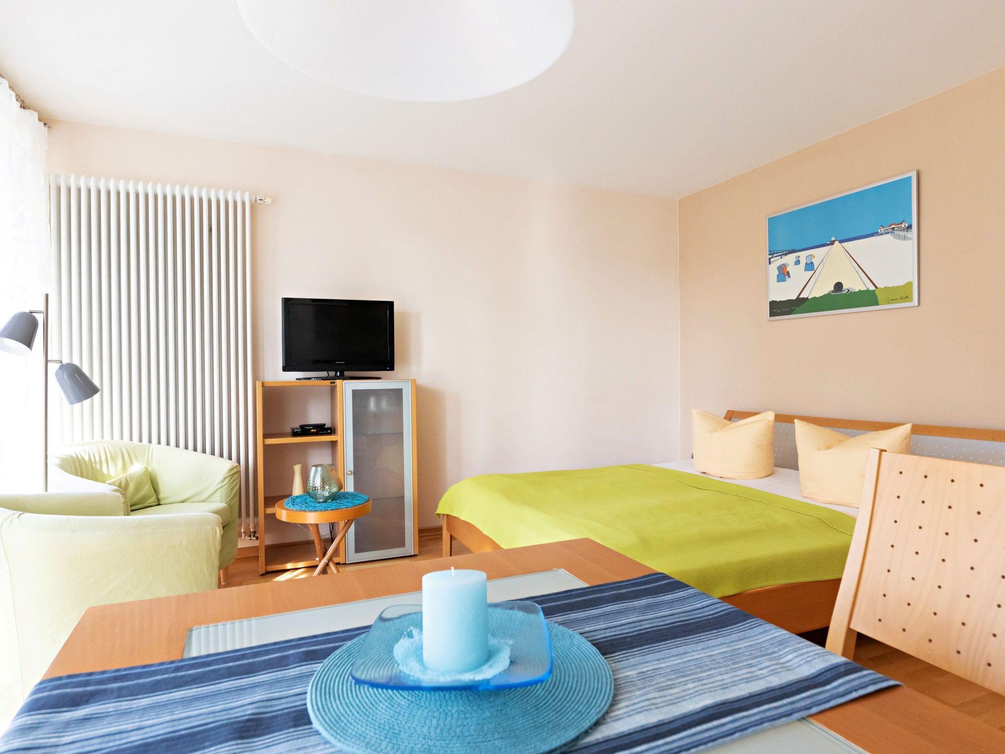 Diese moderne Unterkunft im 1. Obergeschoss bietet Ihnen auf ca. 34 qm alles, was Sie für einen entspannten Aufenthalt benötigen. Genießen Sie die Sonne auf Ihrem Balkon zur Süd/Westseite, ausgestattet mit bequemen Sitzmöbeln. Der kombinierte Wohn-/Schlafraum ist ideal für Ihre Erholung und verfügt über ein komfortables Doppelbett, Flachbild-TV, Radio sowie eine einladende Sitzecke. Der Esstisch mit zwei bequemen Stühlen lädt zu gemeinsamen Mahlzeiten ein. In der komplett ausgestatteten Küchenzeile finden Sie alles, was Sie brauchen, darunter einen 4-Platten-Ceranherd, einen Backofen, Geschirrspüler, Kühlschrank, Kaffeemaschine, Wasserkocher und Toaster.