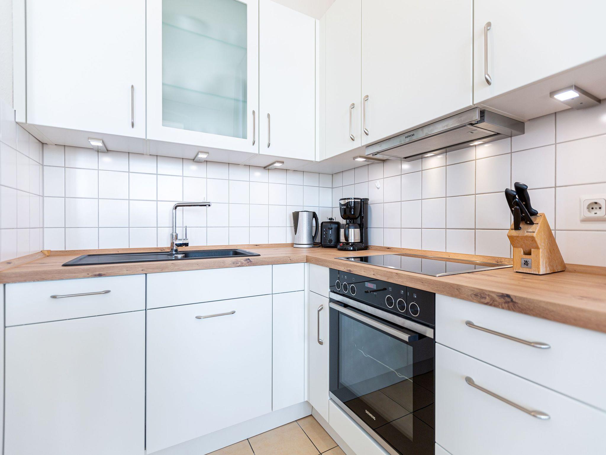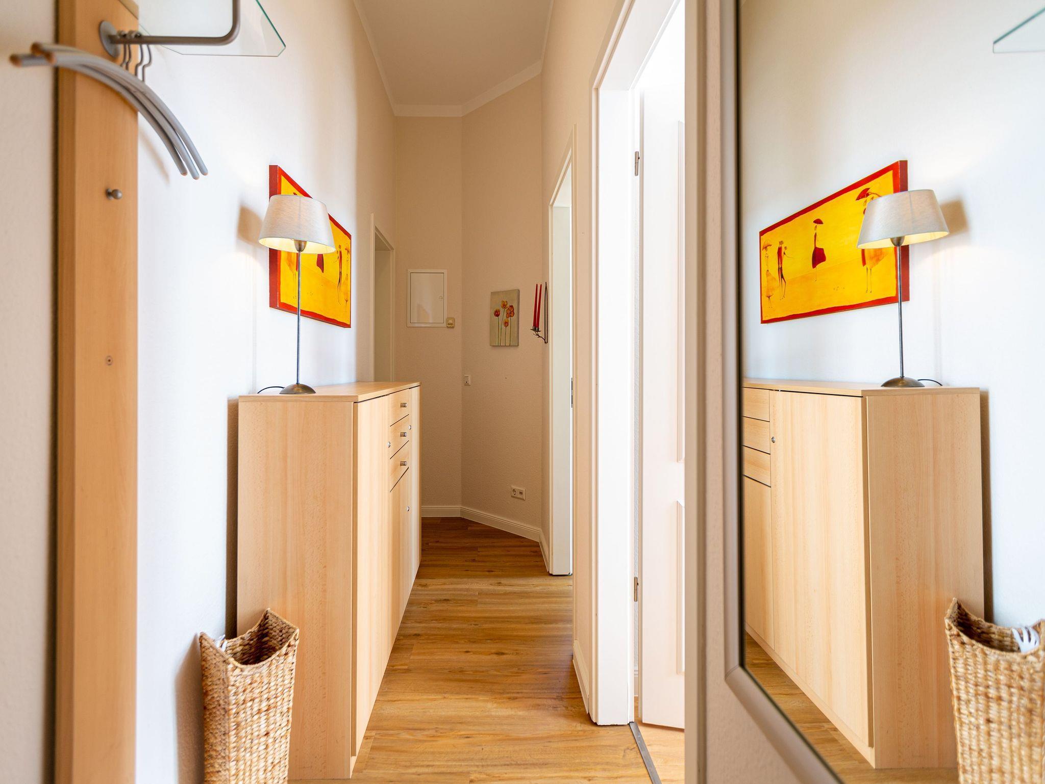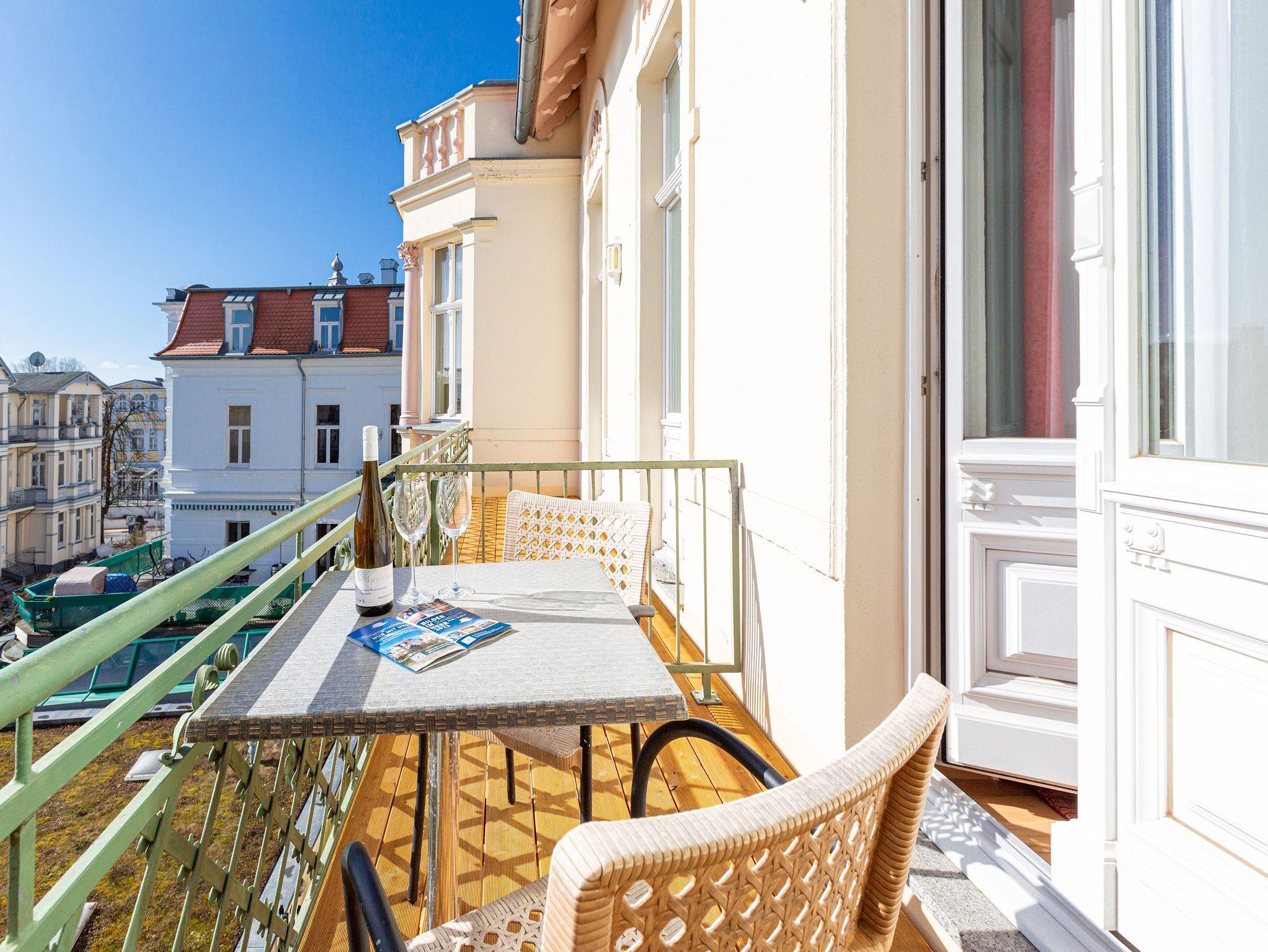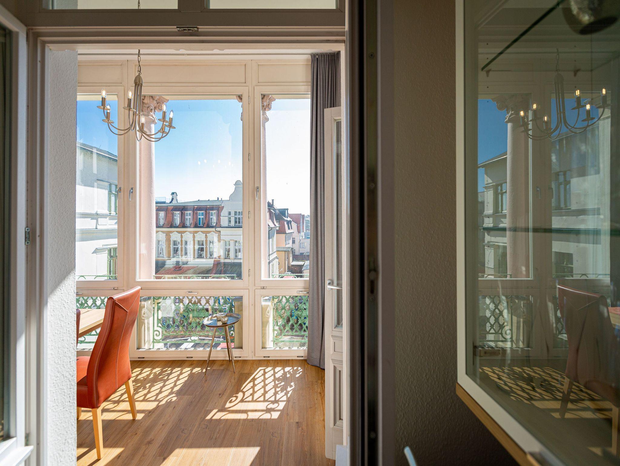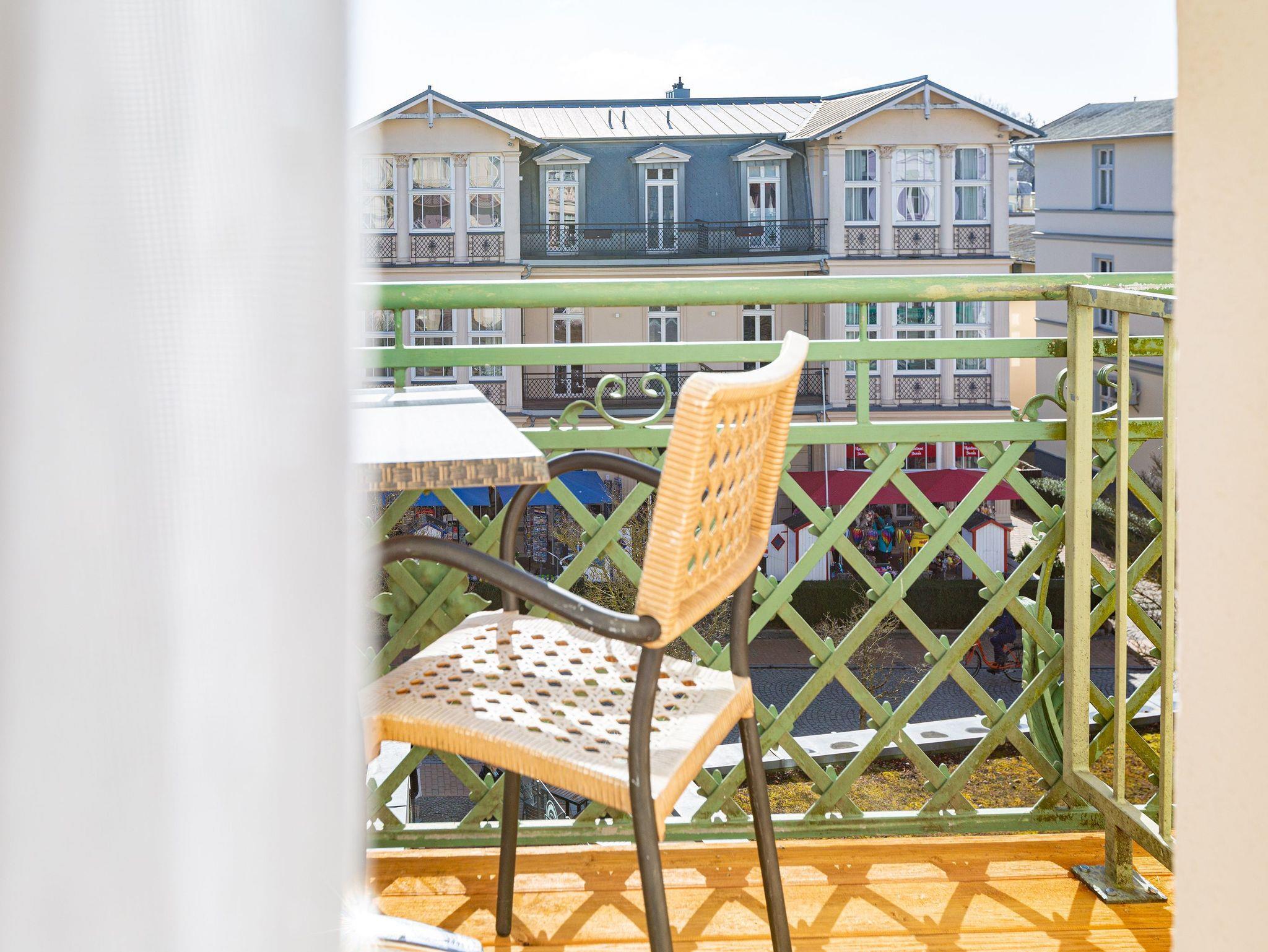 Diese helle lichtdurchflutete Ferienwohnung ( für max. 2 Personen [&] 2 Kinder bis 15 Jahre) überzeugt von der ersten Minute an. Liebevoll dekoriert und stilvoll möbliert verbringen Sie hier erholsame Urlaubstage. Im Wohnbereich finden Sie eine komplett ausgestattete Küchenzeile mit allen Annehmlichkeiten sowie eine verglaste Veranda mit Essplatz und Blick auf die Villen der Seestraße. Das Schlafzimmer mit Doppelbett bietet 2 Personen Platz für eine erholsame Nacht. Auf Ihrem Balkon genießen Sie die Morgensonne oder die gesunde Ostseeluft. Für die 3. und 4. Person besteht die Möglichkeit der Aufbettung auf der Schlafcouch im Wohnzimmer. Für Ihren Komfort steht die Erstausstattung Wäsche für Sie bereit.