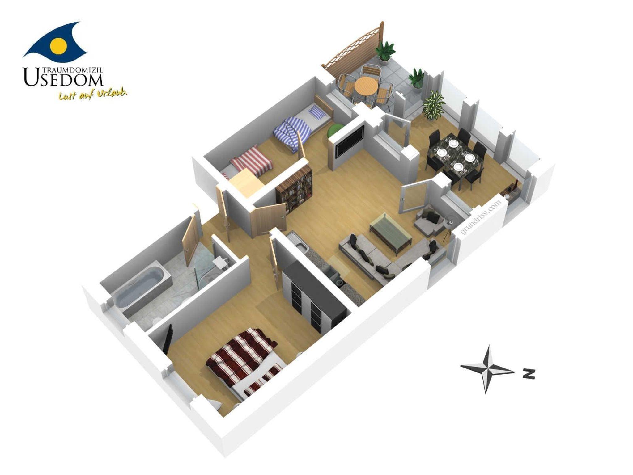 Auf 64 qm erwarten Sie ein großzügiger Wohnraum inkl. Küchenzeile, ein großes Schlafzimmer mit einem großzügigen Doppelbett (verstellbares Lattenrost), ein kleines Schlafzimmer sowie ein Badezimmer mit einer Dusche. Im kleinen Schlafzimmer finden Sie zwei Einzelbetten mit verstellbaren Lattenrosten. Zwei Flachbild Fernseher und eine moderne Radioanlage runden die Einrichtung ab.