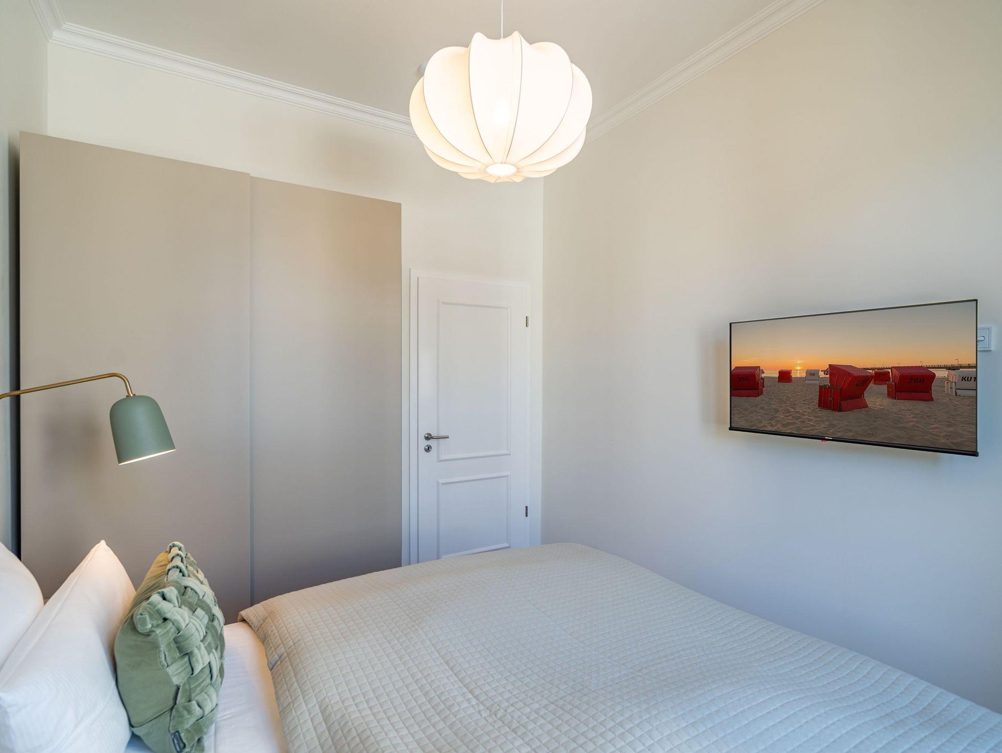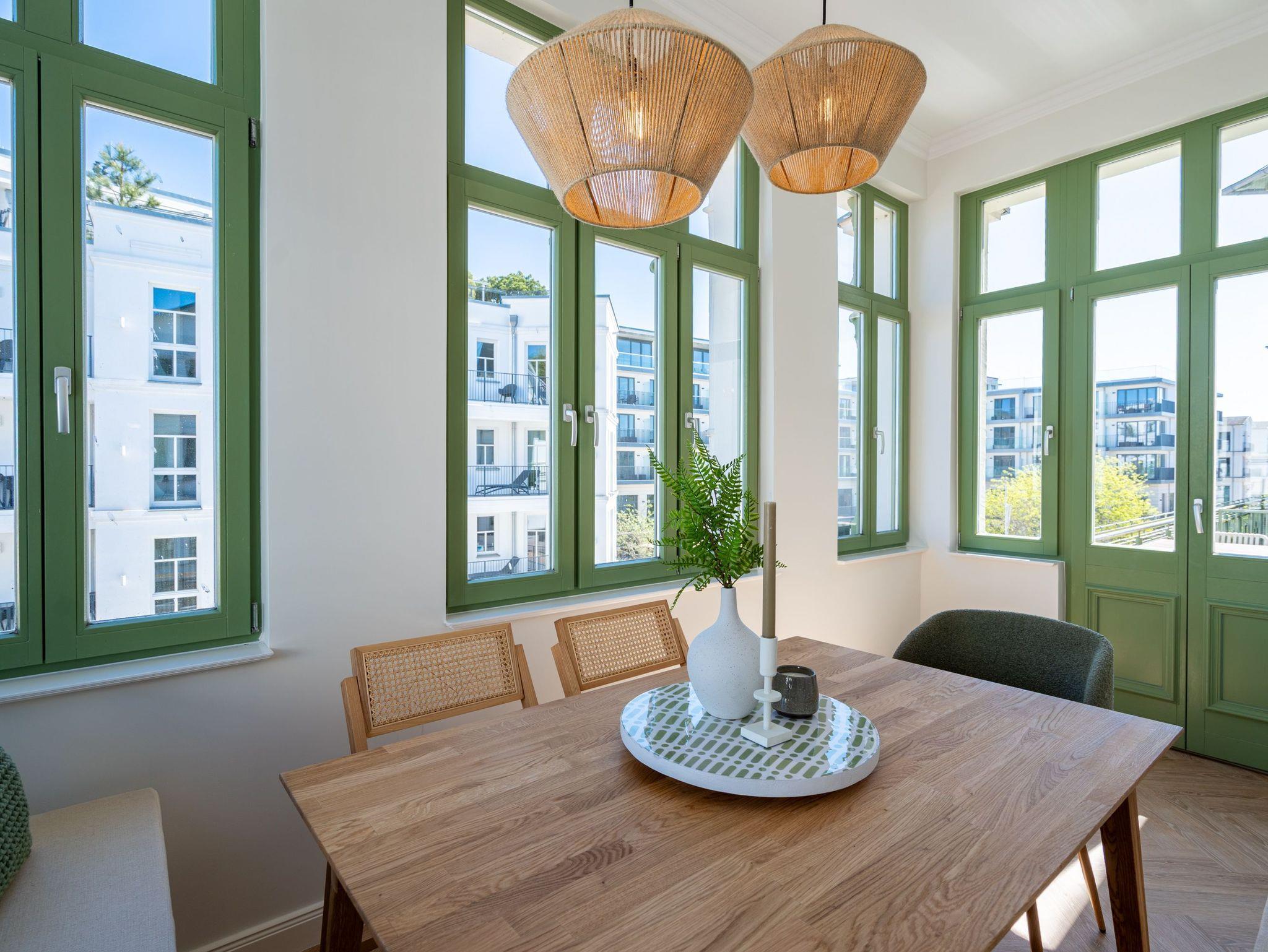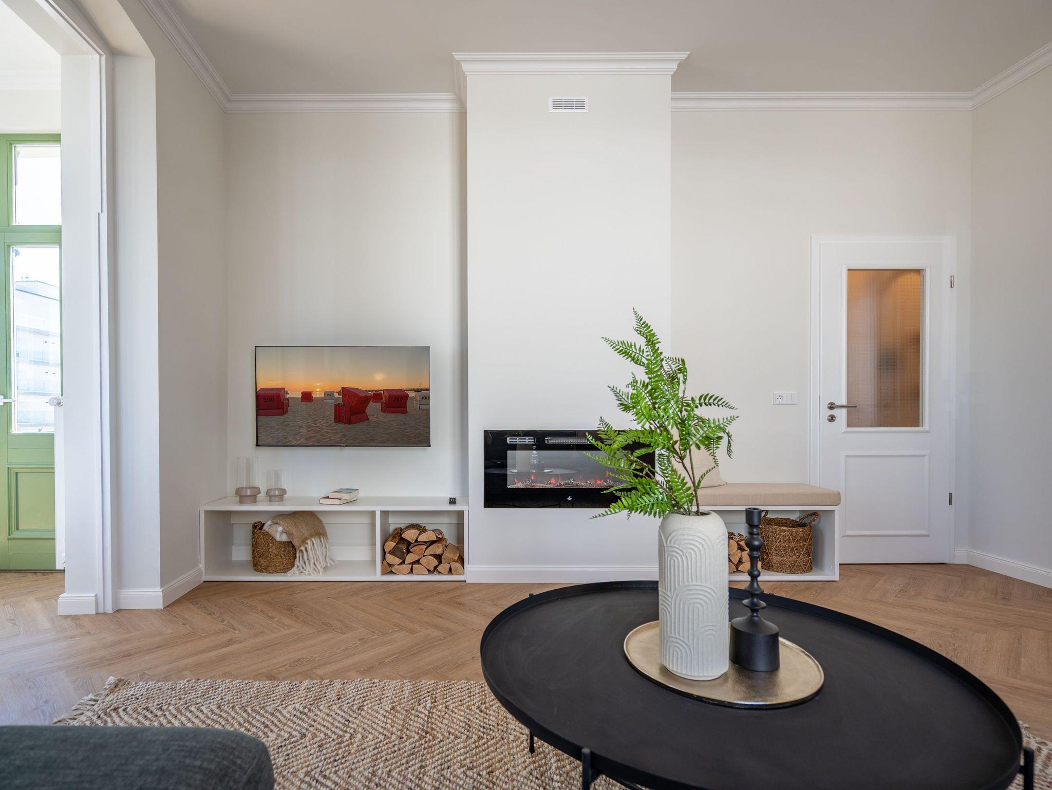 Das stilvolle 3-Raum-Appartement Nr. 13 in der Villa Frohsinn lädt mit großzügigen 70 qm Wohnfläche in der 2. Etage zum Entspannen und Genießen ein. Ideal geeignet für 4 Personen, bietet diese liebevoll eingerichtete Wohnung modernen Komfort und maritimen Charme. Der offene Wohnbereich empfängt Sie mit einer gemütlichen Sitzgruppe. Ein Flat-TV und ein stimmungsvoller Elektro-Kamin mit Fernbedienung sorgen auch an kühleren Abenden für wohlige Atmosphäre. Direkt angrenzend befindet sich die voll ausgestattete Küche mit allem, was Sie für eine bequeme Selbstverpflegung benötigen ? darunter ein moderner Induktionsherd, ein Mikrowellen-Kombigerät, Spülmaschine und ein Kühlschrank mit Gefrierfach. Ein besonderes Highlight ist die charmante Veranda mit Meerblick, auf der ein Esstisch mit Ecksitzbank zu gemütlichen Mahlzeiten einlädt. Von hier gelangen Sie auf den Nord-Balkon, der mit einem Tisch, vier Stühlen und zwei Sonnenliegen den idealen Ort zum Entspannen unter freiem Himmel bietet. Für erholsamen Schlaf sorgen zwei separate Schlafzimmer, jeweils ausgestattet mit komfortablen Boxspringdoppelbetten (1x 2,00 x 1,80 m / 1x 2,10 x 1,80 m), Kleiderschränken und eigenen Flat-TVs. In einem der Schlafzimmer findet zudem bei Bedarf ein Kinderreisebett (kostenpflichtig zubuchbar) Platz. Abgerundet wird das komfortable Wohnangebot durch zwei innenliegende Bäder, jeweils mit Dusche, WC und Waschtisch, sowie kostenfreiem WLAN und einem eigenen PKW-Außenstellplatz Nr. 13.