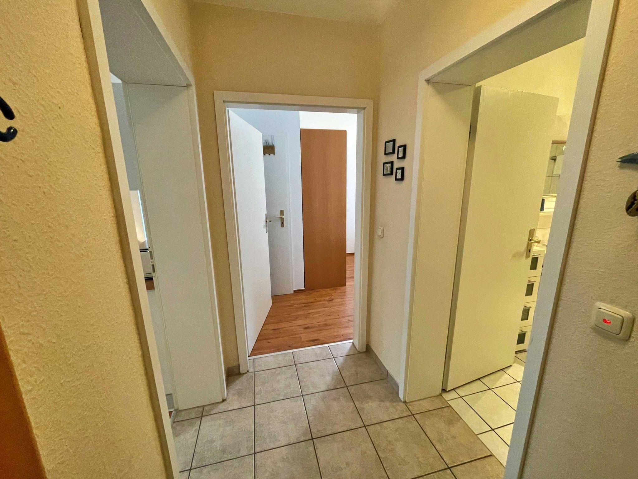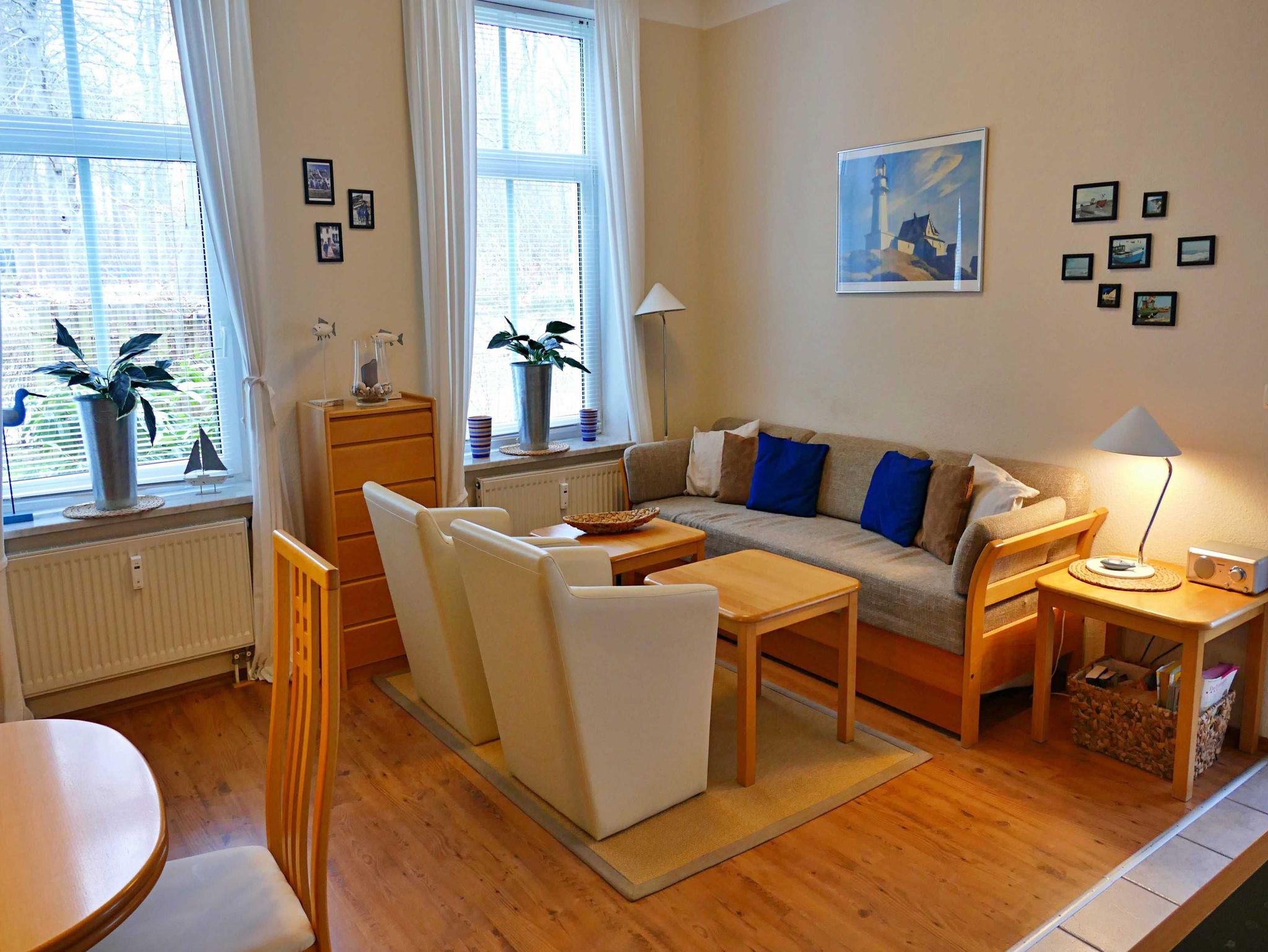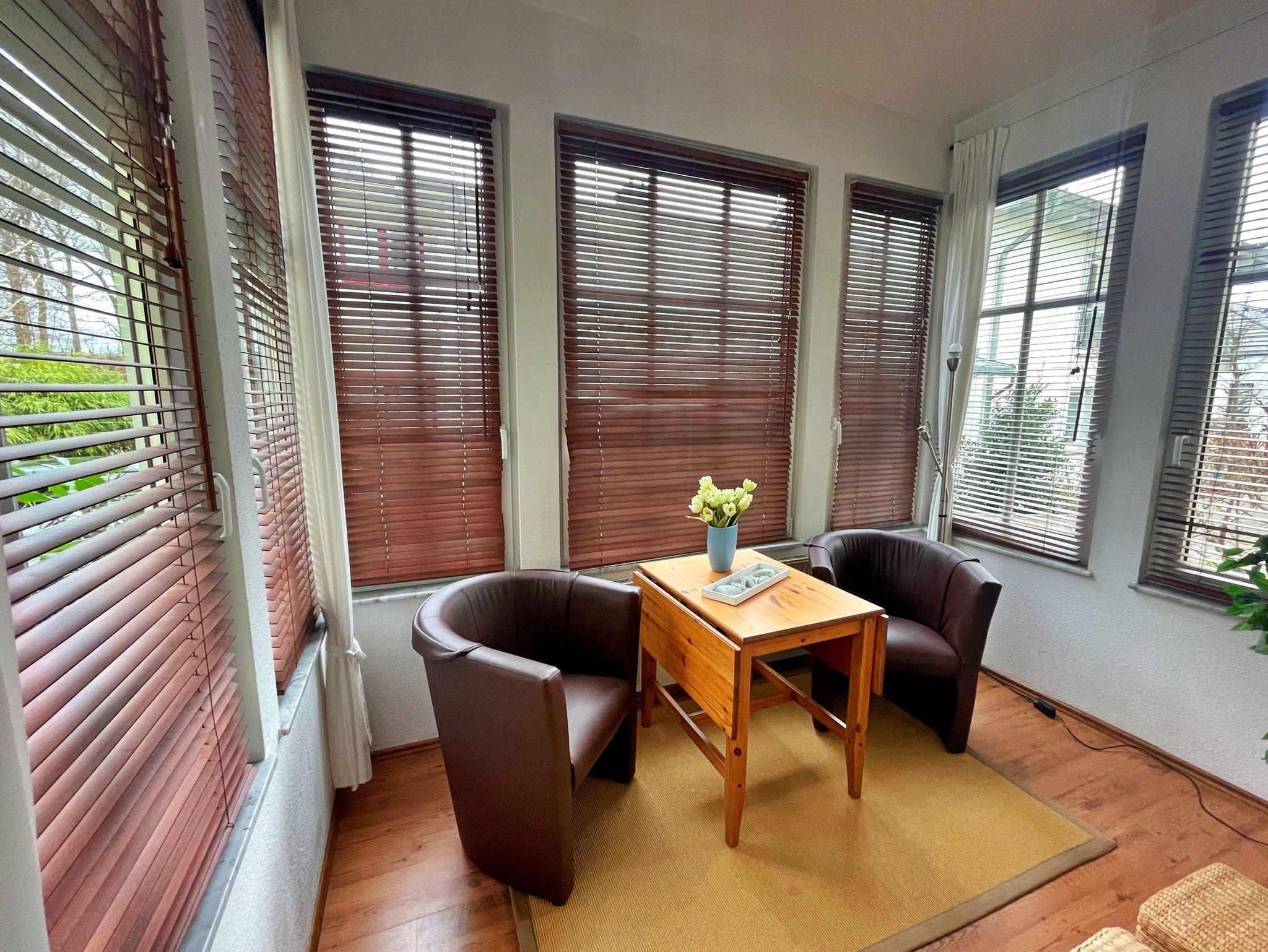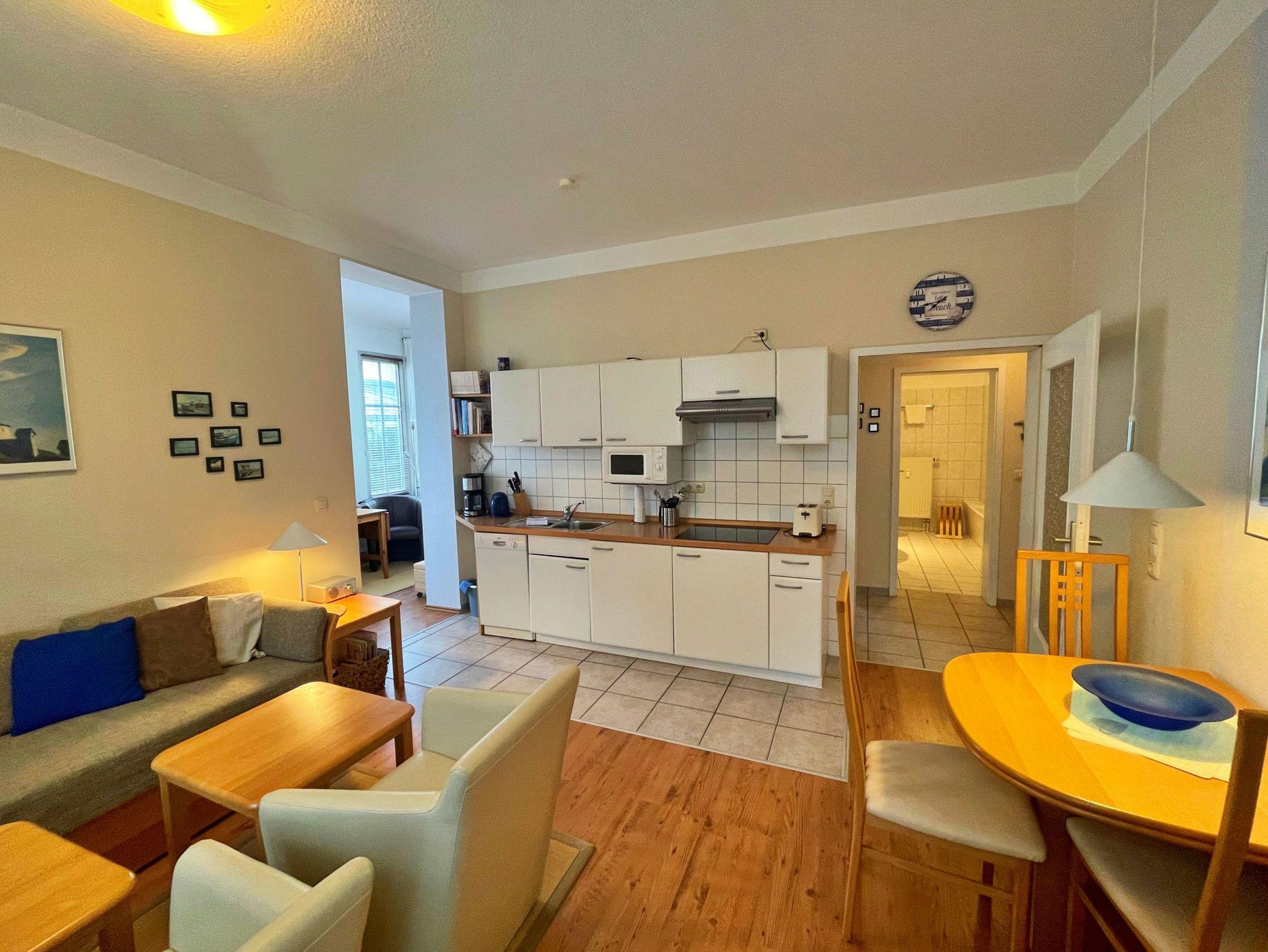 Die charmante 46 qm große Ferienwohnung befindet sich im Erdgeschoss des Hauses und bietet genügend Platz für 3 Personen, um einen erholsamen und gelungenen Urlaub zu verbringen. Der Wohnbereich mit angrenzender Veranda und das Schlafzimmer sind mit Laminatfußboden versehen. Im hellen Wohnzimmer befinden sich neben einer bequemen Couch, zwei Ledersessel mit Couchtisch sowie ein Esstisch mit 3 Stühlen, der genügend Platz bietet. Vom Wohnzimmer gelangen Sie in die Veranda, welche über eine gemütliche Sitzecke verfügt - perfekt für den ersten Kaffee am Morgen oder um den erlebnisreichen Tag bei einem Glas Wein ausklingen zu lassen. Die offene Küchenzeile ist mit Ceranherd, Spülmaschine, Kühlschrank, Mikrowelle, Kaffeemaschine, Toaster, Wasserkocher und Waffeleisen lässt keine Wünsche offen. Das Schlafzimmer verfügt über ein Doppelbett, welches für angenehmen Schlafkomfort sorgt. Das Bad mit Badewanne, Dusche und WC rundet das Wohlfühlangebot. Natürlich ist kostenfreies WLAN inklusive. Ihren Pkw können Sie in der Tiefgarage parken und Ihre eigenen Räder ganz praktisch im Fahrradkeller unterstellen. Im Keller befinden sich Waschmaschinen und Trockner, die gegen eine Gebühr nutzbar sind.