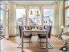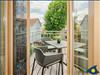 Die großen Fenster lassen viel Tageslicht in alle Räume. Die Veranda beherbergt den Essplatz und dient zudem als Zugang zum Balkon. Die Terrasse mit Gartenmöbeln lädt zum Entspannen ein.