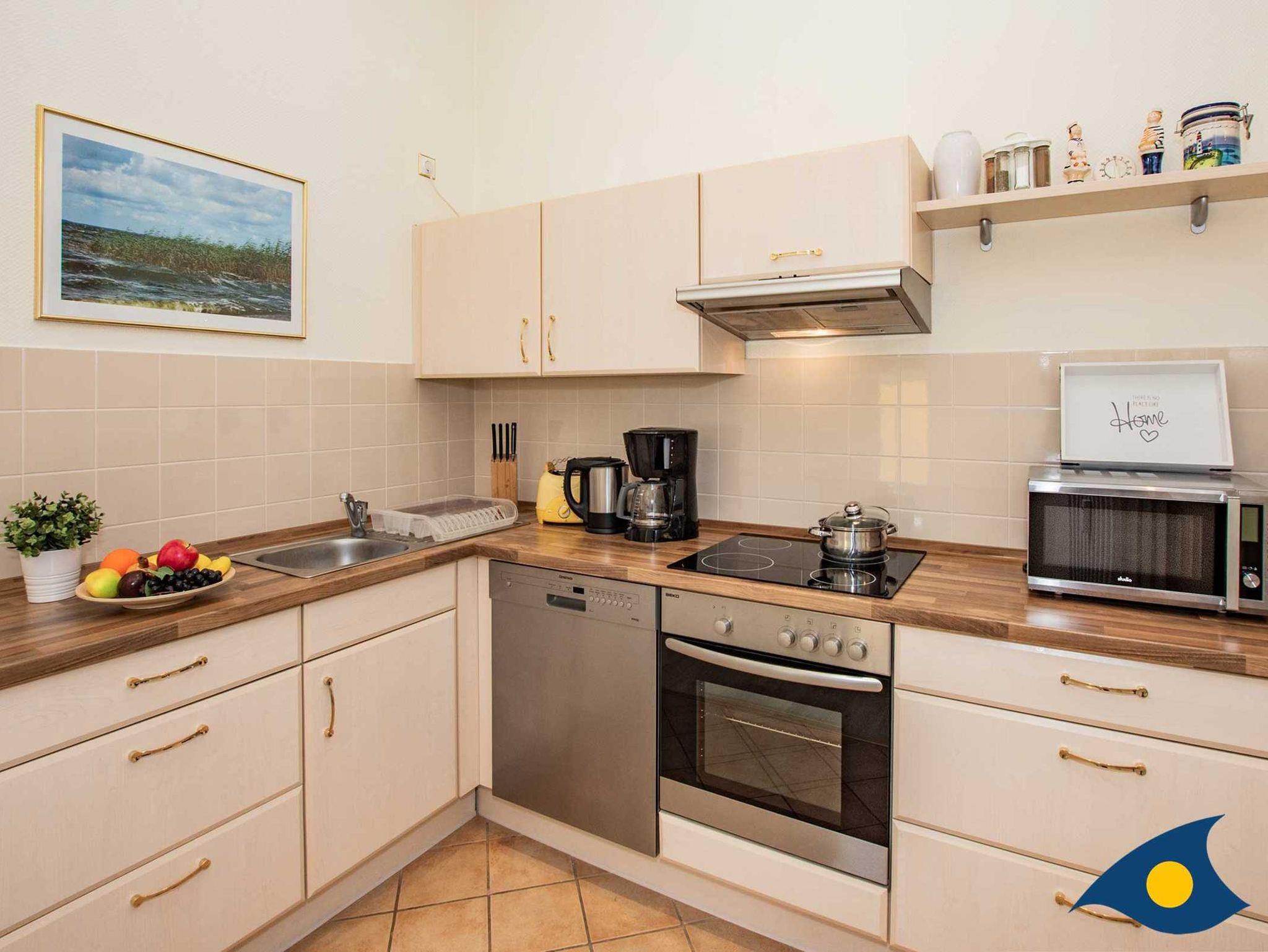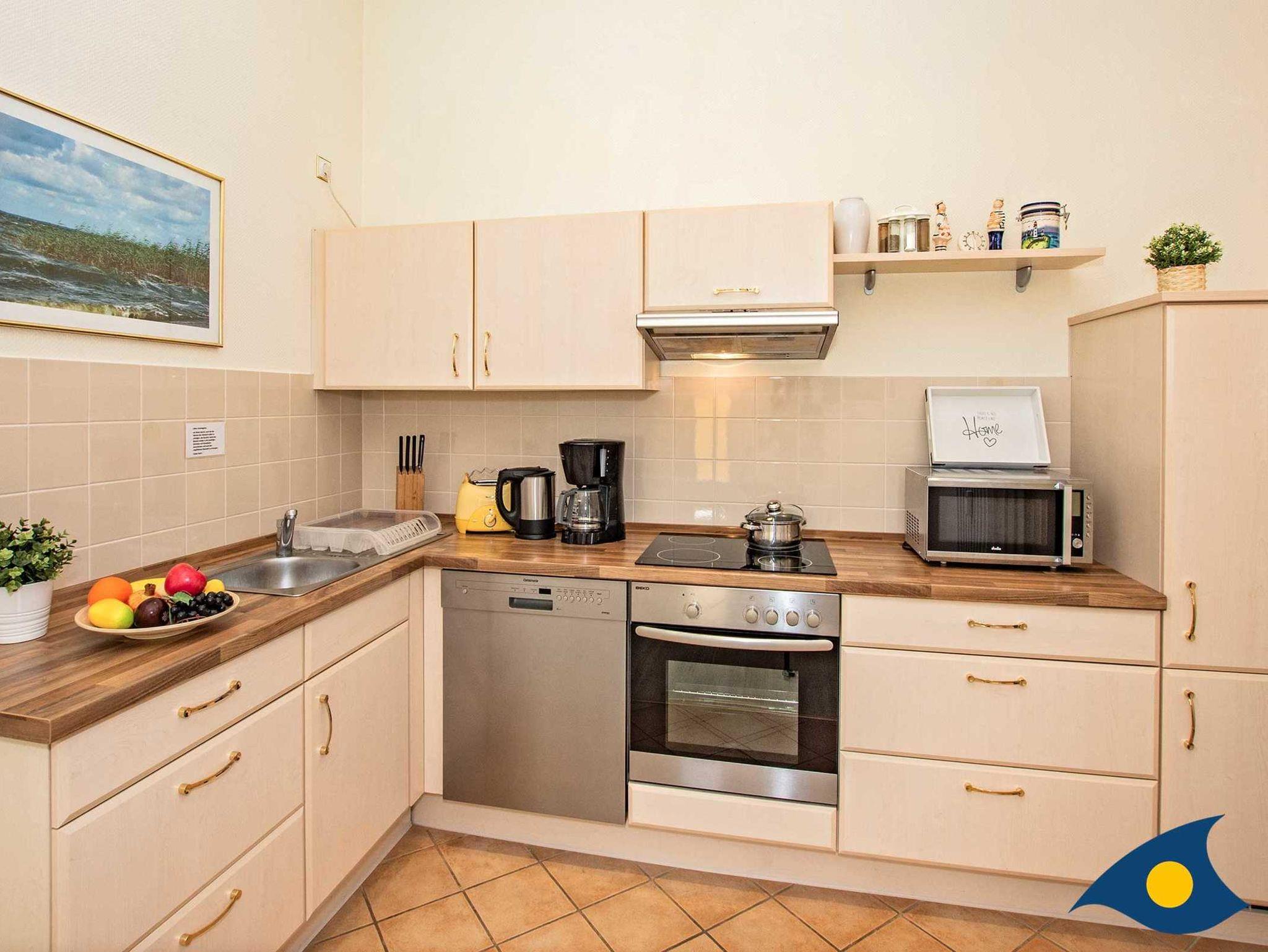 Die Wohnung ist gemütlich und modern eingerichtet, der offene Kochbereich im Wohnzimmer mit der zeitgemäßen Einbauküche inkl. aller Geräte (Herd mit 4-Platten Ceran-Kochfeld und Backofen, Kühlschrank mit separatem Gefrierfach, Mikrowelle, Spüle und Spülmaschine) bietet beste Voraussetzungen für eine eventuell beabsichtigte Selbstverpflegung.