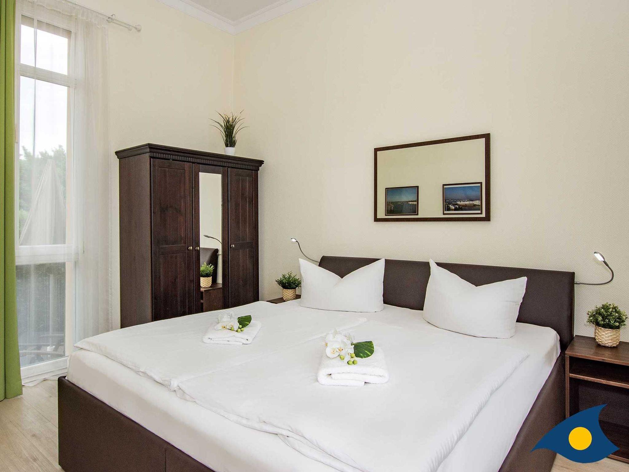 Im Schlafzimmer steht Ihnen u. a. ein Polster-Doppelbett (Liegefläche ca. 1,80 m × 2,00 m) mit hochwertigen Matratzen, Toppern und höhenverstellbaren Lattenrosten für eine behagliche und entspannende Nachtruhe zur Verfügung.