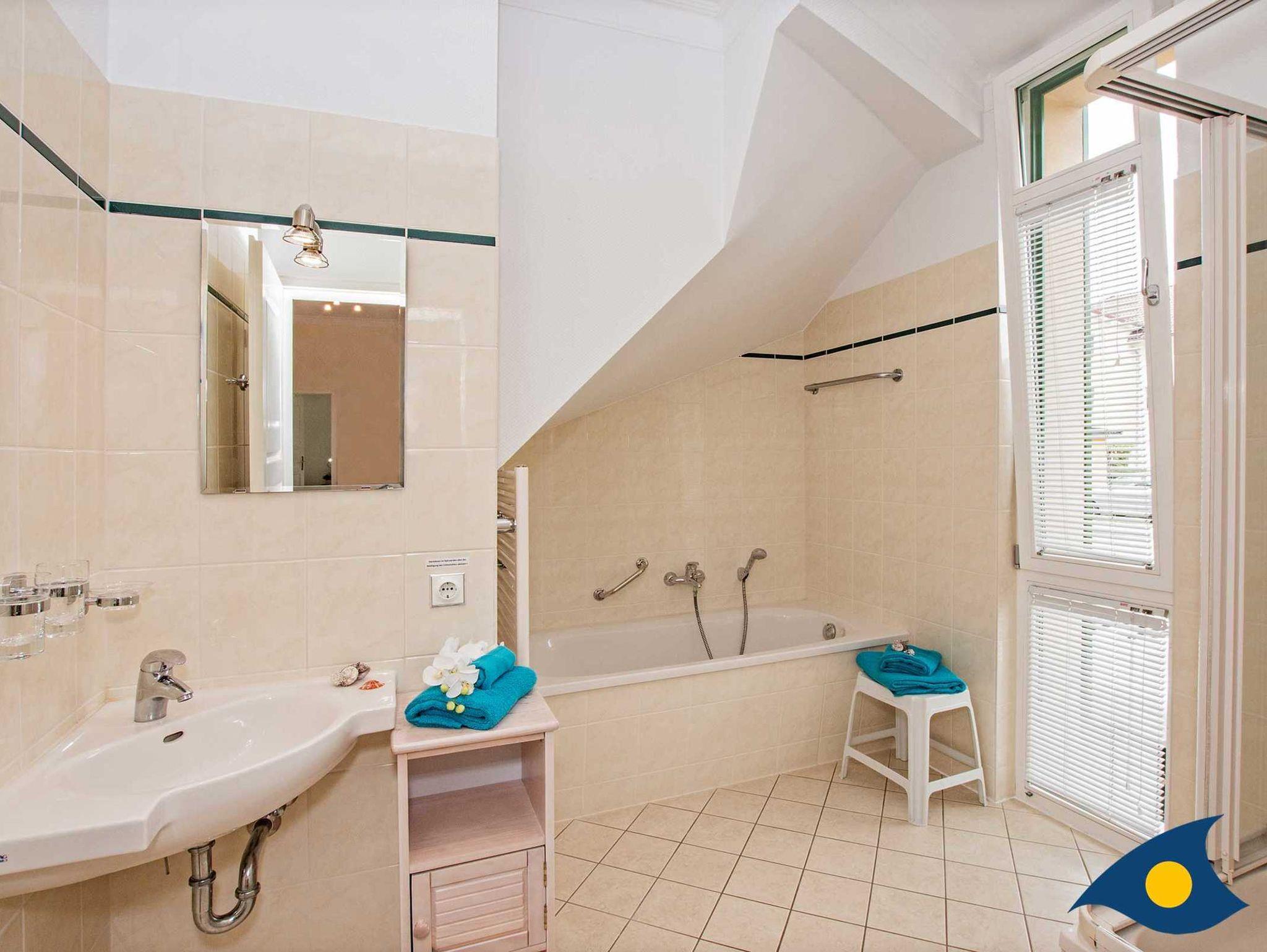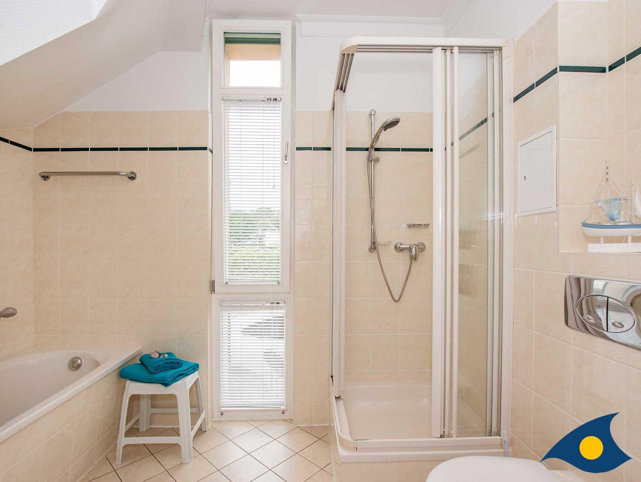 Das komfortable Bad/WC mit Fenster verfügt über eine Badewanne und eine Dusche.